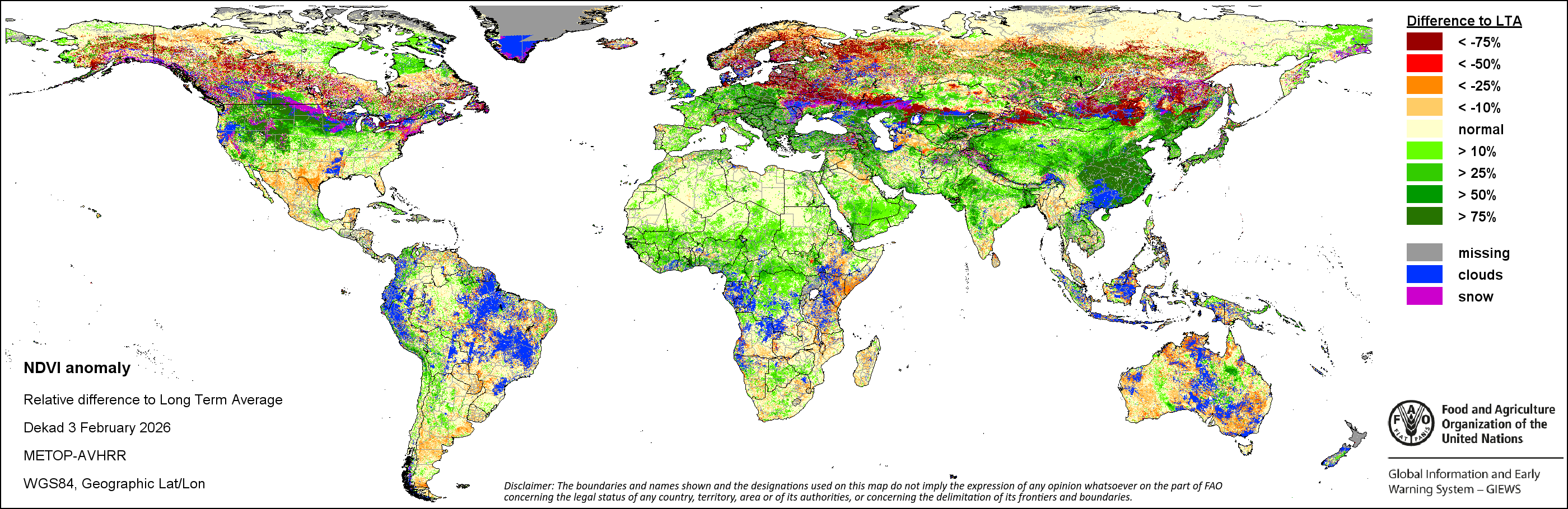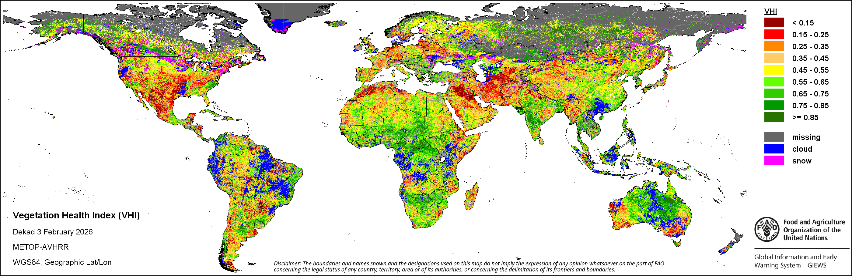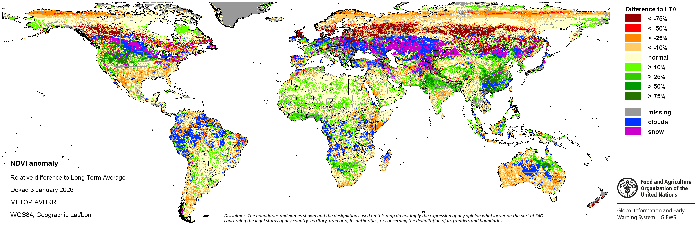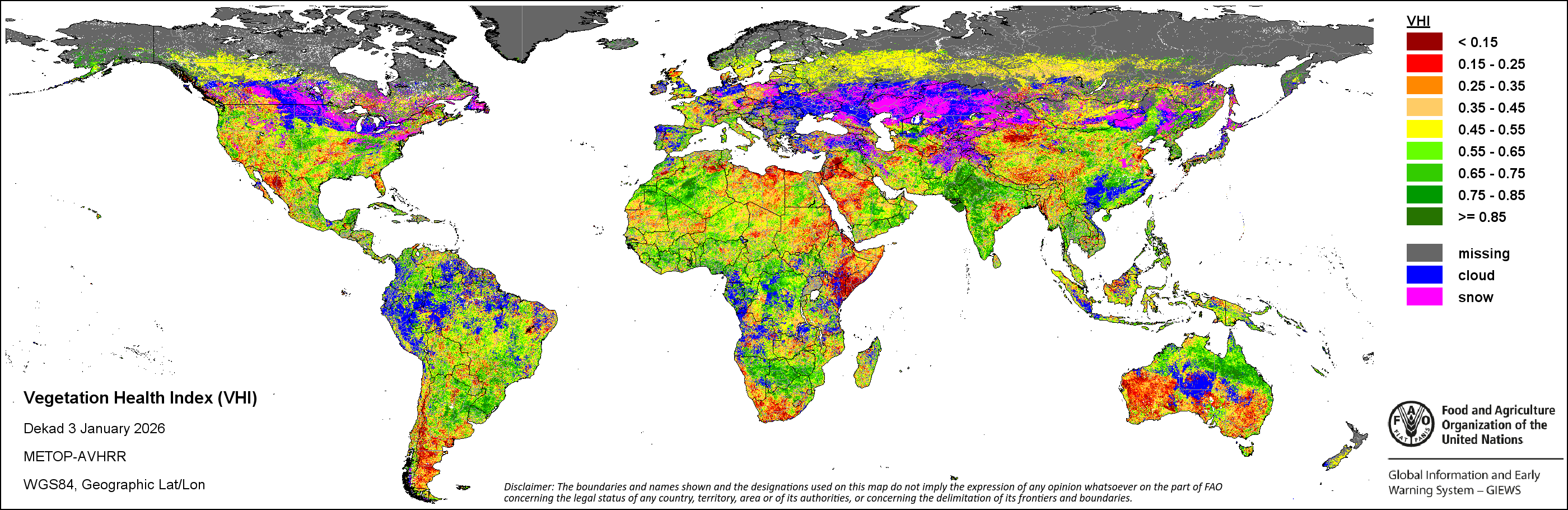 Global Information and Early Warning System on Food and Agriculture (GIEWS) monitors the condition of major foodcrops across the globe to assess production prospects. To support the analysis and supplement ground-based information, GIEWS utilizes remote sensing data that can provide a valuable insight on water availability and vegetation health during the cropping seasons. In addition to rainfall estimates and the Normalized Difference Vegetation Index (NDVI), GIEWS and FAO's OCB Division have developed the Agricultural Stress Index (ASI), a quick-look indicator for the early identification of agricultural areas probably affected by dry spells, or drought in extreme cases.