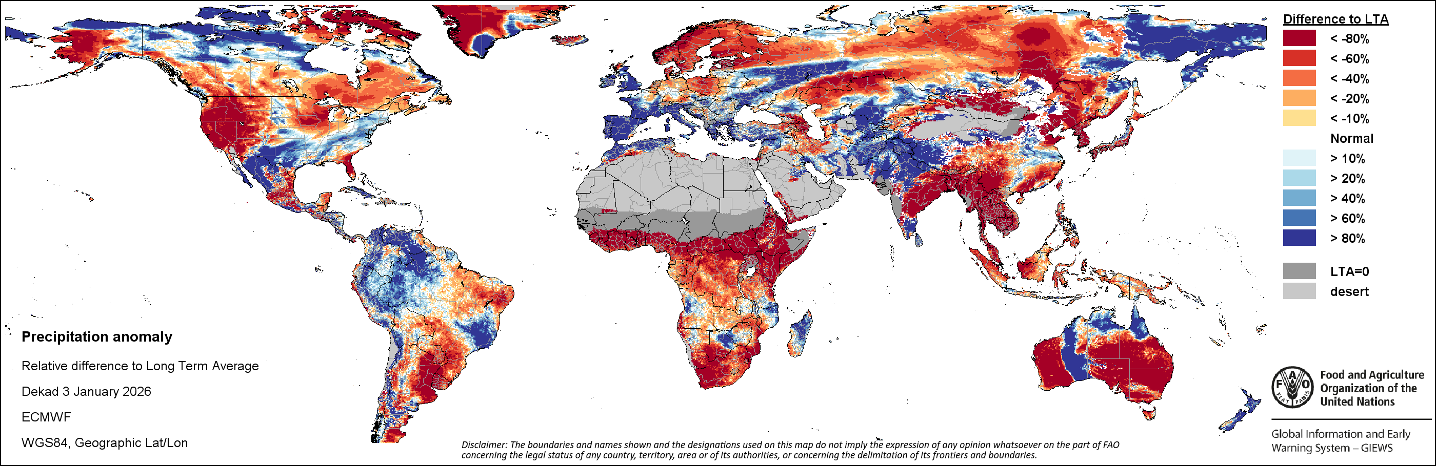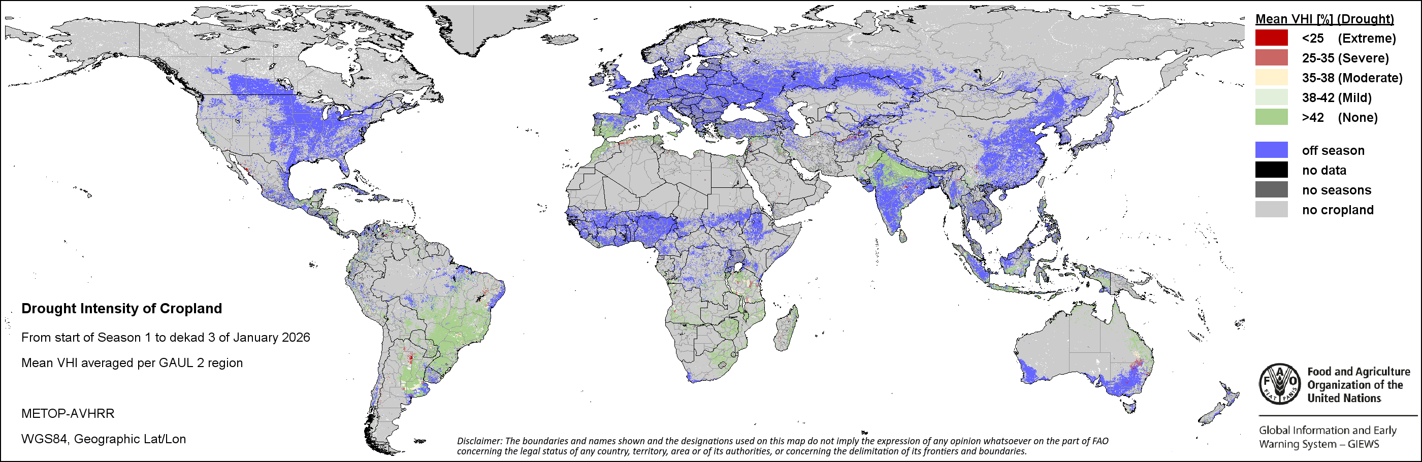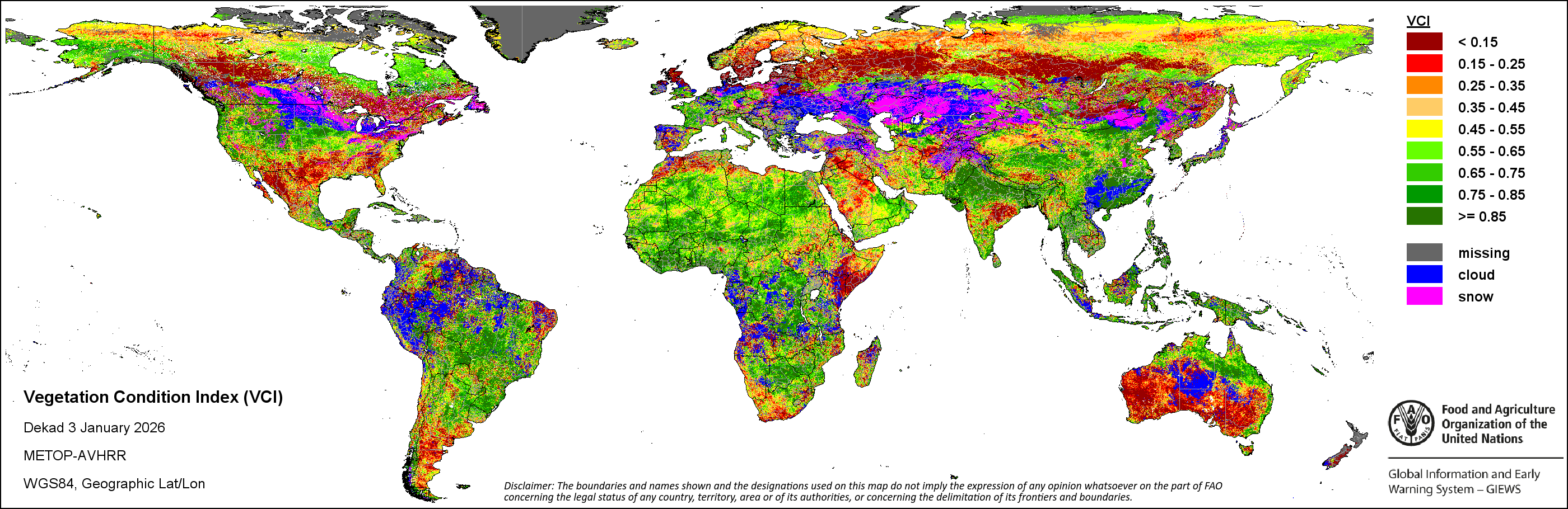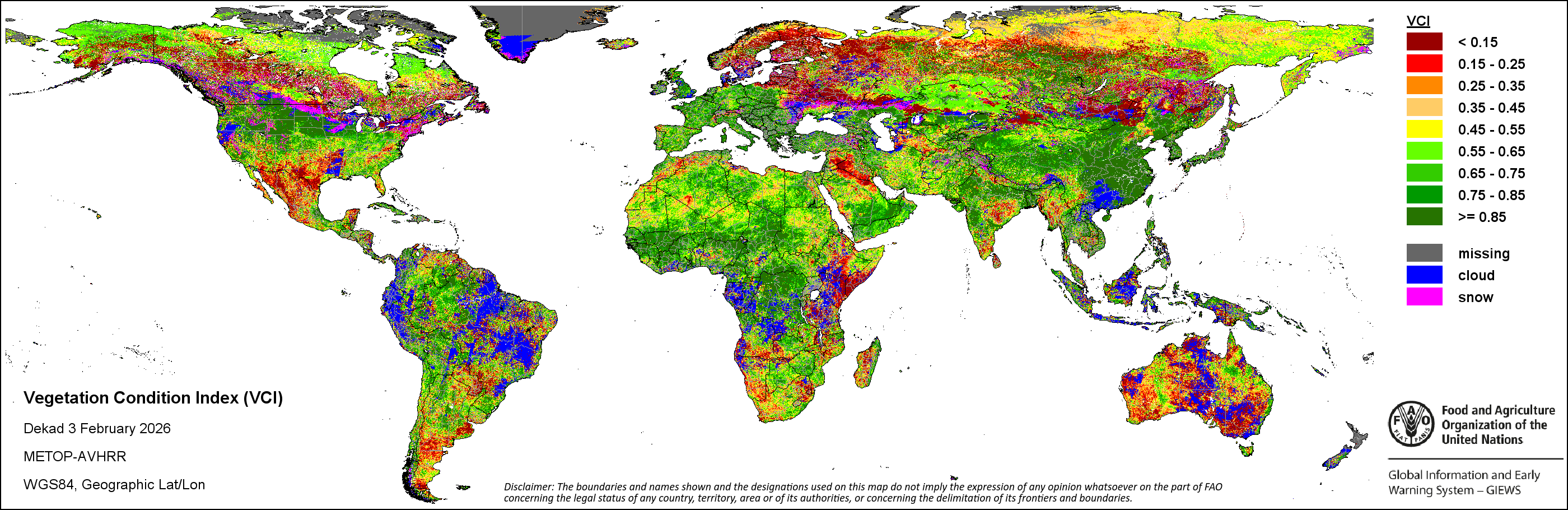 Global Information and Early Warning System on Food and Agriculture (GIEWS) monitors the condition of major foodcrops across the globe to assess production prospects. To support the analysis and supplement ground-based information, GIEWS utilizes remote sensing data that can provide a valuable insight on water availability and vegetation health during the cropping seasons. In addition to rainfall estimates and the Normalized Difference Vegetation Index (NDVI), GIEWS and FAO's OCB Division have developed the Agricultural Stress Index (ASI), a quick-look indicator for the early identification of agricultural areas probably affected by dry spells, or drought in extreme cases.