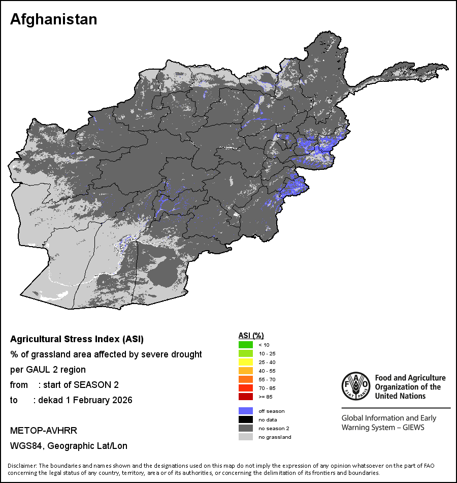 El Índice de Estrés Agrícola (ASI, por sus siglas en inglés) es un indicador que facilita la identificación temprana de tierras cultivadas con alta probabilidad de estrés hídrico (sequía) de un vistazo rápido. El Índice de Estrés Agrícola (ASI) integra el Índice de Salud de la Vegetación (VHI, por sus siglas en inglés) en dos dimensiones fundamentales para evaluar un episodio de sequía en la agricultura: la temporal y la espacial. El primer paso para calcular el ASI consiste en determinar la media temporal del VHI, evaluando la intensidad y duración de los períodos secos que se producen durante el ciclo de cultivo a nivel de píxel; este cálculo incluye la utilización de coeficientes del cultivo, que introducen la sensibilidad de éste al estrés hídrico durante cada fase fenológica. El segundo paso radica en determinar la extensión espacial de las sequías calculando el porcentaje de píxeles en zonas cultivables con un VHI por debajo del 35 por ciento (una investigación anterior -Kogan, 1995- identificó este valor como umbral crítico para evaluar el alcance de una sequía). Cada zona administrativa se clasifica en función del porcentaje de superficie afectada por la sequía para facilitar una interpretación rápida de los resultados.