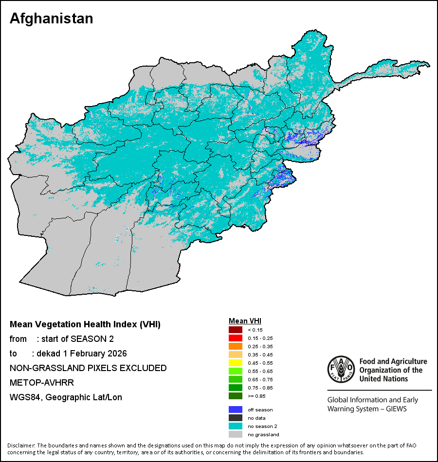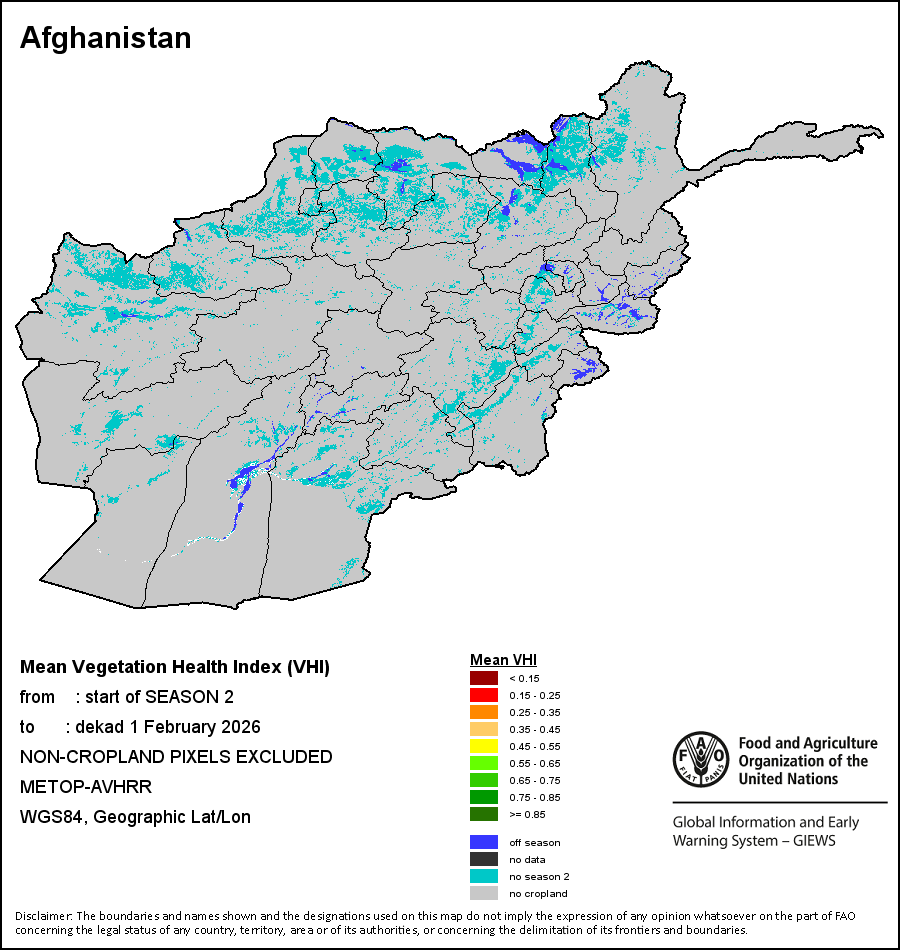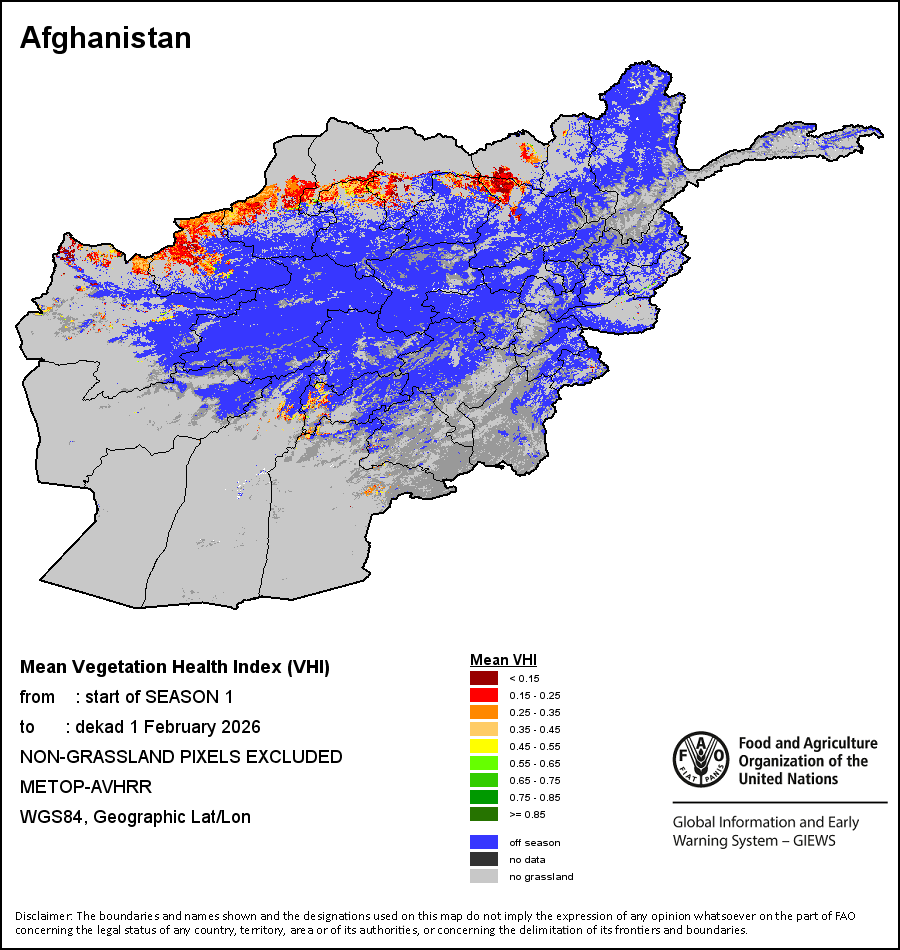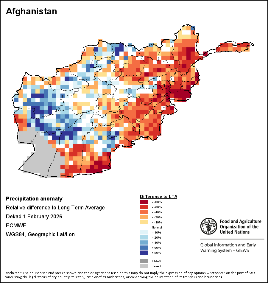 El Índice Normalizado Diferencial de la Vegetación (NDVI, por sus siglas en inglés) mide el “verdor” de la cubierta vegetal, y se utiliza como indicador de la densidad y salud de la vegetación. Los valores del NDVI oscilan entre +1 y -1. Los valores positivos elevados corresponden a vegetación densa y saludable, mientras que los valores bajos y/o negativos reflejan condiciones deficientes de vegetación o cubierta vegetal escasa. La anomalía del NDVI representa la variación del periodo actual de 10 días con respecto al valor medio a largo plazo. Un valor positivo (por ejemplo, 20 por ciento) implicaría mejores condiciones de vegetación con respecto a la media, mientras que un valor negativo (por ejemplo, -40 por ciento) indicaría condiciones de vegetación comparativamente peores.