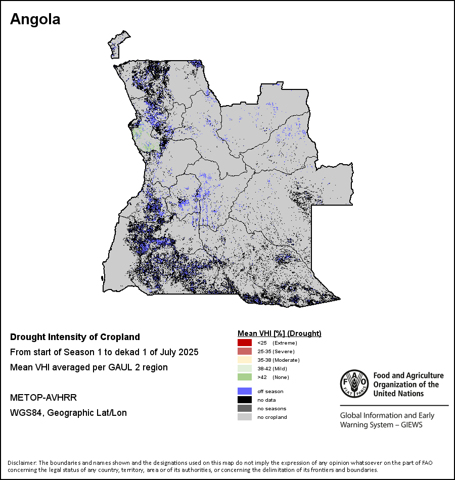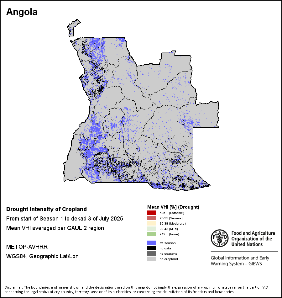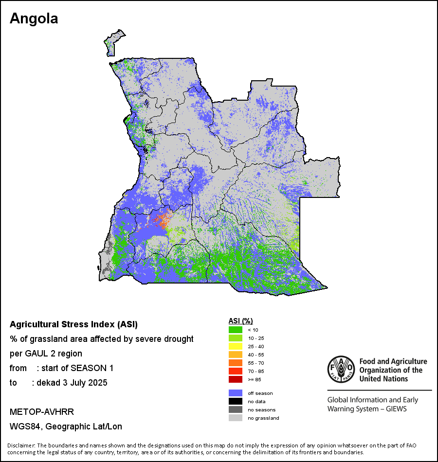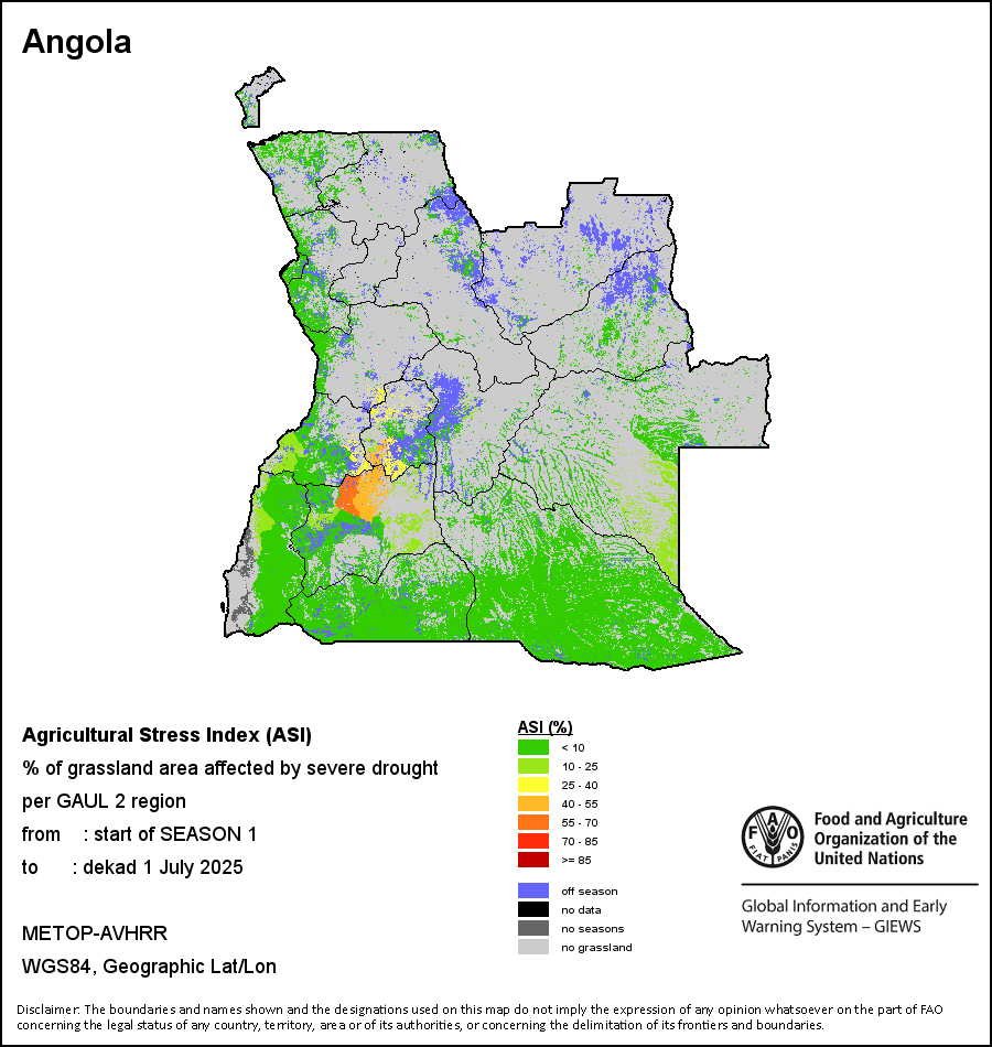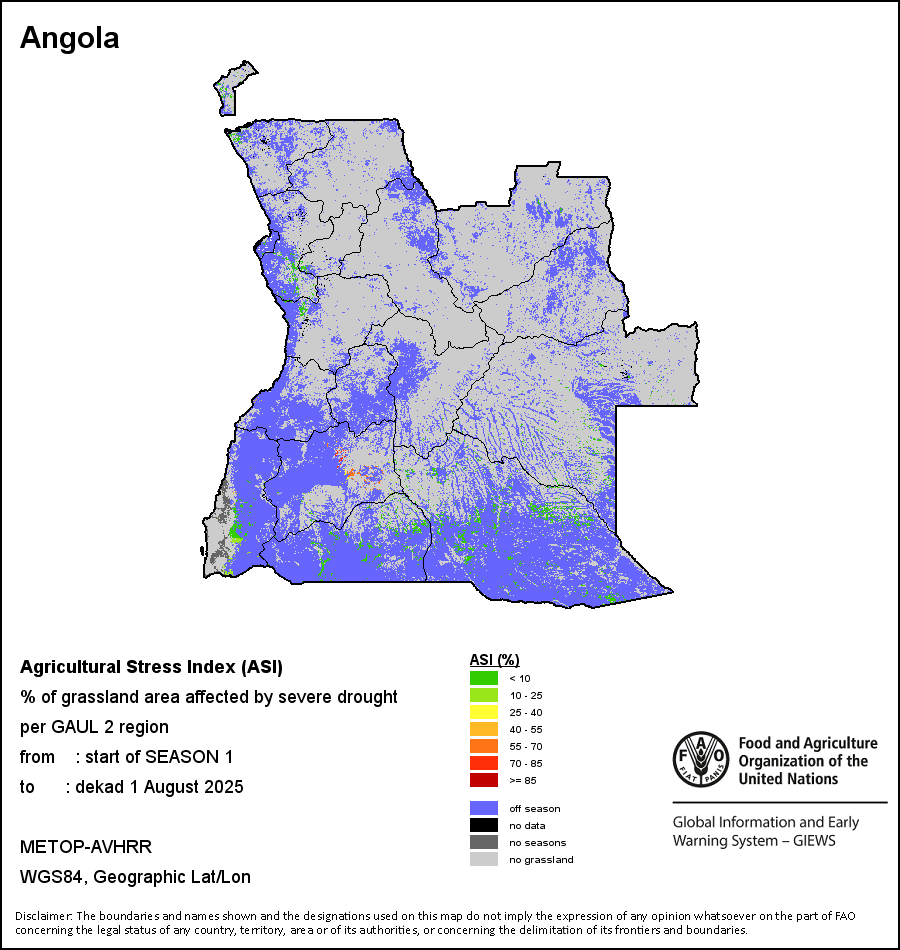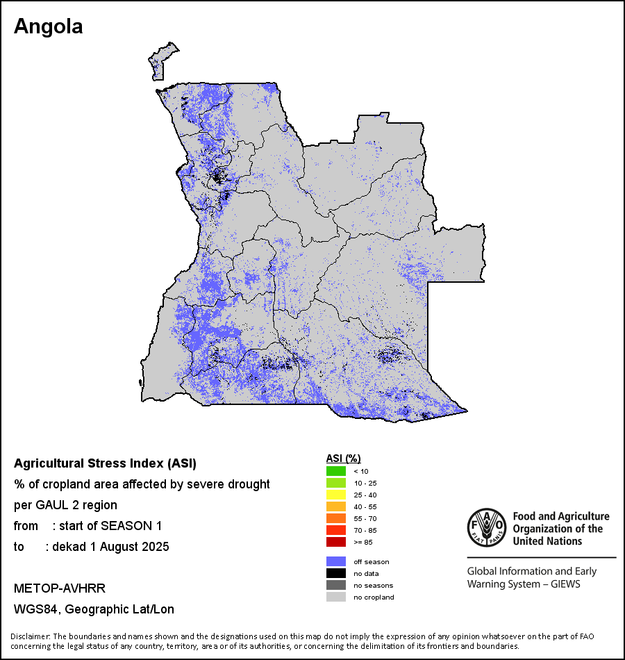 The Agricultural Stress Index (ASI) is a quick-look indicator that facilitates the early identification of cropped land with a high likelihood of water stress (drought). The Index is based on the integration of the Vegetation Health Index (VHI) in two dimensions that are critical in the assessment of a drought event in agriculture: temporal and spatial. The first step of the ASI calculation is a temporal averaging of the VHI, assessing the intensity and duration of dry periods occurring during the crop cycle at the pixel level; this calculation includes the use of crop coefficients, which introduces sensitivity of a crop to water stress during each phenological phase. The second step determines the spatial extent of drought events by calculating the percentage of pixels in arable areas with a VHI value below 35 percent (this value was identified as a critical threshold in assessing the extent of drought in previous research by Kogan, 1995). Each administrative area is classified according to the percentage of the affected area to facilitate the quick interpretation of results.