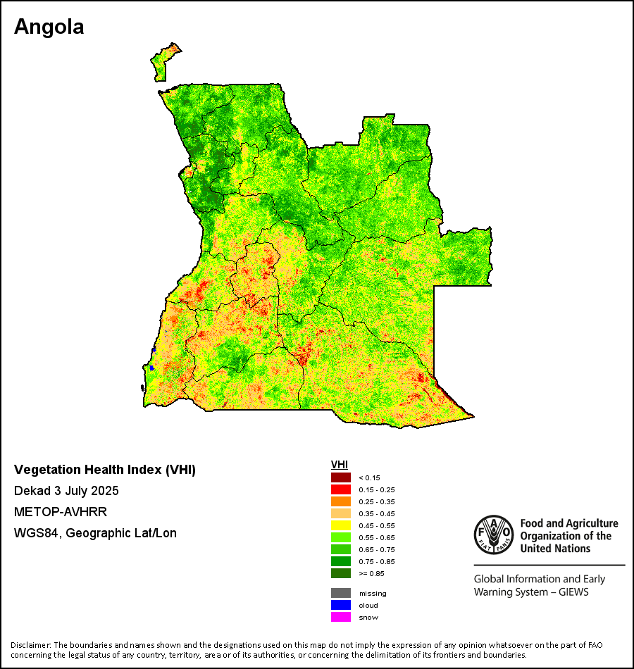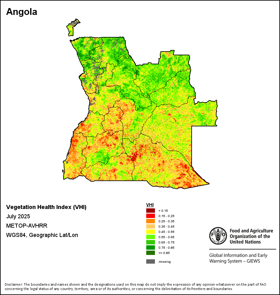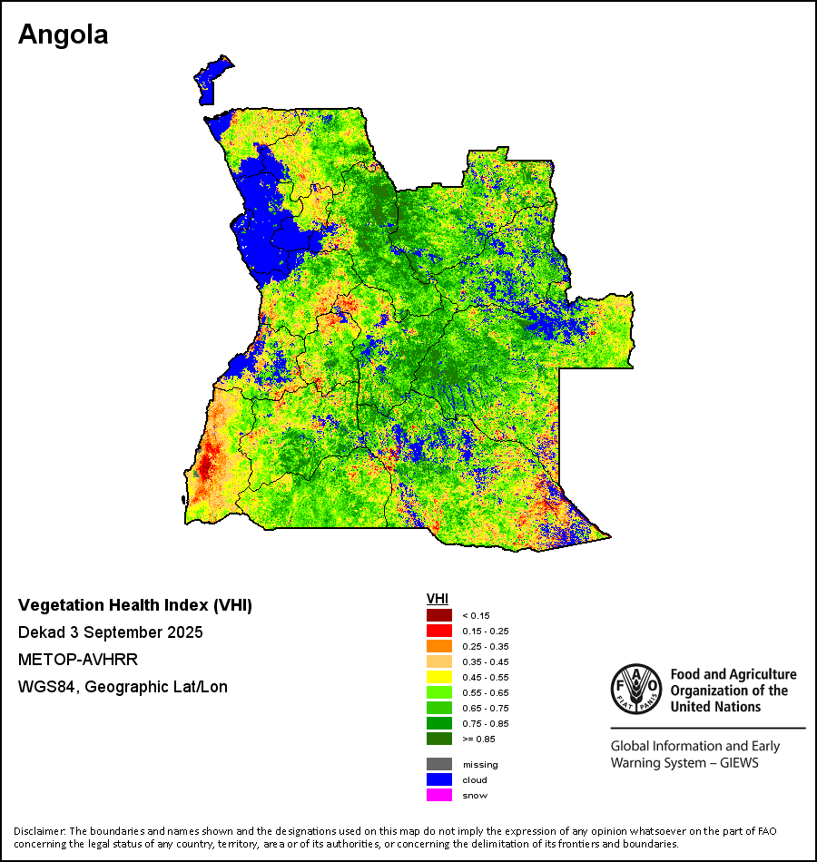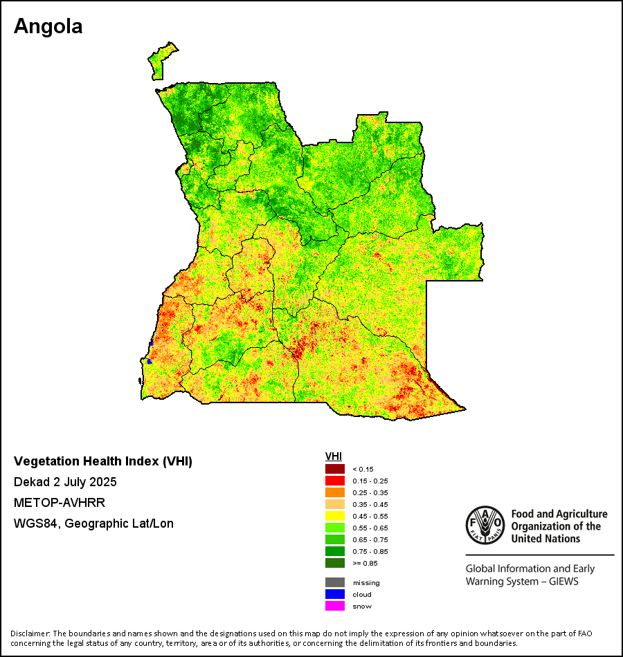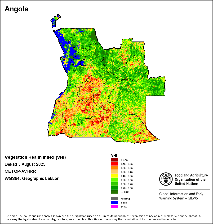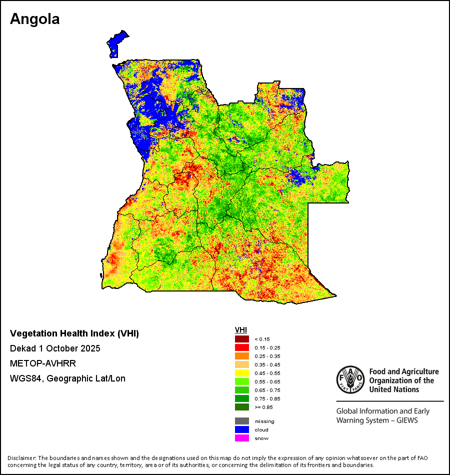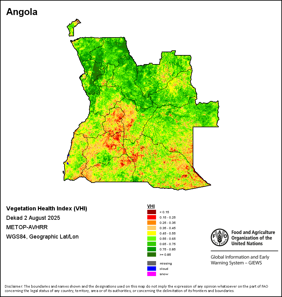 The Vegetation Health Index (VHI) illustrates the severity of drought based on the vegetation health and the influence of temperature on plant conditions. The VHI is a composite index and the elementary indicator used to compute the ASI. It combines both the Vegetation Condition Index (VCI) and the Temperature Condition Index (TCI). The TCI is calculated using a similar equation to the VCI, but relates the current temperature to the long-term maximum and minimum , as it is assumed that higher temperatures tend to cause a deterioration in vegetation conditions. A decrease in the VHI would, for example, indicate relatively poor vegetation conditions and warmer temperatures, signifying stressed vegetation conditions, and over a longer period would be indicative of drought. The VHI images are computed for the two main seasons and in three modalities: dekadal, monthly and annual.