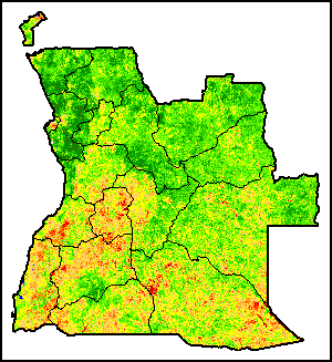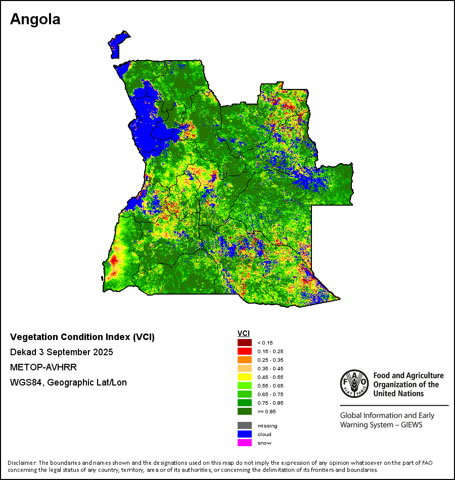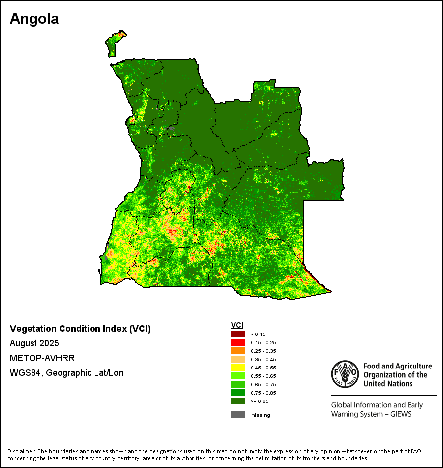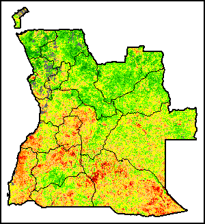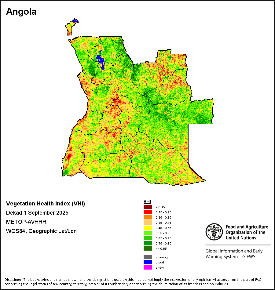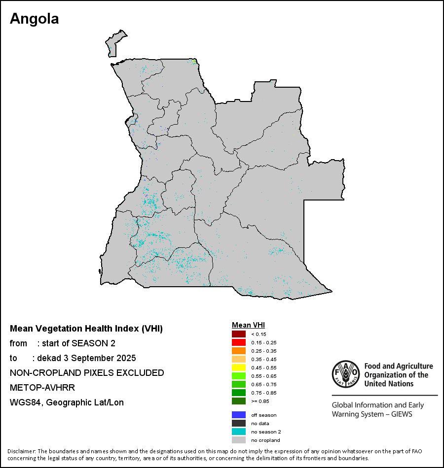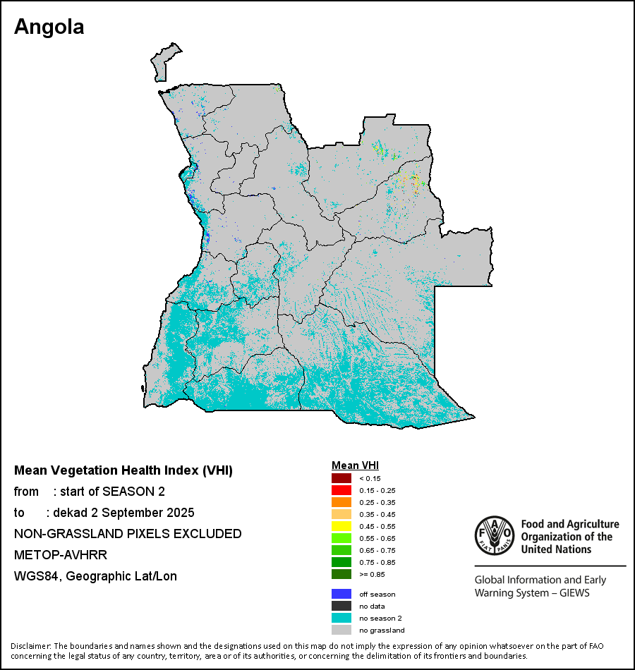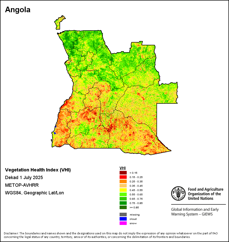 The Vegetation Health Index (VHI) illustrates the severity of drought based on the vegetation health and the influence of temperature on plant conditions. The VHI is a composite index and the elementary indicator used to compute the ASI. It combines both the Vegetation Condition Index (VCI) and the Temperature Condition Index (TCI). The TCI is calculated using a similar equation to the VCI, but relates the current temperature to the long-term maximum and minimum , as it is assumed that higher temperatures tend to cause a deterioration in vegetation conditions. A decrease in the VHI would, for example, indicate relatively poor vegetation conditions and warmer temperatures, signifying stressed vegetation conditions, and over a longer period would be indicative of drought. The VHI images are computed for the two main seasons and in three modalities: dekadal, monthly and annual.