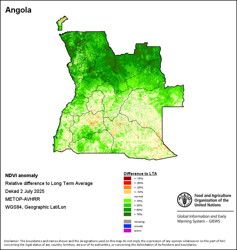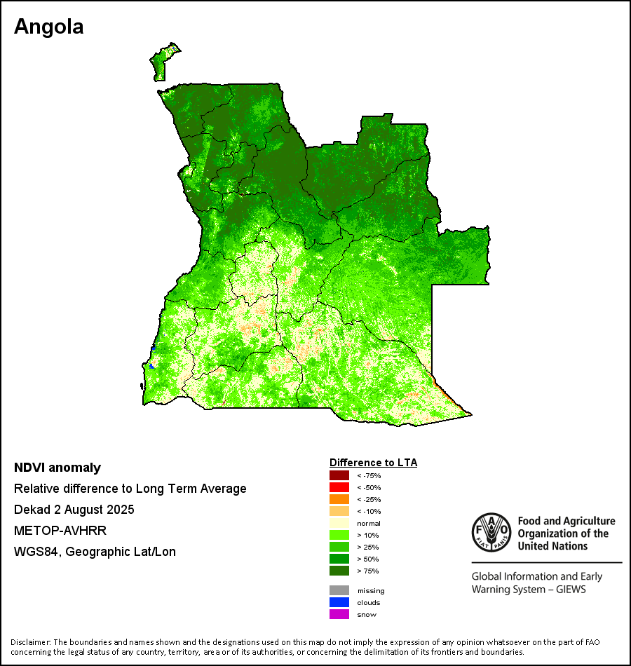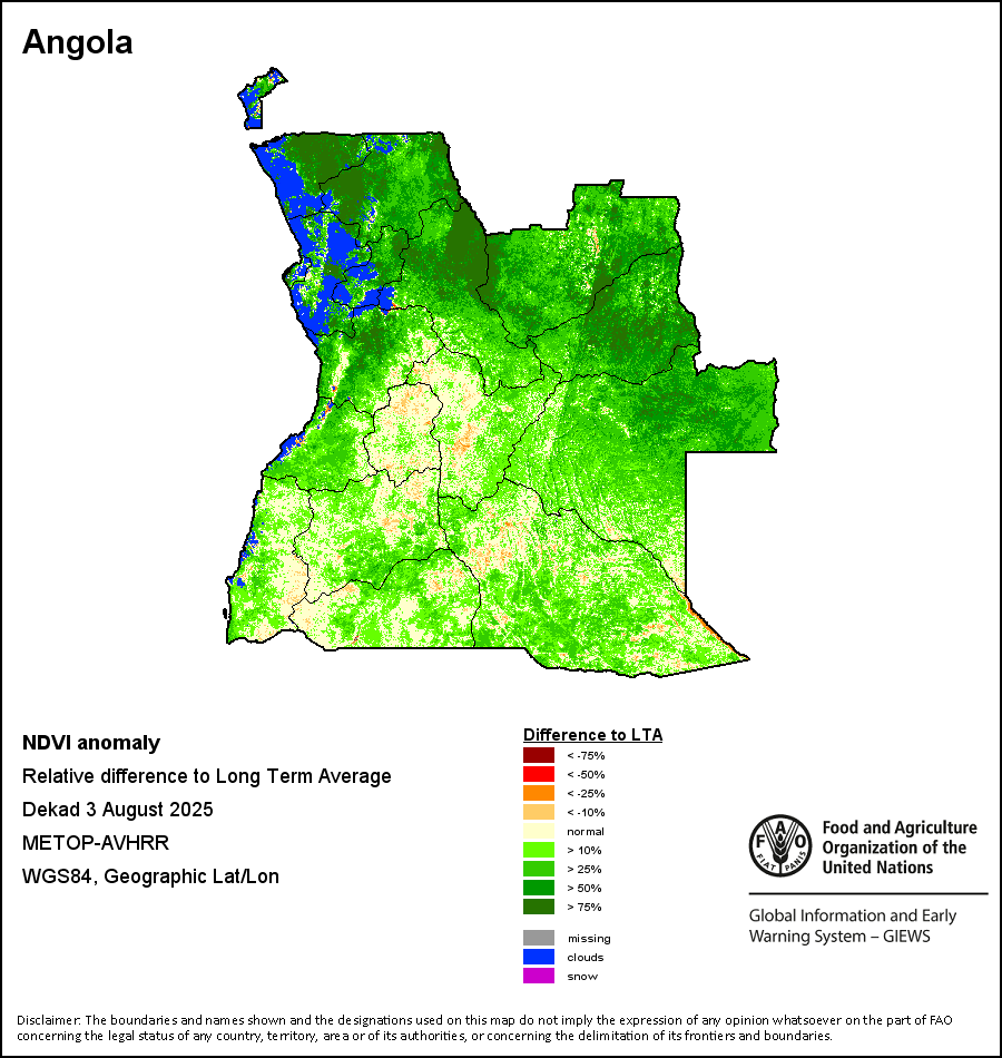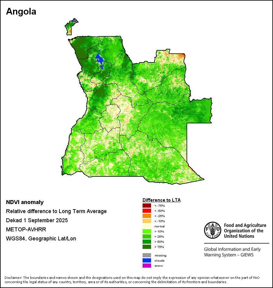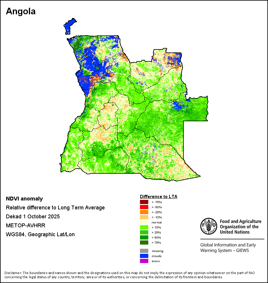 The Normalized Difference Vegetation Index (NDVI) measures the “greenness” of ground cover and is used as a proxy to indicate the density and health of vegetation. NDVI values range from +1 to -1, with high positive values corresponding to dense and healthy vegetation, and low and/or negative NDVI values indicating poor vegetation conditions or sparse vegetative cover. The NDVI anomaly indicates the variation of the current dekad to the long-term average, where a positive value (for example 20 percent) would signify enhanced vegetation conditions compared to the average, while a negative value (for instance -40 percent) would indicate comparatively poor vegetation conditions.