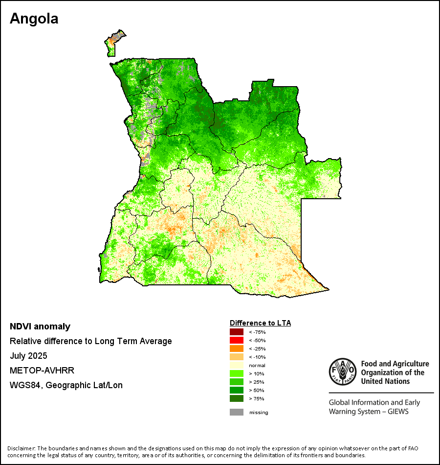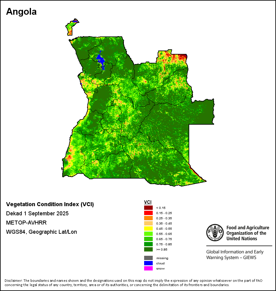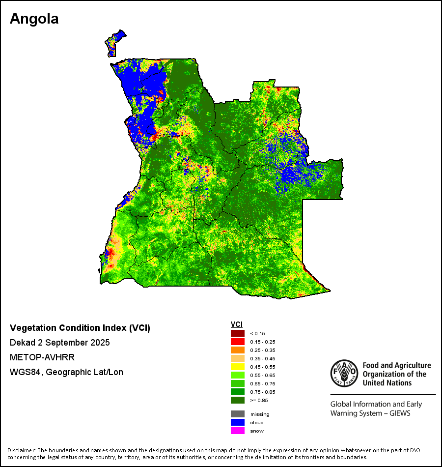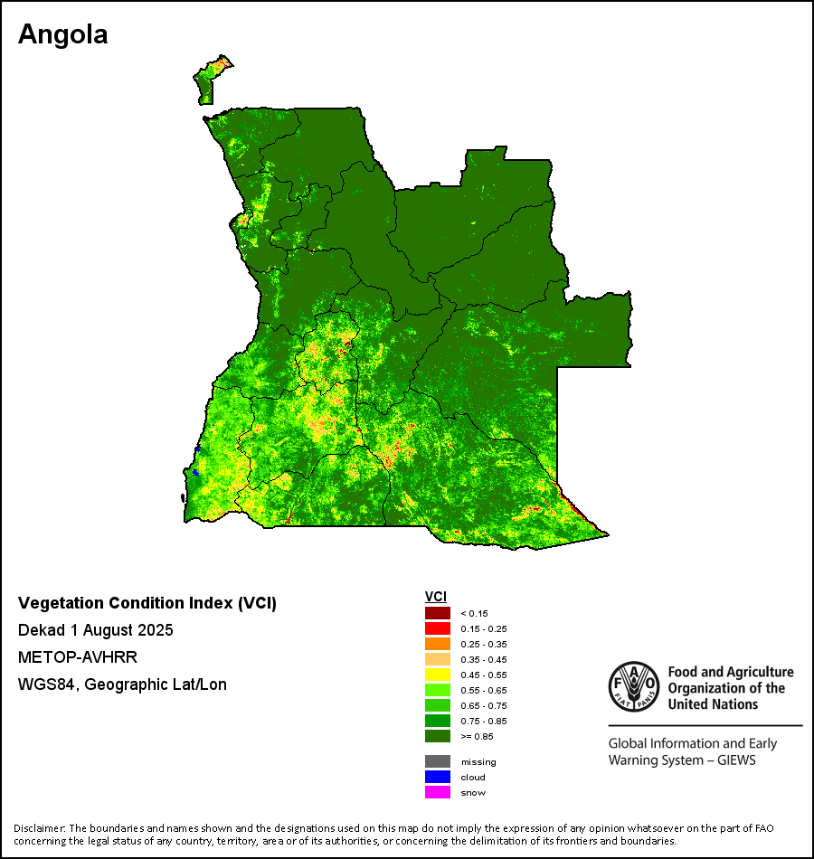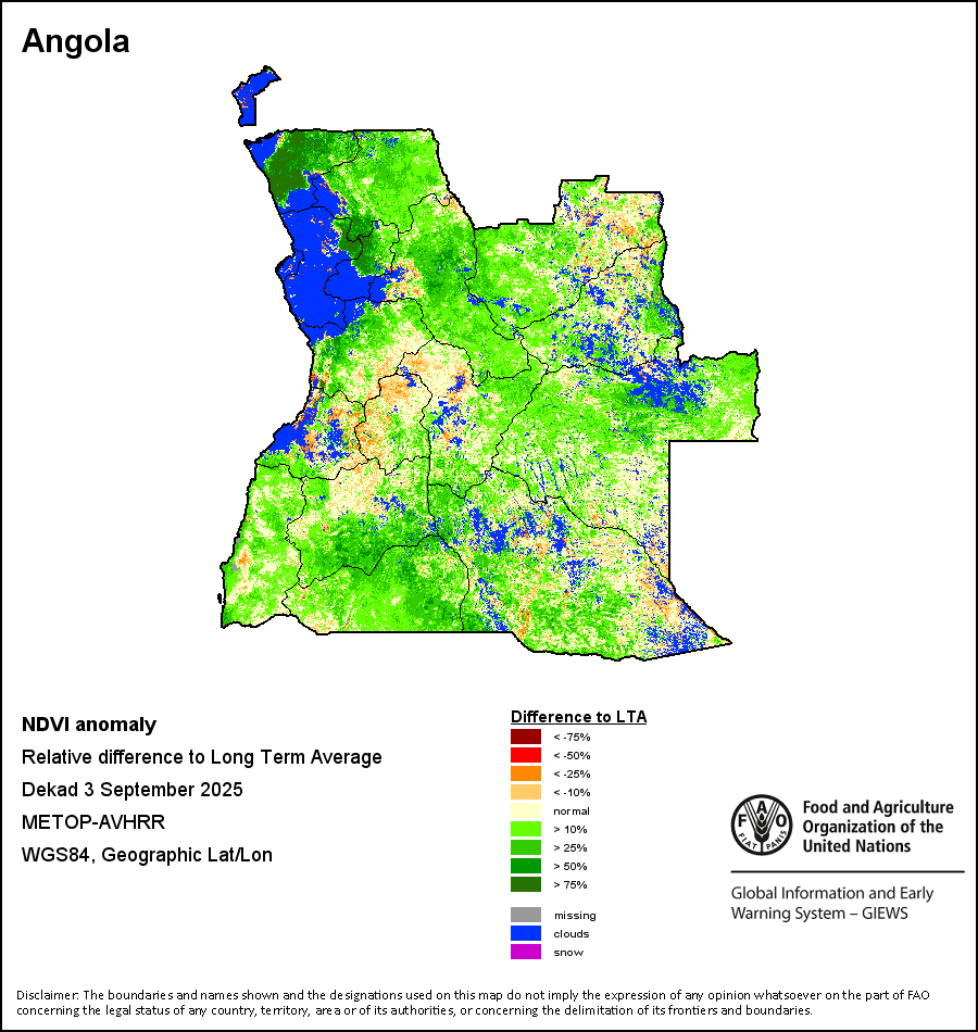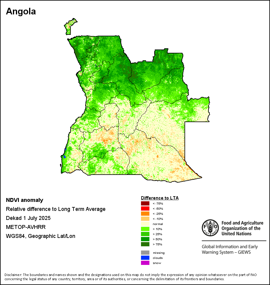 The Normalized Difference Vegetation Index (NDVI) measures the “greenness” of ground cover and is used as a proxy to indicate the density and health of vegetation. NDVI values range from +1 to -1, with high positive values corresponding to dense and healthy vegetation, and low and/or negative NDVI values indicating poor vegetation conditions or sparse vegetative cover. The NDVI anomaly indicates the variation of the current dekad to the long-term average, where a positive value (for example 20 percent) would signify enhanced vegetation conditions compared to the average, while a negative value (for instance -40 percent) would indicate comparatively poor vegetation conditions.