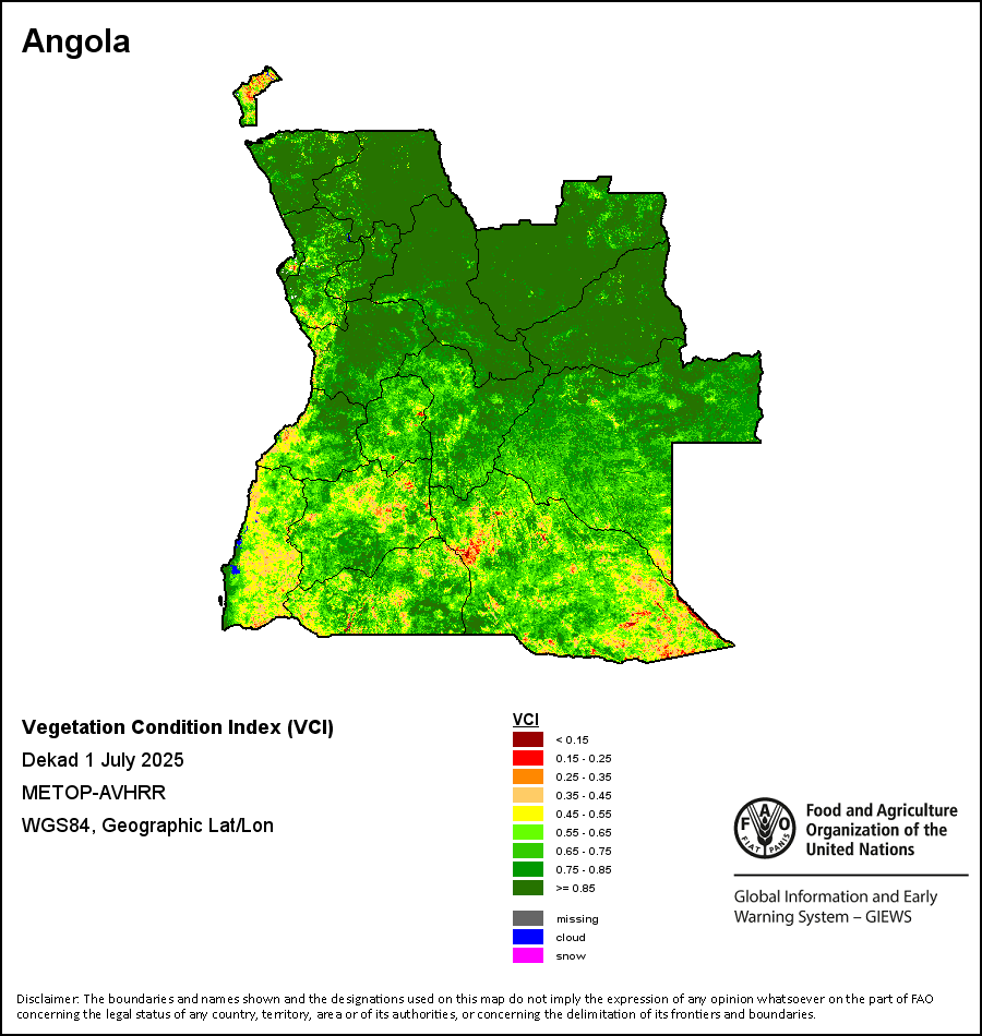 The Vegetation Condition Index (VCI) evaluates the current vegetation health in comparison to the historical trends. The VCI relates current dekadal Normalized Difference Vegetation Index (NDVI) to its long-term minimum and maximum, normalized by the historical range of NDVI values for the same dekad. The VCI was designed to separate the weather-related component of the NDVI from the ecological element.