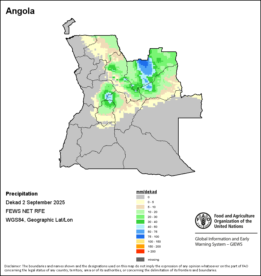 The map depicts cumulative rainfall volumes over a dekad (a 10-day period). Precipitation estimates for all African countries (except Cabo Verde and Mauritius) are taken from NOAA/FEWSNet, while for the remaining countries data is obtained from ECMWF.