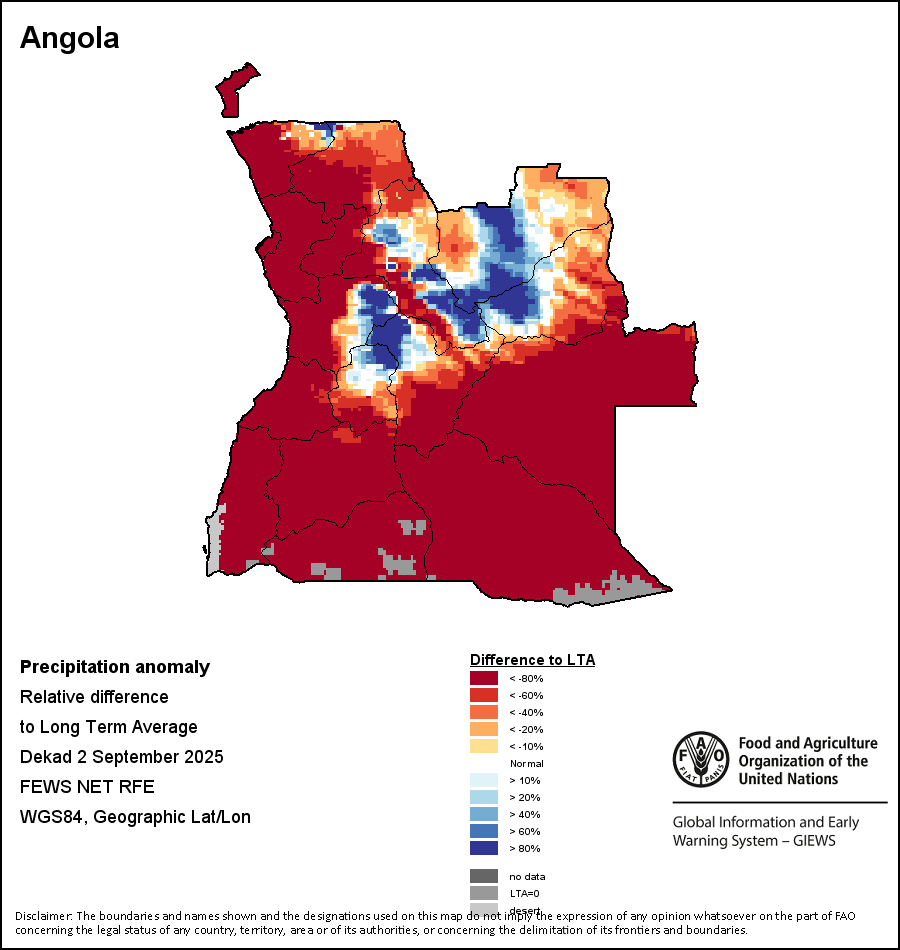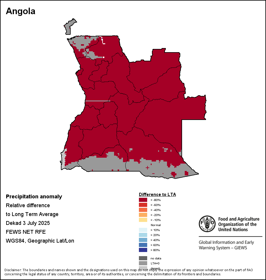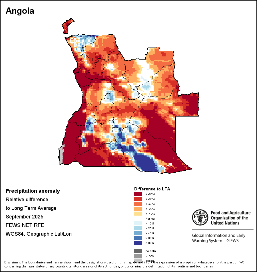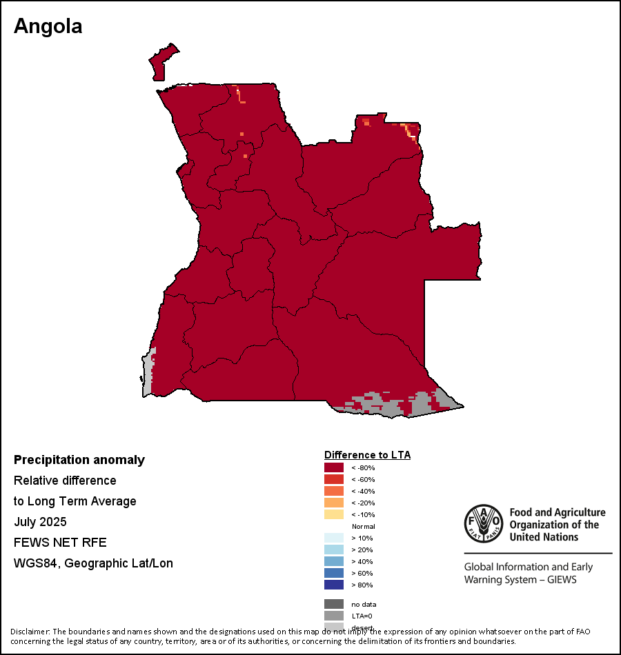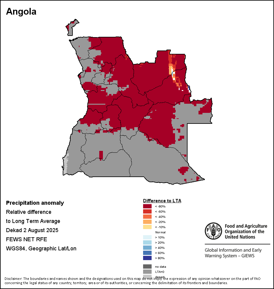 The map illustrates the difference between the current rainfall volume and the average level. Rainfall levels are compared with the Long-Term Average (LTA), which refers to the period 1989-2015. Warmer colours identify areas which have received lower-than-average rainfall, while colder colours are given to areas where precipitation has been above average.