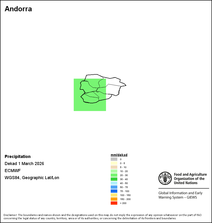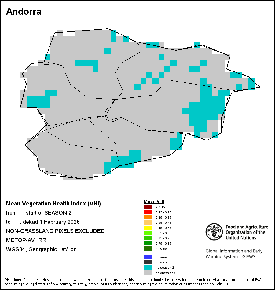 The country level maps and graphs depict the latest 36-month period of the seasonal, vegetation and precipitation indicators. The data is presented by dekad and month. All three vegetation indicators are based on 10-day (dekadal) vegetation data from the METOP-AVHRR sensor at 1 km resolution (2007 and after). Data at 1 km resolution for the period 1984-2006 are derived from the NOAA-AVHRR dataset at 16 km resolution. Precipitation estimates for all African countries (except Cabo Verde and Mauritius) are taken from NOAA/FEWSNet (16 km resolution), while for the remaining countries data is obtained from ECMWF (25 km resolution). Owing to the higher resolution of vegetation indicators (e.g., NDVI, VHI) compared to coarser precipitation indicators, the number of sub-national units for which valid zonal statistics can be generated for vegetation indices is greater than the number of units for precipitation indicators for certain countries.