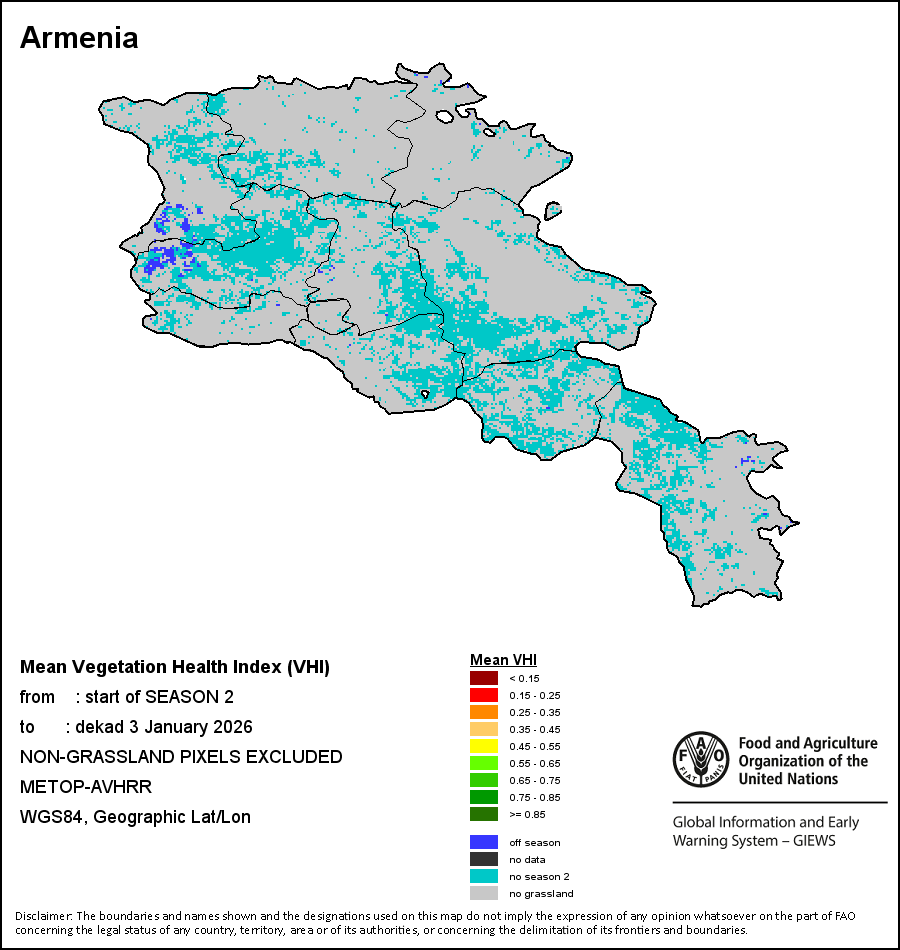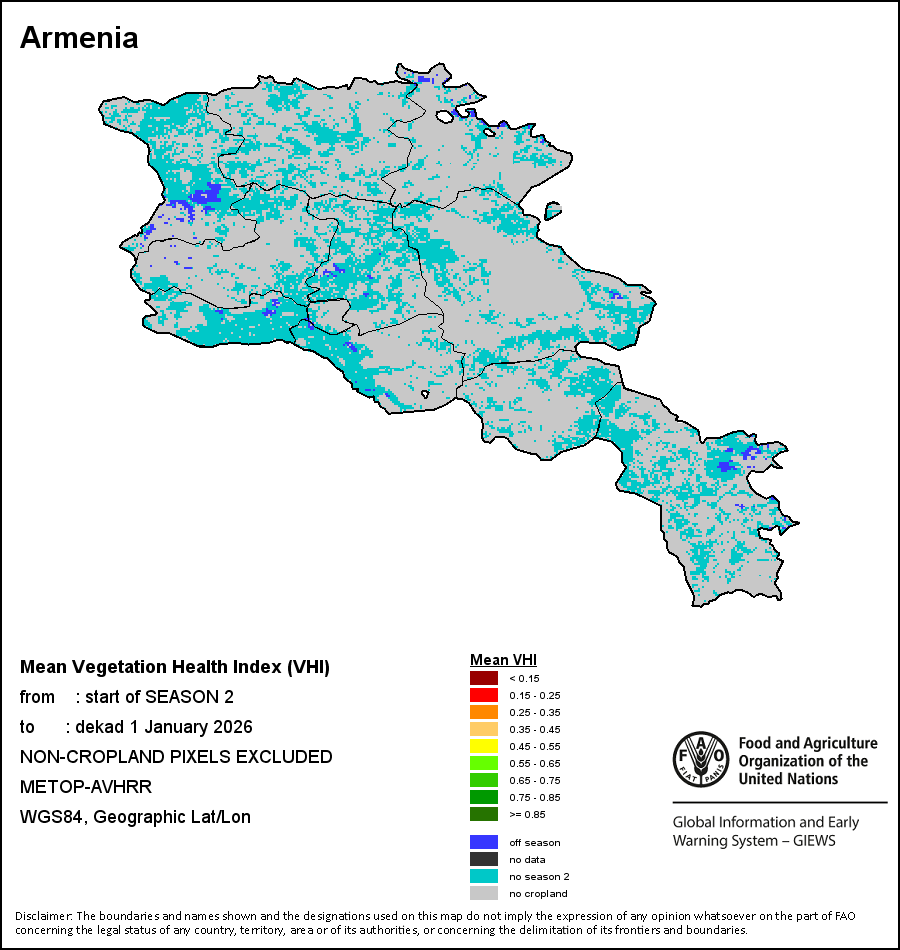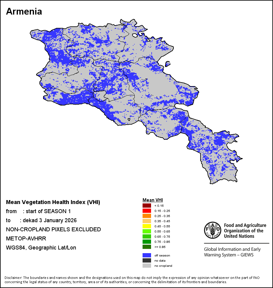 The Weighted Mean Vegetation Health Index (Weighted Mean VHI) allows the user to assess the severity of the drought from the start of the growing season, examining the vegetation health and the influence of temperature on plant conditions. The Mean VHI is an average of the dekadal VHI values over the crop growing season (from the start until the last dekad of analysis), weighted by crop coefficients (Kc), assigned to VHI values at the dekads corresponding to the Start of the Season (SOS), Maximum of the Season (MOS) and End of the Season (EOS). Crop coefficient is applied for the purpose of reflecting the crop’s water sensitivity at different phenology stages.