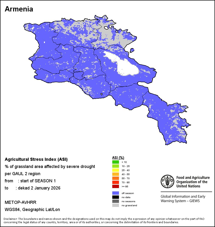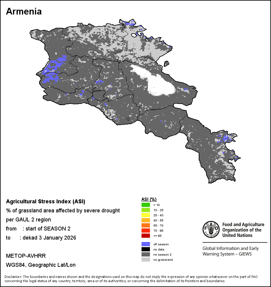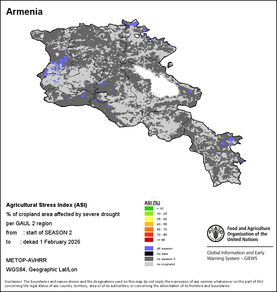 The Agricultural Stress Index (ASI) is a quick-look indicator that facilitates the early identification of cropped land with a high likelihood of water stress (drought). The Index is based on the integration of the Vegetation Health Index (VHI) in two dimensions that are critical in the assessment of a drought event in agriculture: temporal and spatial. The first step of the ASI calculation is a temporal averaging of the VHI, assessing the intensity and duration of dry periods occurring during the crop cycle at the pixel level; this calculation includes the use of crop coefficients, which introduces sensitivity of a crop to water stress during each phenological phase. The second step determines the spatial extent of drought events by calculating the percentage of pixels in arable areas with a VHI value below 35 percent (this value was identified as a critical threshold in assessing the extent of drought in previous research by Kogan, 1995). Each administrative area is classified according to the percentage of the affected area to facilitate the quick interpretation of results.