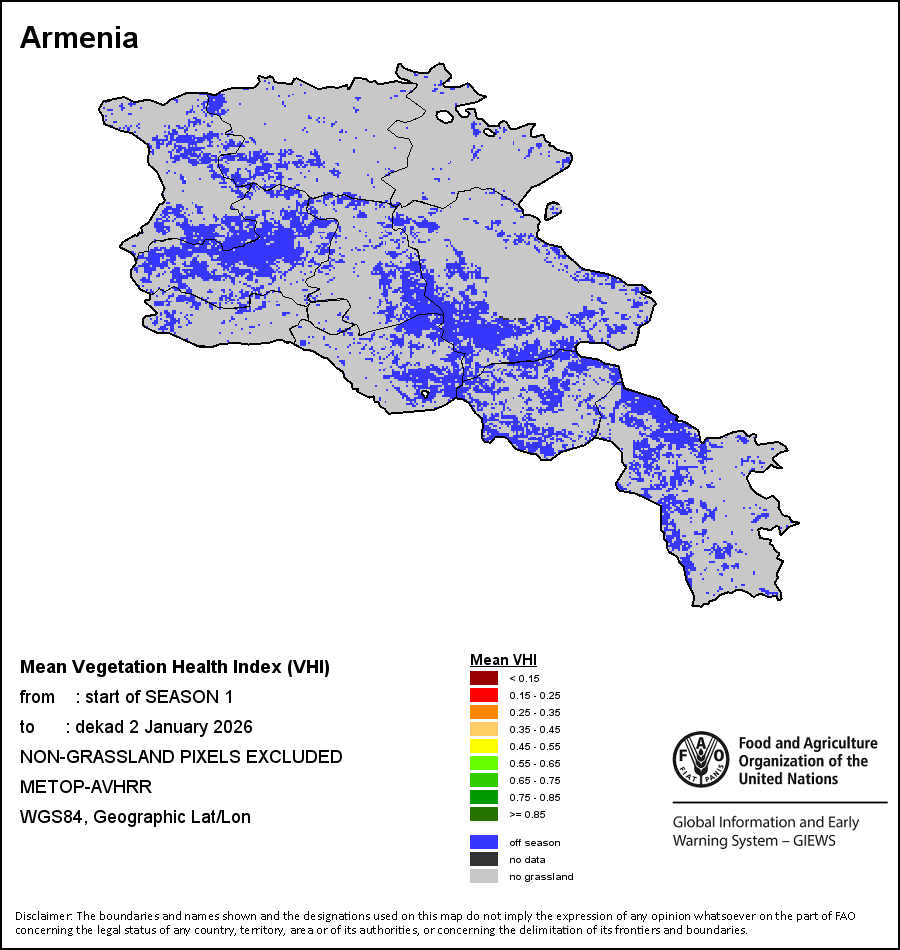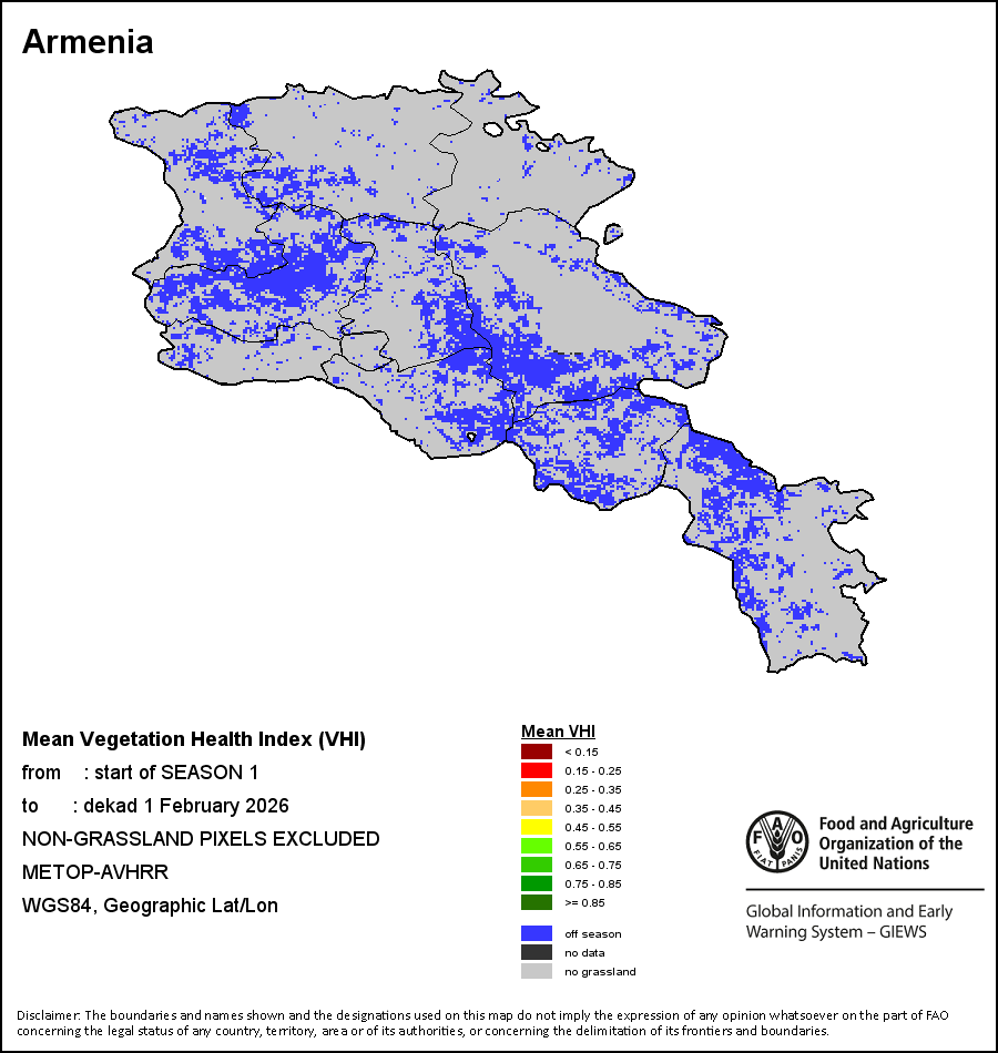 The country level maps and graphs depict the latest 36-month period of the seasonal, vegetation and precipitation indicators. The data is presented by dekad and month. All three vegetation indicators are based on 10-day (dekadal) vegetation data from the METOP-AVHRR sensor at 1 km resolution (2007 and after). Data at 1 km resolution for the period 1984-2006 are derived from the NOAA-AVHRR dataset at 16 km resolution. Precipitation estimates for all African countries (except Cabo Verde and Mauritius) are taken from NOAA/FEWSNet (16 km resolution), while for the remaining countries data is obtained from ECMWF (25 km resolution). Owing to the higher resolution of vegetation indicators (e.g., NDVI, VHI) compared to coarser precipitation indicators, the number of sub-national units for which valid zonal statistics can be generated for vegetation indices is greater than the number of units for precipitation indicators for certain countries.