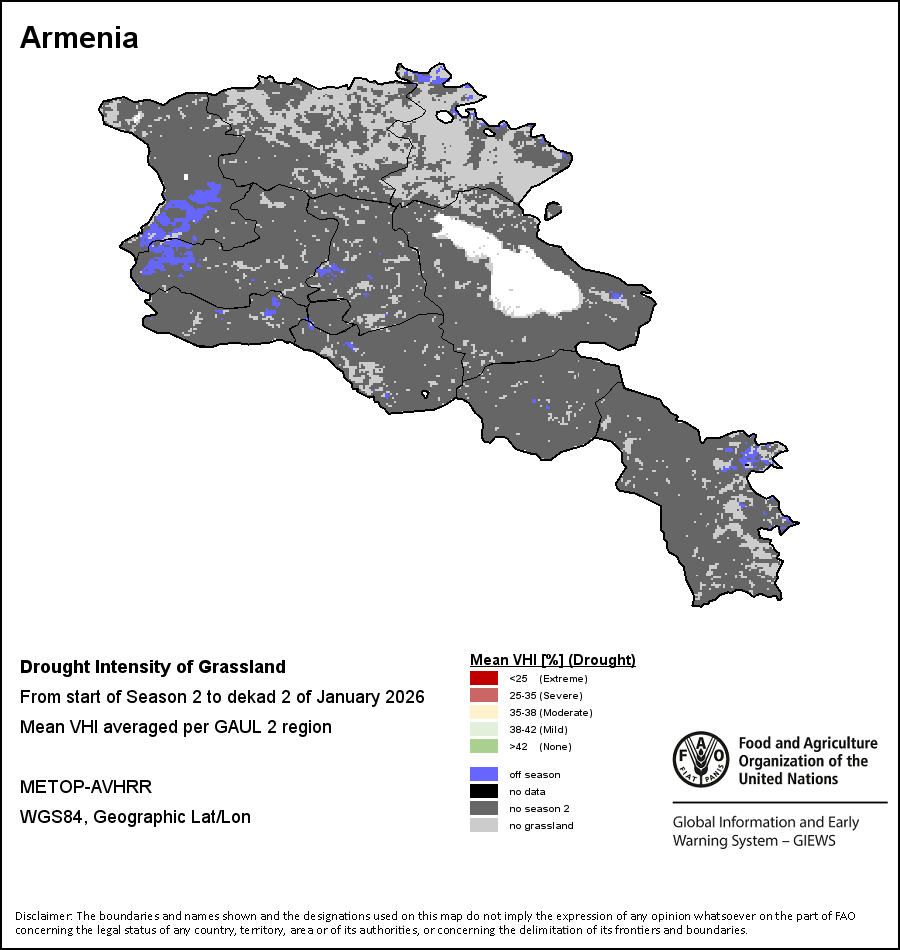 Agricultural droughts are classified by their intensity and are categorized into four classes: Extreme, Severe, Moderate or Mild. The intensity of the drought is calculated through the Weighted Mean Vegetation Health Index aggregated per GAUL 2 region, indicating that the poorer the vegetation health the more severe the drought.