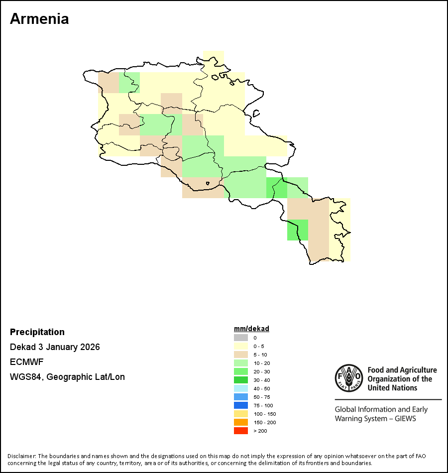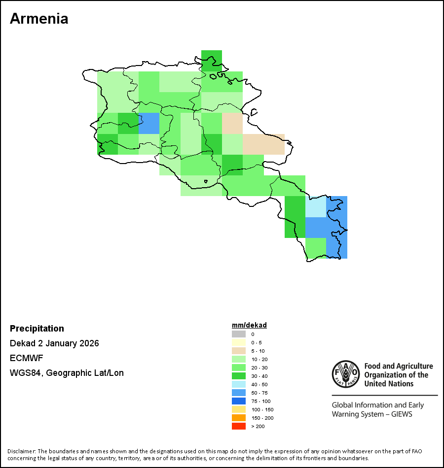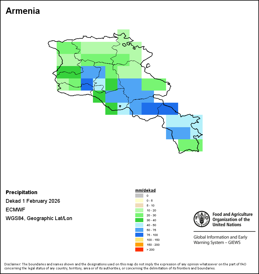 The map depicts cumulative rainfall volumes over a dekad (a 10-day period). Precipitation estimates for all African countries (except Cabo Verde and Mauritius) are taken from NOAA/FEWSNet, while for the remaining countries data is obtained from ECMWF.