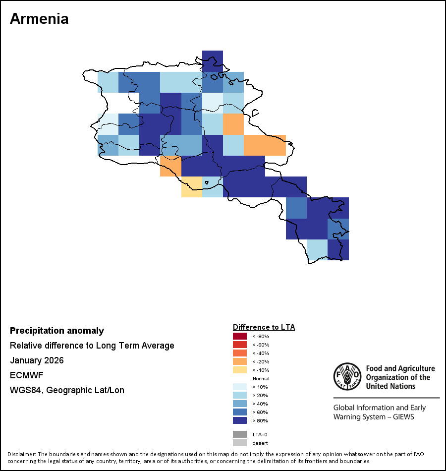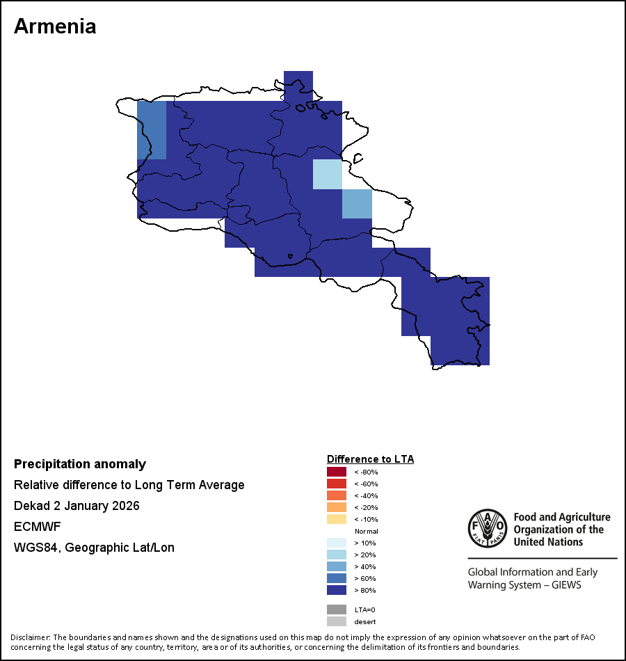 The map illustrates the difference between the current rainfall volume and the average level. Rainfall levels are compared with the Long-Term Average (LTA), which refers to the period 1989-2015. Warmer colours identify areas which have received lower-than-average rainfall, while colder colours are given to areas where precipitation has been above average.