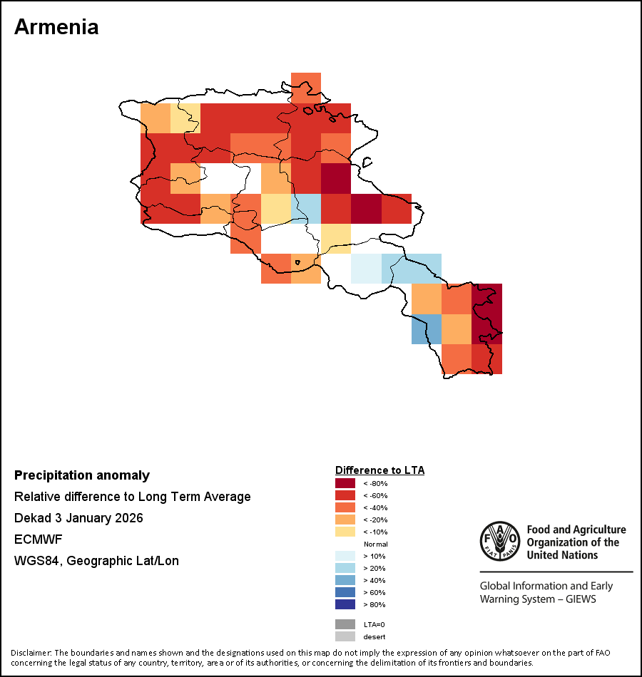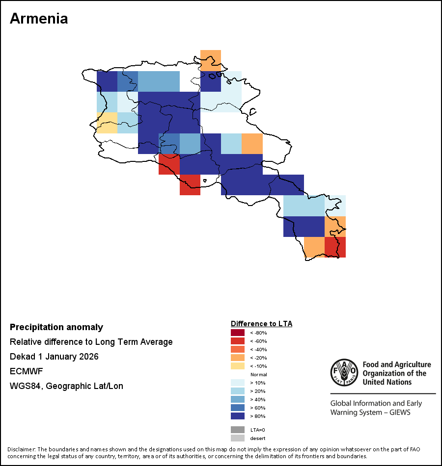The Normalized Difference Vegetation Index (NDVI) measures the “greenness” of ground cover and is used as a proxy to indicate the density and health of vegetation. NDVI values range from +1 to -1, with high positive values corresponding to dense and healthy vegetation, and low and/or negative NDVI values indicating poor vegetation conditions or sparse vegetative cover. The NDVI anomaly indicates the variation of the current dekad to the long-term average, where a positive value (for example 20 percent) would signify enhanced vegetation conditions compared to the average, while a negative value (for instance -40 percent) would indicate comparatively poor vegetation conditions.
