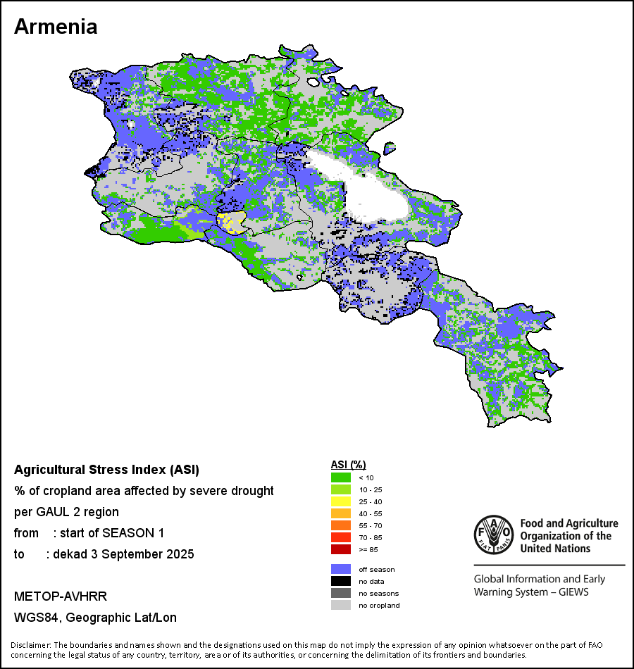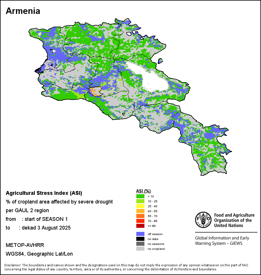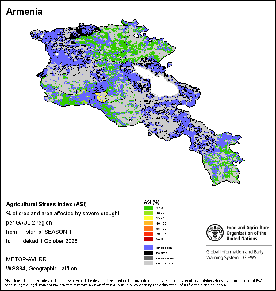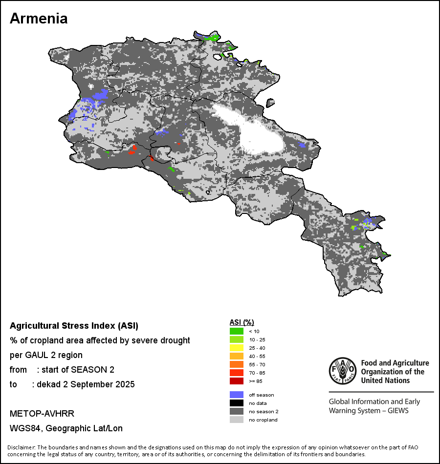 农业干旱胁迫指数(ASI)是一项速览指数,有助于在早期甄别较大可能发生水胁迫(干旱)的耕地。 该指数通过整合植被健康指数(VHI)在评估农业旱情方面具有关键意义的两个维度,即时间和空间维度,而得出。计算农业干旱胁迫指数的第一步是求植被健康指数的时间平均值,对作物周期内旱情的强度和时长进行像素级评估;这项计算包括采用作物系数衡量某种作物在各物候阶段对干旱胁迫的敏感度。第二步是确定旱情的空间广度,方法是计算植被健康指数值低于35%(Kogan前期研究将这一数值确定为评估干旱程度的临界值,1995年)的耕地的像素百分比。然后把各个行政区域根据受影响面积的百分比进行划分,便于对结果进行快速解读。