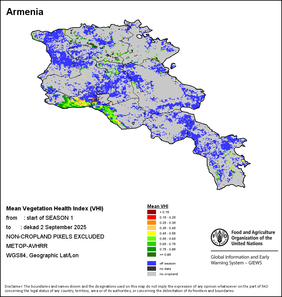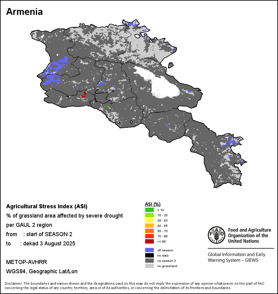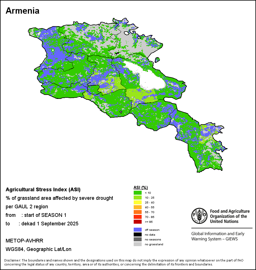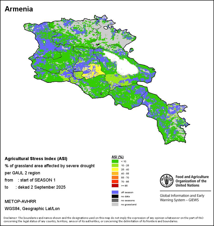 农业干旱胁迫指数(ASI)是一项速览指数,有助于在早期甄别较大可能发生水胁迫(干旱)的耕地。 该指数通过整合植被健康指数(VHI)在评估农业旱情方面具有关键意义的两个维度,即时间和空间维度,而得出。计算农业干旱胁迫指数的第一步是求植被健康指数的时间平均值,对作物周期内旱情的强度和时长进行像素级评估;这项计算包括采用作物系数衡量某种作物在各物候阶段对干旱胁迫的敏感度。第二步是确定旱情的空间广度,方法是计算植被健康指数值低于35%(Kogan前期研究将这一数值确定为评估干旱程度的临界值,1995年)的耕地的像素百分比。然后把各个行政区域根据受影响面积的百分比进行划分,便于对结果进行快速解读。