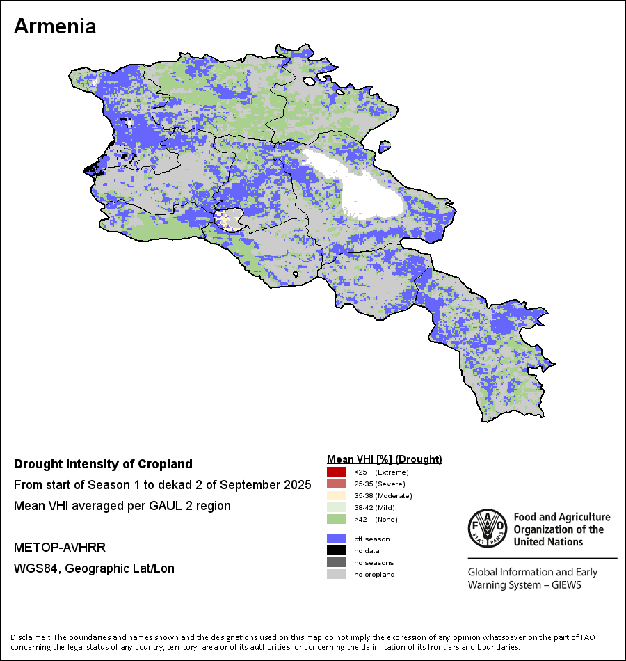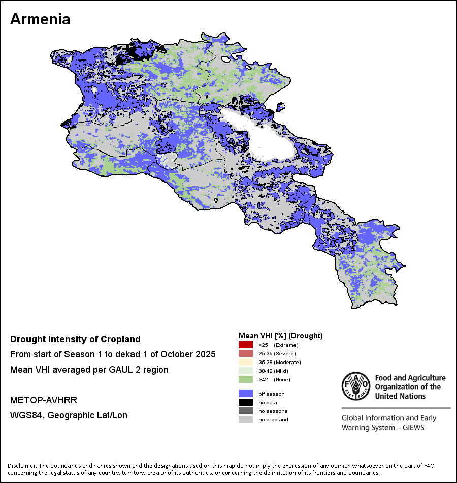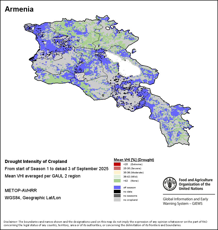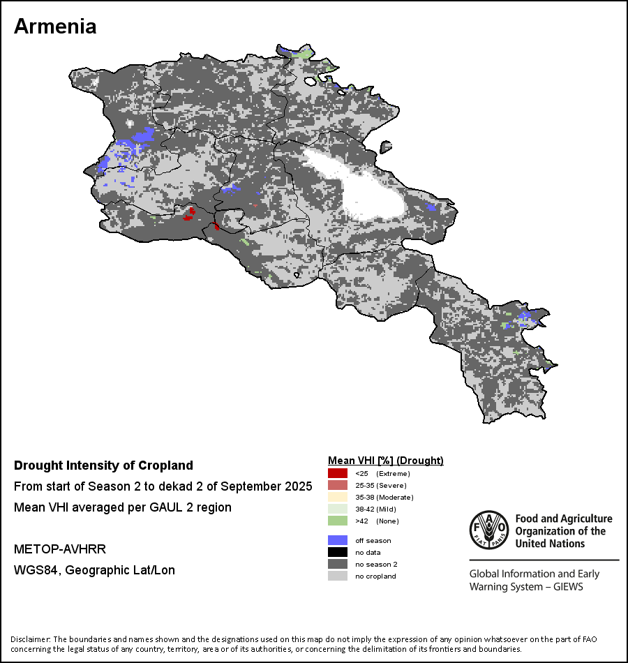农业干旱依据其强度划分为四类:极端、严重、重度或轻度。干旱的强度通过各全球行政单位分层制度二级区域(GAUL 2)地区累积加权平均植被健康指数计算得出,意味着植被健康状况越差旱情就越严重。