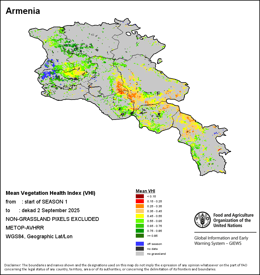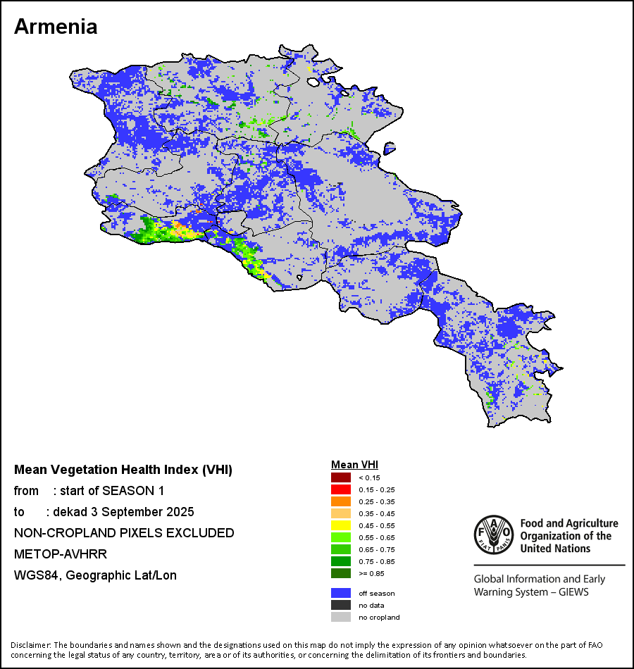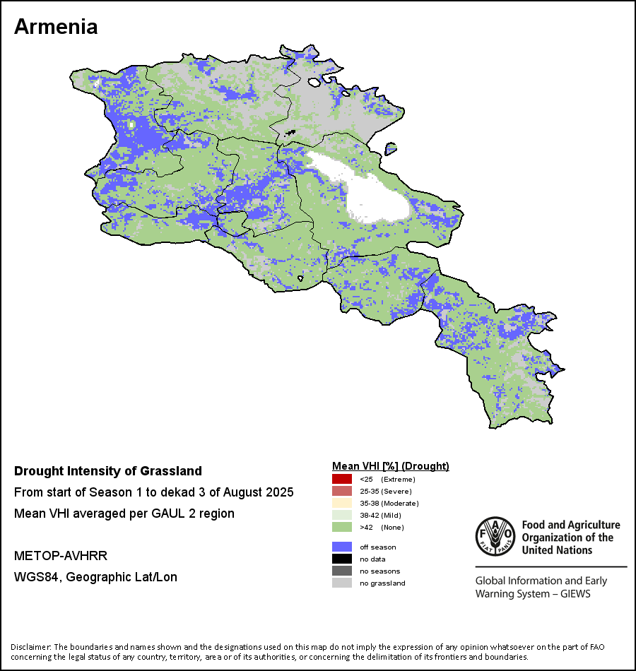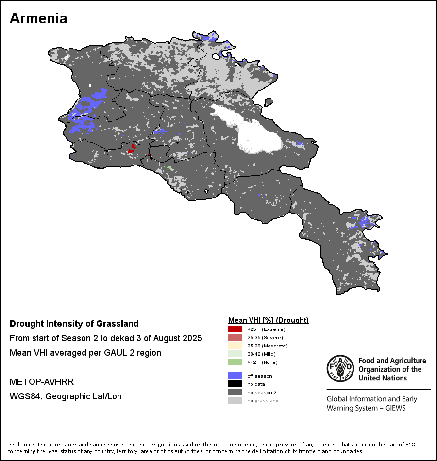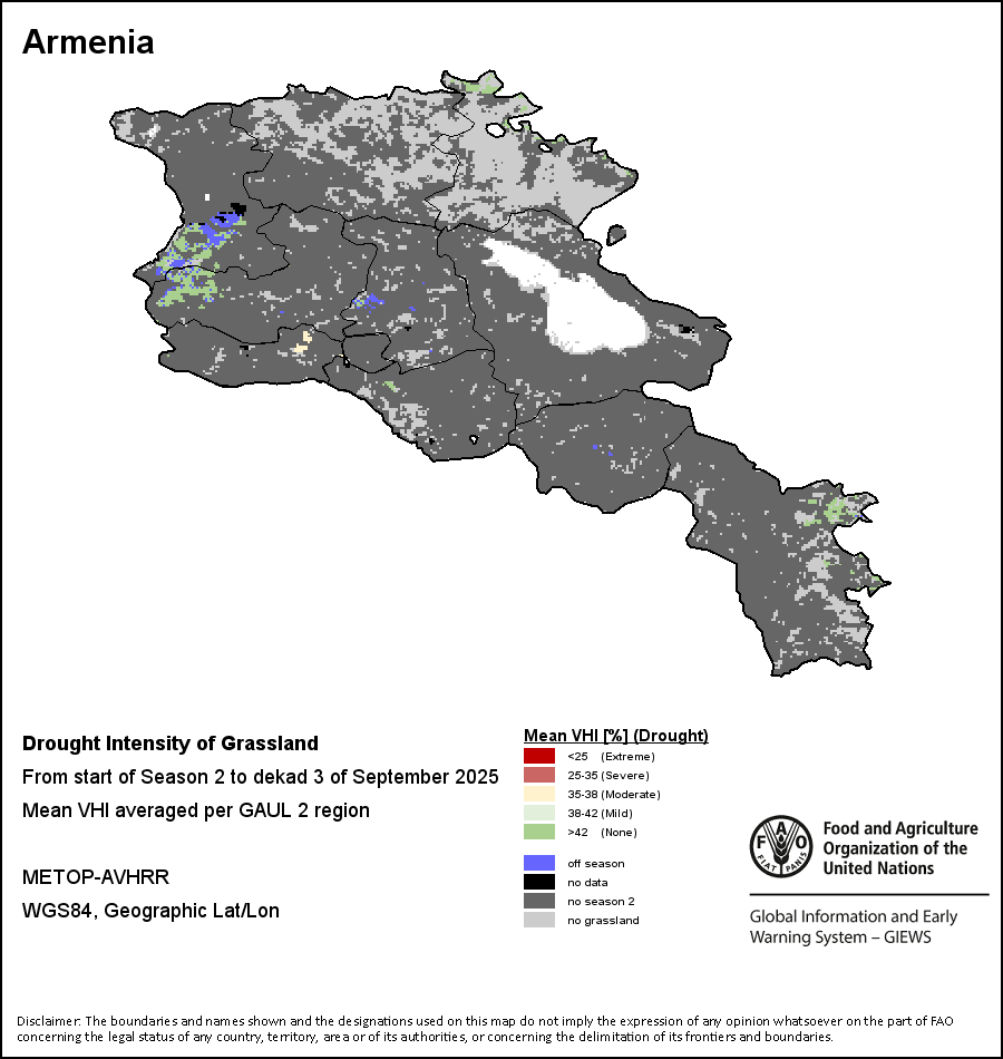 农业干旱依据其强度划分为四类:极端、严重、重度或轻度。干旱的强度通过各全球行政单位分层制度二级区域(GAUL 2)地区累积加权平均植被健康指数计算得出,意味着植被健康状况越差旱情就越严重。