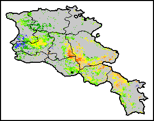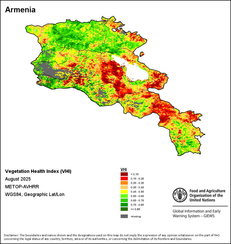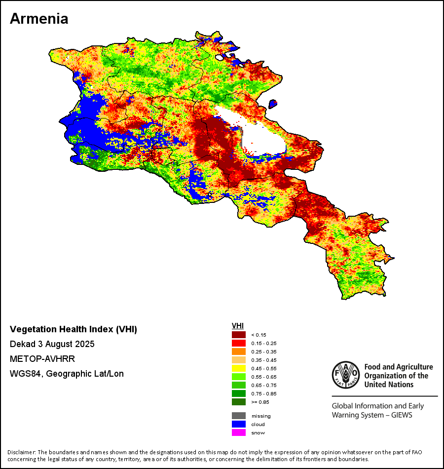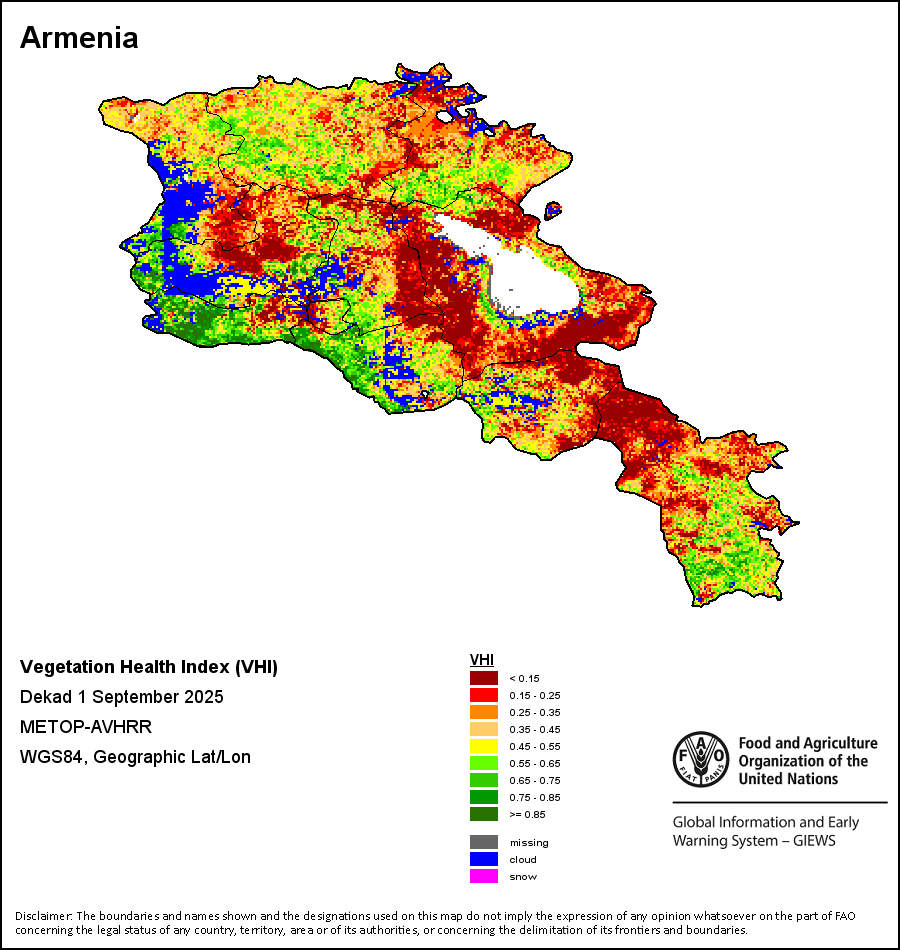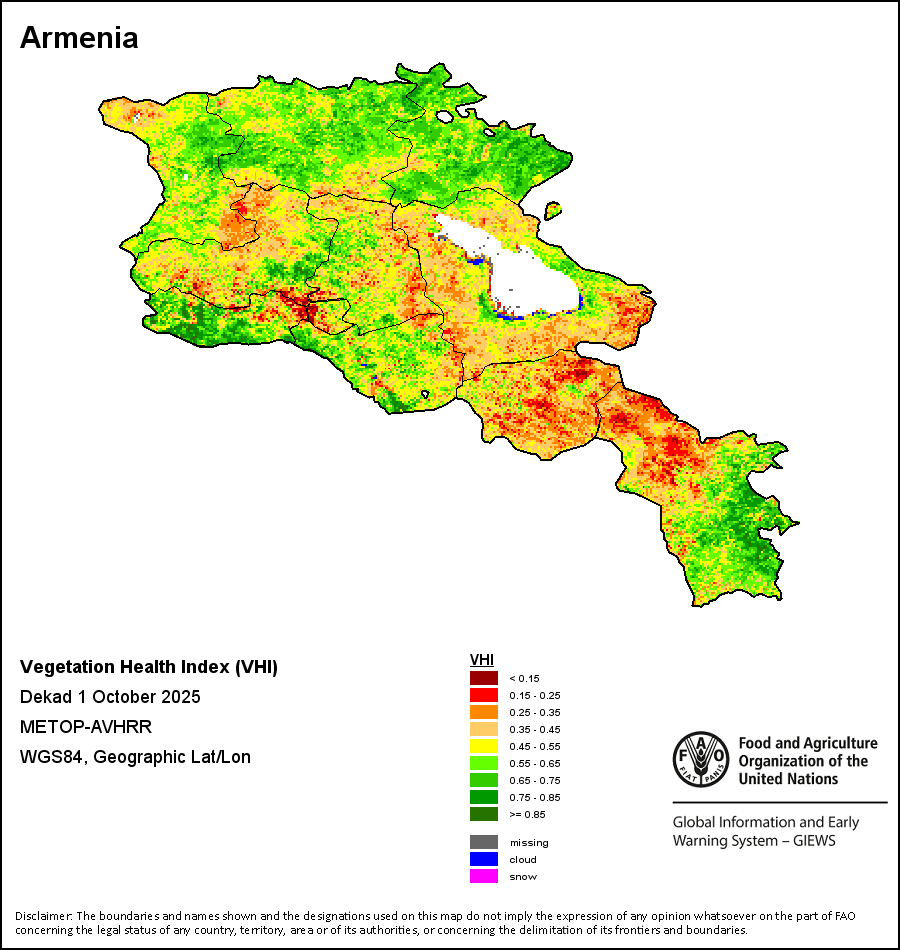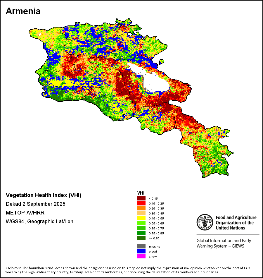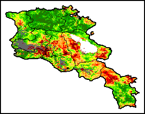 植被健康指数(VHI)根据植被健康状况以及气温对作物状况的影响情况显示干旱的严重程度。 VHI是一项综合指数,是用于计算ASI的基础性指标。它结合了植被状况指数(VCI)和气温状况指数(TCI)。TCI的计算采用了与VCI类似的方程,但它把当前气温与长期最高和最低值联系起来,因为一个假定前提是气温越高就倾向于造成植被状况恶化。比方说,VHI指数下降就意味着植被状况相对较差,而气温越高则意味着植被状况受到胁迫,较长时间延续则成为干旱的指征。VHI映像针对两个主要季节进行计算并分为三种时间模式:旬度、月度和年度。