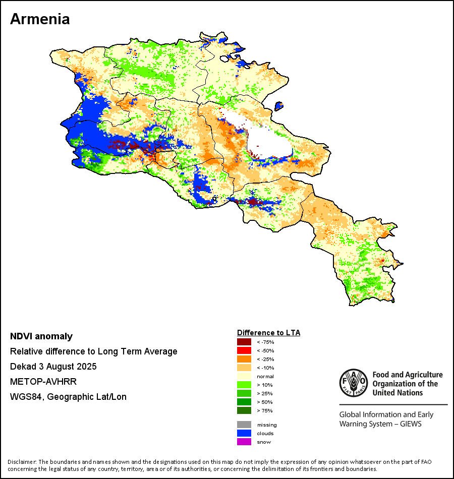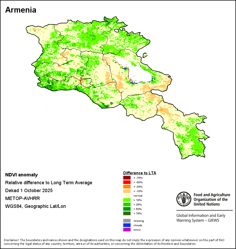 归一化差异植被指数(NDVI)衡量的是地表覆被的绿色程度,以此代表植被的密度和健康度情况。NDVI值的区间从+1至-1,正值越高代表植被的密度和健康度越高,NDVI低值和/或负值则显示植被状况不佳或稀疏。NDVI异常值显示的是当前10天与长期平均值之间的变量,正值(例如20%)就代表植被状况好于平均水平,而负值(如-40%)则代表植被状况相对较差。