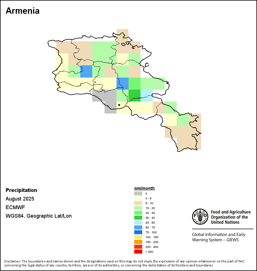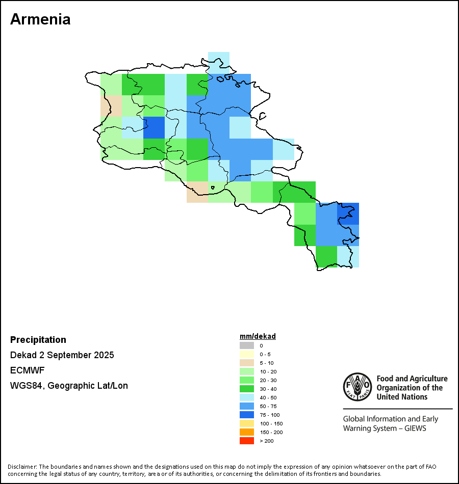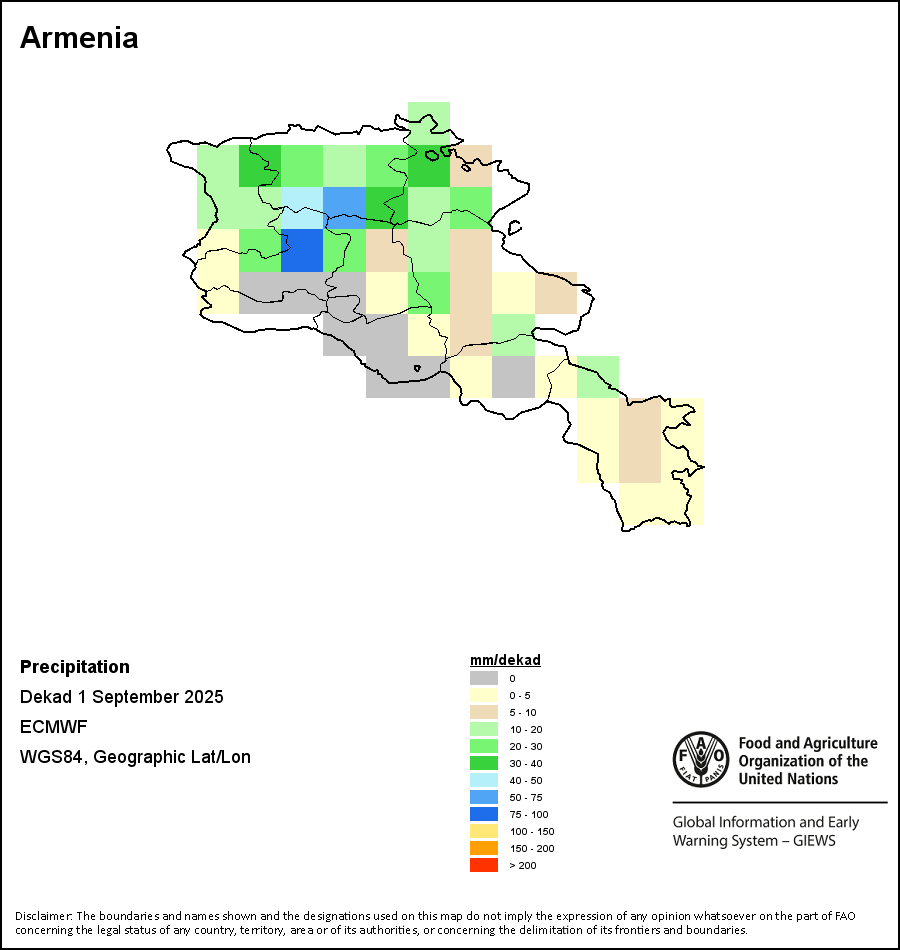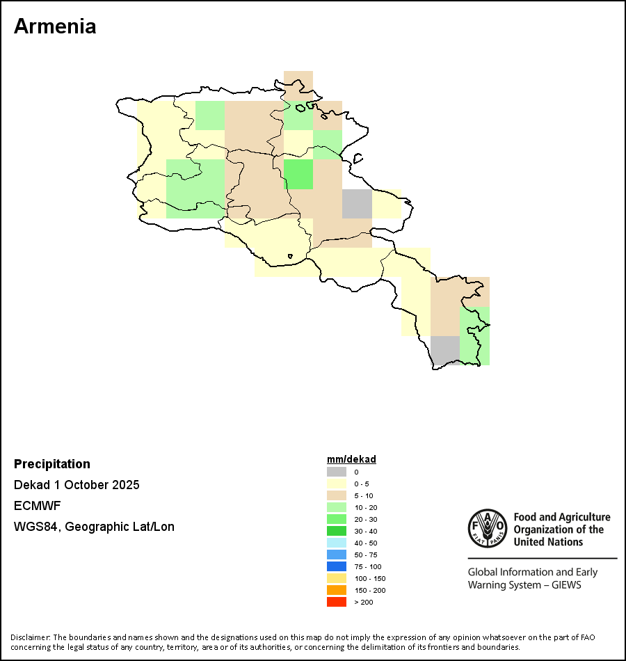 该图谱显示了每一旬(十天)的累积降水量。 所有非洲国家的降水量估算(除佛得角和毛里求斯外)均取自NOAA/FEWSNet,其他国家则取自ECMWF。