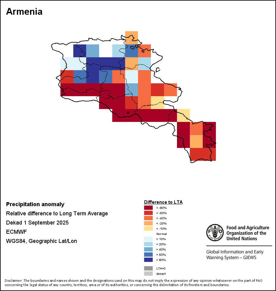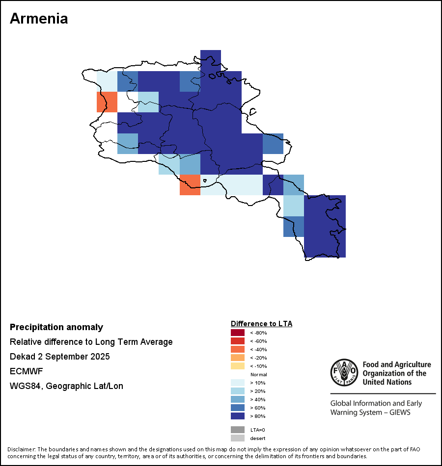 该图谱显示了当前降水量与平均水平之间的差异。 由降水量水平与长期平均值(LTA)进行比较得出,长期平均值系指1989-2015年期间的数值。暖色调指示的是降水量低于平均水平的地区,而冷色调指示的则是降水量高于平均水平的地区。降雨量估算数据来自欧洲中期天气预报这些(ECMWF)。