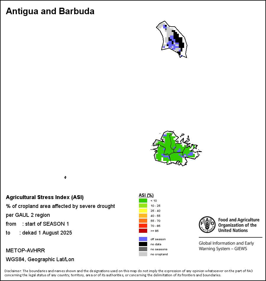 农业干旱胁迫指数(ASI)是一项速览指数,有助于在早期甄别较大可能发生水胁迫(干旱)的耕地。 该指数通过整合植被健康指数(VHI)在评估农业旱情方面具有关键意义的两个维度,即时间和空间维度,而得出。计算农业干旱胁迫指数的第一步是求植被健康指数的时间平均值,对作物周期内旱情的强度和时长进行像素级评估;这项计算包括采用作物系数衡量某种作物在各物候阶段对干旱胁迫的敏感度。第二步是确定旱情的空间广度,方法是计算植被健康指数值低于35%(Kogan前期研究将这一数值确定为评估干旱程度的临界值,1995年)的耕地的像素百分比。然后把各个行政区域根据受影响面积的百分比进行划分,便于对结果进行快速解读。
