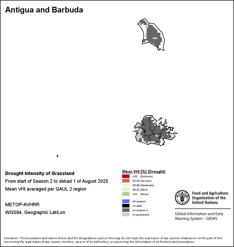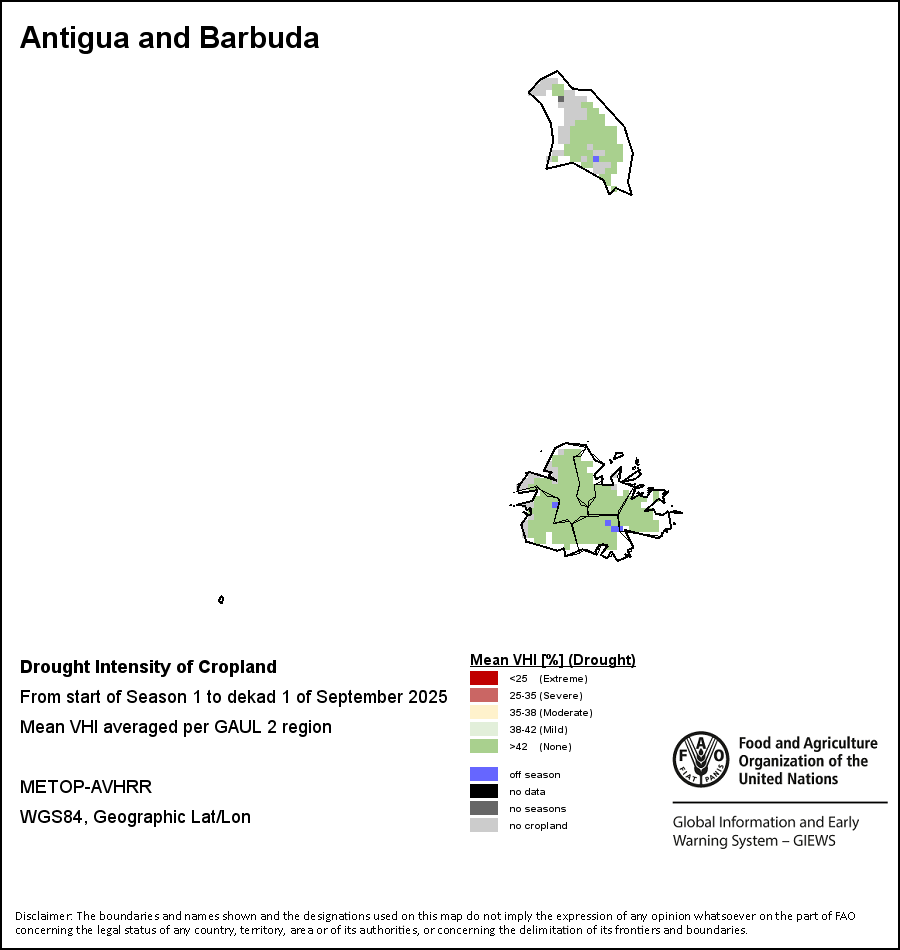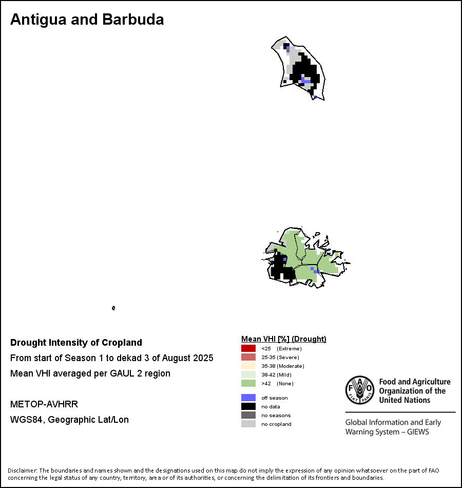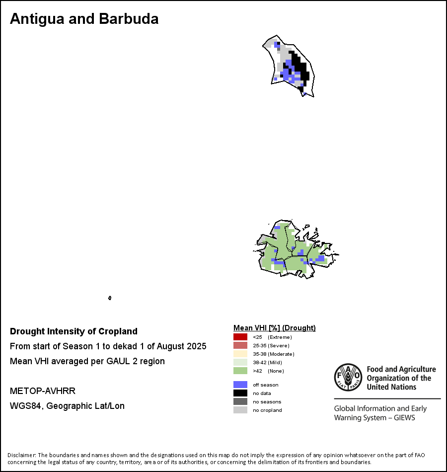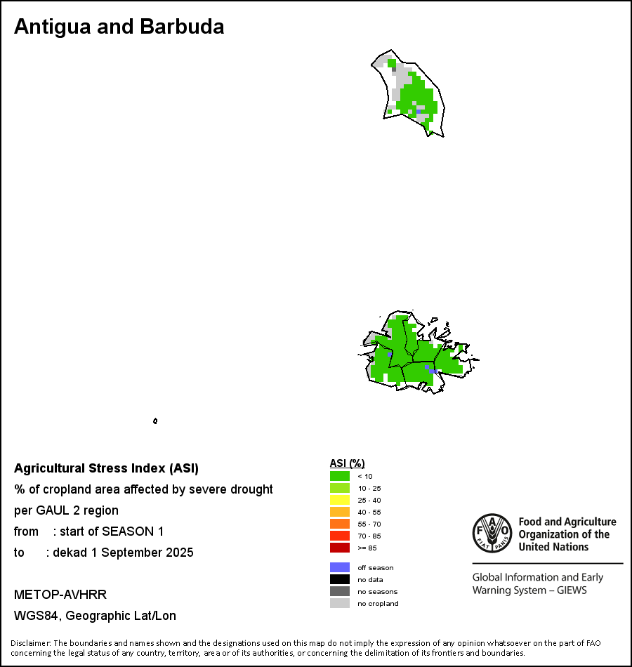农业干旱依据其强度划分为四类:极端、严重、重度或轻度。干旱的强度通过各全球行政单位分层制度二级区域(GAUL 2)地区累积加权平均植被健康指数计算得出,意味着植被健康状况越差旱情就越严重。