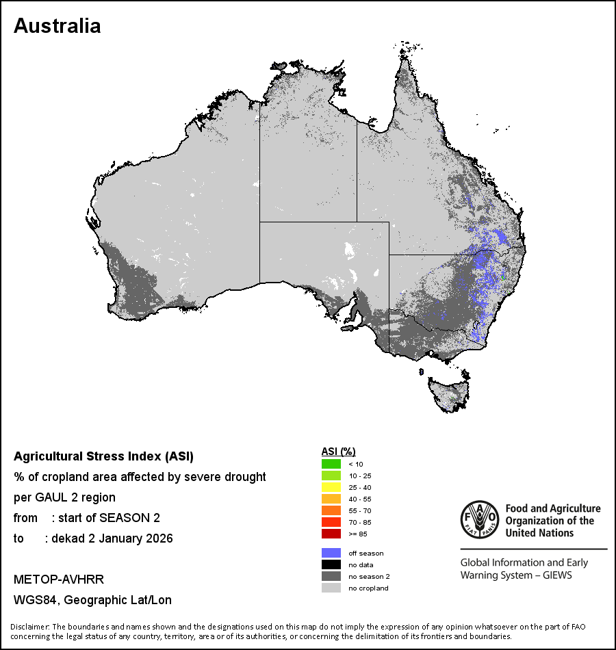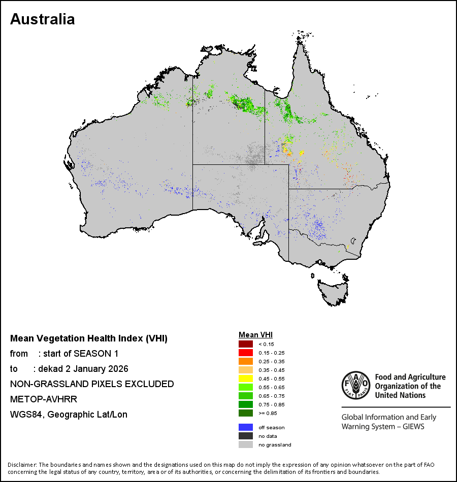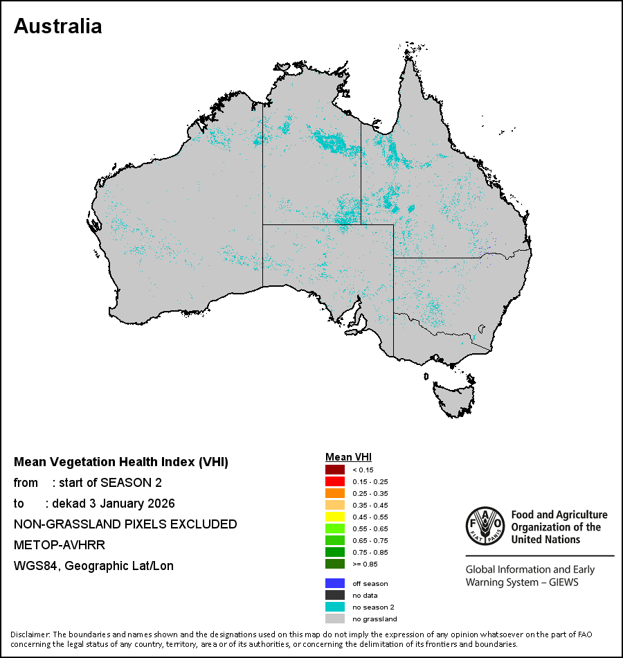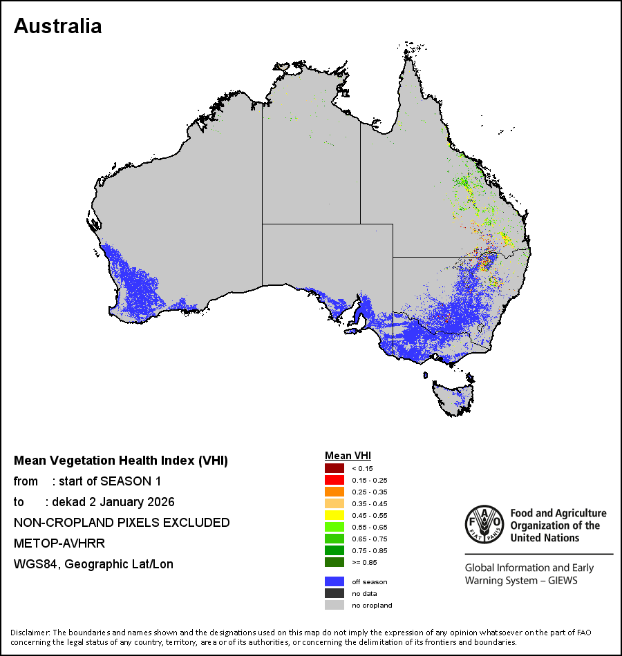 Индекс здоровья растительности (VHI) иллюстрирует серьезность засухи, основанной на здоровье растительности и влиянии температуры на состояние растений. VHI является составным индексом и элементарным индикатором, используемым для вычисления ASI. Он сочетает в себе как Индекс Состояния Растительности (VCI), так и Индекс Состояния Температуры (TCI). TCI рассчитывается с использованием аналогичного уравнения с VCI, но связывает текущую температуру с долгосрочным максимумом и минимумом, так как предполагается, что более высокие температуры, как правило, вызывают ухудшение состояния растительности. Например, уменьшение VHI будет означать относительно слабое состояние растительности и более высокие температуры, означающее ухудшение состояния растительности, что в течение более длительного периода будет свидетельствовать о засухе. Изображения VHI вычисляются для двух основных сезонов и трех модальностей: по-декадный, ежемесячный и годовой. |