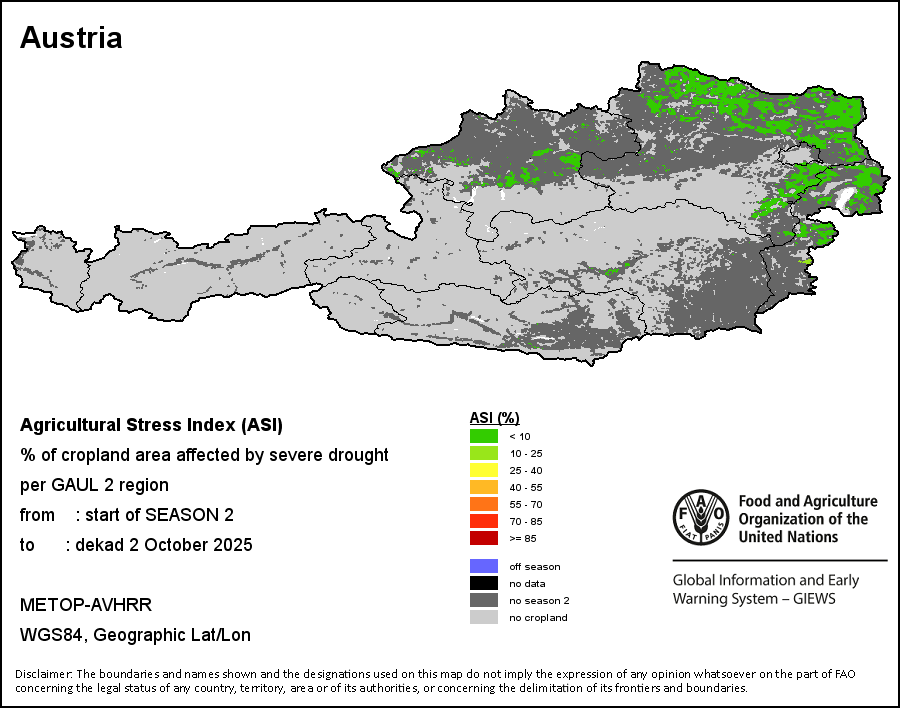 L'indice de stress hydrique (ASI – Agricultural Stress Index) est un indicateur qui facilite l'identification précoce des terres cultivées souffrant probablement de stress hydrique (sécheresse). L’indice se base sur l'Indice de santé de la végétation (VHI – Vegetation Health Index) auquel sont intégrées les dimensions espace-temps, essentielles pour évaluer un épisode de sécheresse dans le contexte agricole. La première étape du calcul de l’ASI consiste à établir une moyenne temporelle du VHI, en évaluant l'intensité et la durée des périodes de sécheresse se produisant pendant le cycle de culture au niveau du pixel; ce calcul comprend l'utilisation de coefficients de culture, qui permettent de tenir compte de la sensibilité d’une culture au stress hydrique pendant chaque phase phénologique. La deuxième étape consiste à déterminer l'étendue spatiale des épisodes de sécheresse en calculant le pourcentage de pixels dans les zones arables pour lequel la valeur du VHI est inférieure à 35 pour cent (cette valeur a été identifiée comme seuil critique dans l'évaluation de l'étendue de la sécheresse lors de précédentes recherches, Kogan, 1995). Enfin, chaque zone administrative est classée selon son pourcentage de superficie touchée afin de faciliter une interprétation rapide des résultats.