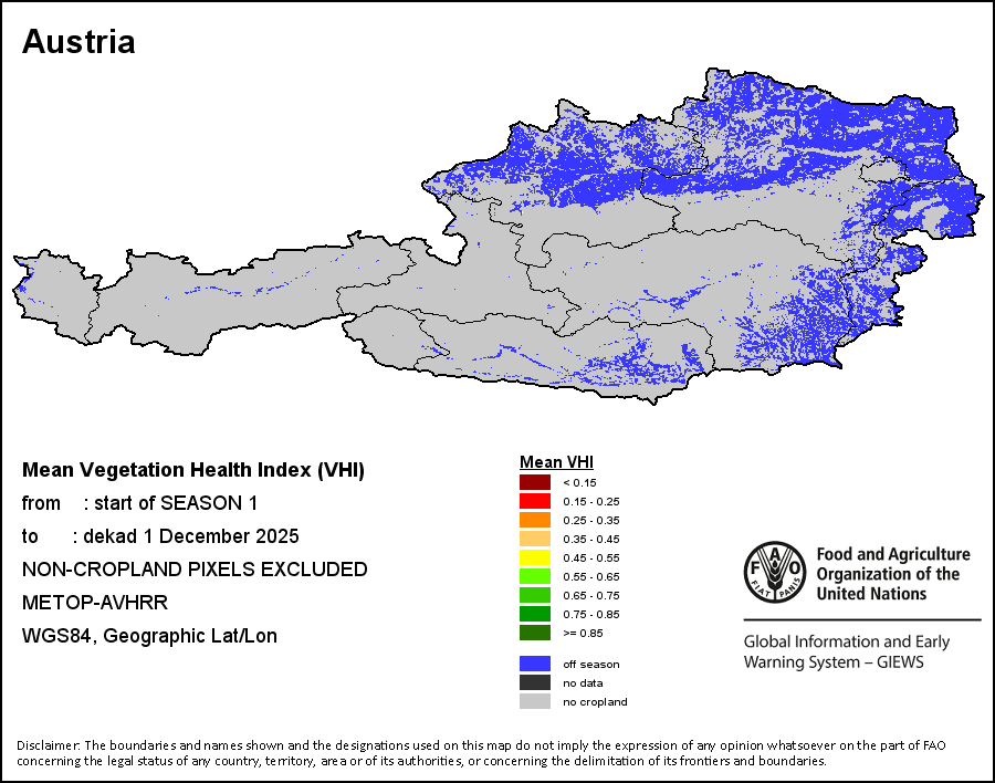 L'indice de santé de la végétation moyen pondérée (VHI moyen pondérée) permet à l'utilisateur d'évaluer la gravité de la sécheresse depuis le début de la saison de croissance et d'examiner l'état de santé de la végétation et l'influence de la température sur les conditions des plantes. Le VHI moyen pondérée est une moyenne des valeurs décadaires du VHI au cours de la saison de croissance des cultures (du début jusqu’à la dernière décade d’analyse), pondérée par les coefficients culturaux (Kc), attribués aux valeurs du VHI aux décades correspondant au début de la saison (SOS), maximum de la saison (MOS) et fin de la saison (EOS). L’application des coefficients culturaux vise à refléter la sensibilité des cultures face à un stress hydrique à différents stades phénologiques.