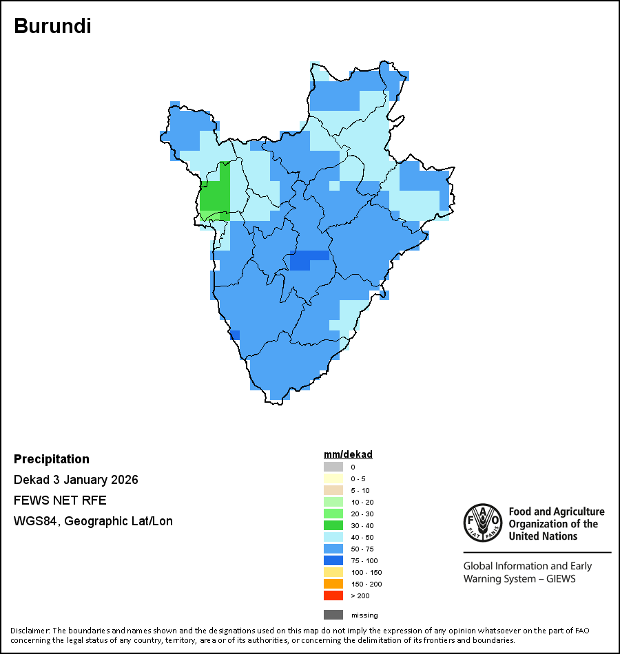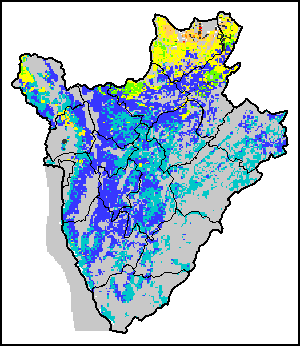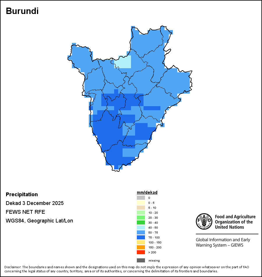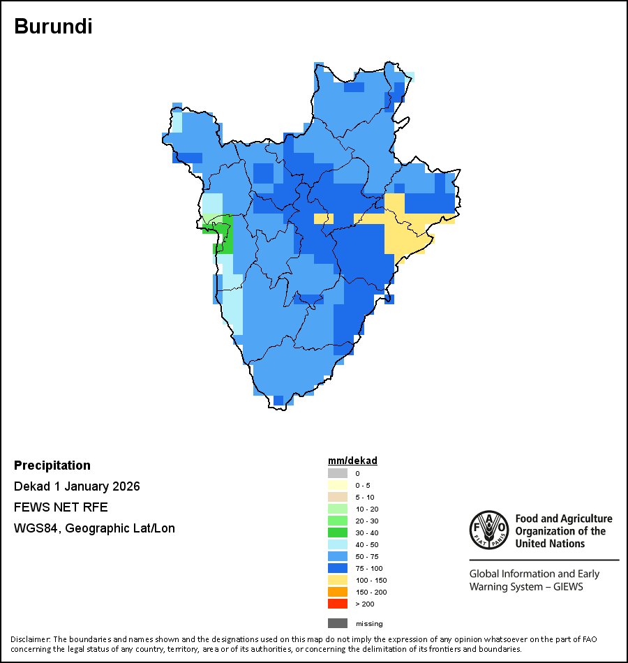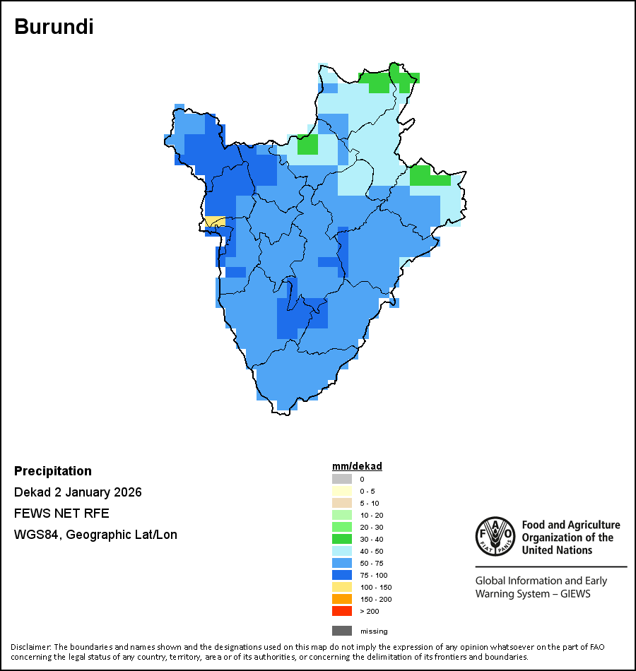 Los mapas y gráficos nacionales representan el último periodo de 36 meses de los indicadores estacionales, de vegetación y de precipitación. Los datos se presentan por periodos de 10 días y por meses. Los tres indicadores de vegetación se basan en datos de vegetación registrados cada diez días por el sensor METOP-AVHRR con una resolución de 1km (2007 y posterior). Los datos con una resolución de 1km del período 1984-2006 se extrapolaron a partir del conjunto de datos NOAA-AVHRR con 16km de resolución. Las estimaciones de precipitación de todos los países africanos (excepto Cabo Verde y Mauricio) se obtienen de NOAA/FEWSNet (16km de resolución), mientras que para los restantes países los datos se obtienen Centro Europeo de Predicción Meteorológica a Plazo Medio (ECMWF siglas en Inglés, 25km de resolución). Debido a la mayor resolución de los indicadores de vegetación (p.ej., NDVI, VHI) en comparación con los indicadores de precipitación de resolución más gruesa, el número de unidades subnacionales para las que se pueden generar estadísticas zonales válidas para los índices de vegetación es mayor que el número de unidades para los indicadores de precipitación en algunos países.
