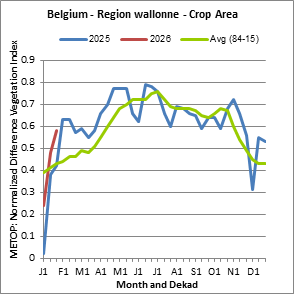 Нормализованный Индекс Разности Растительности (NDVI) измеряет «зелёность» почвенного покрова и используется в качестве прокси, для определения плотности и здоровья растительного покрова. Значения NDVI варьируются от +1 до -1, с высокими положительными значениями, соответствующими плотной и здоровой растительности, и низкими и/или отрицательными значениями NDVI, указывающими на плохое состояние растений и редкий растительный покров. NDVI Аномалия указывает на изменения в текущей декаде относительно среднего значения длительных исторических показателей, где положительное значение (например, 20 процентов) означает улучшенное состояние растительности по сравнению со средним показателем, тогда как отрицательное значение (например, -40 процентов) указывает на сравнительно плохое состояние растений.