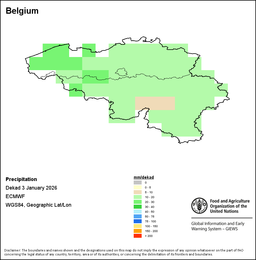 该图谱显示了每一旬(十天)的累积降水量。 所有非洲国家的降水量估算(除佛得角和毛里求斯外)均取自NOAA/FEWSNet,其他国家则取自ECMWF。