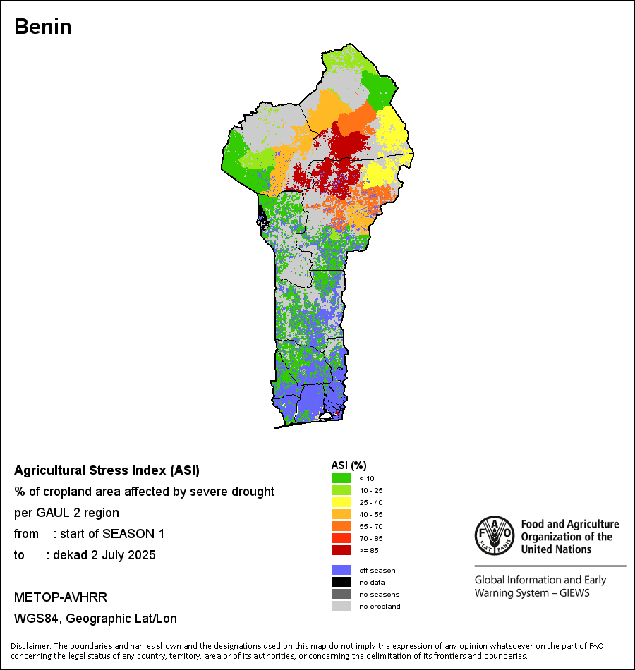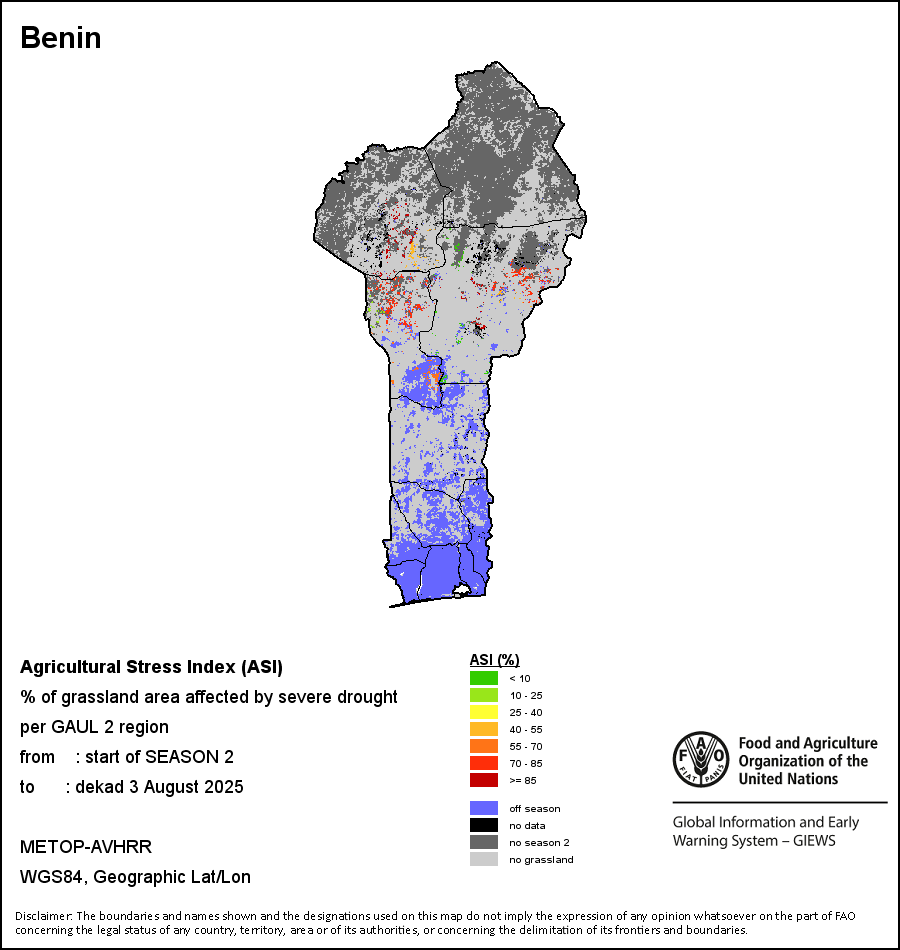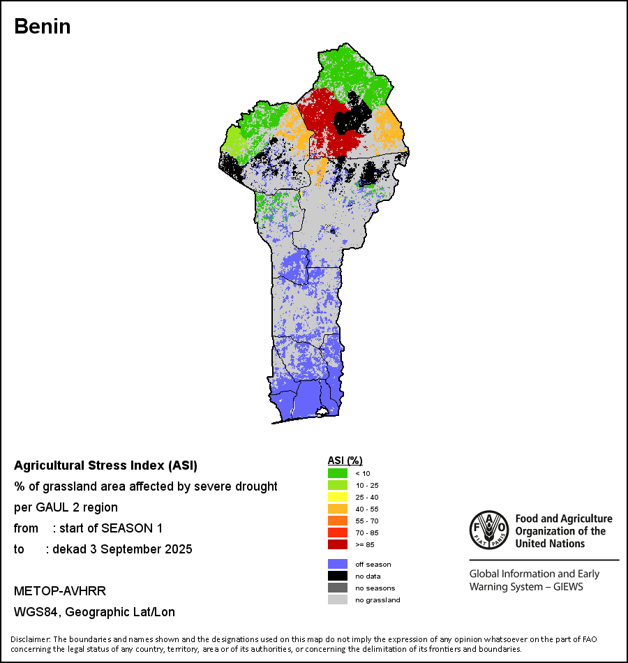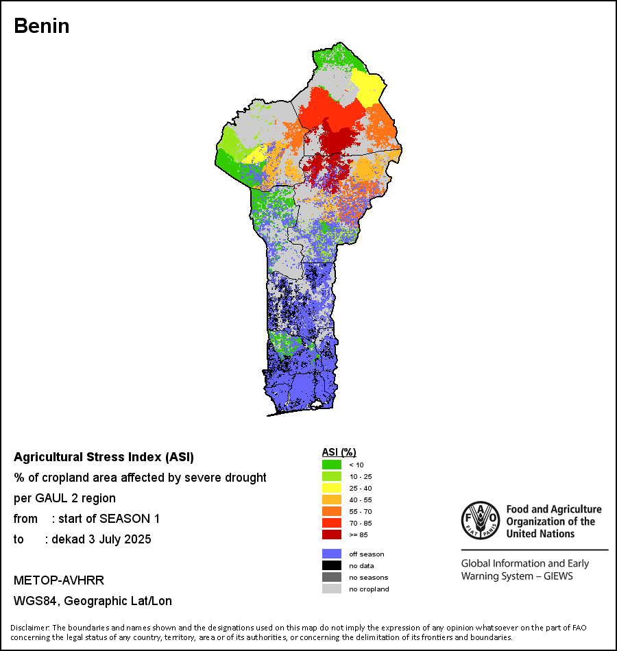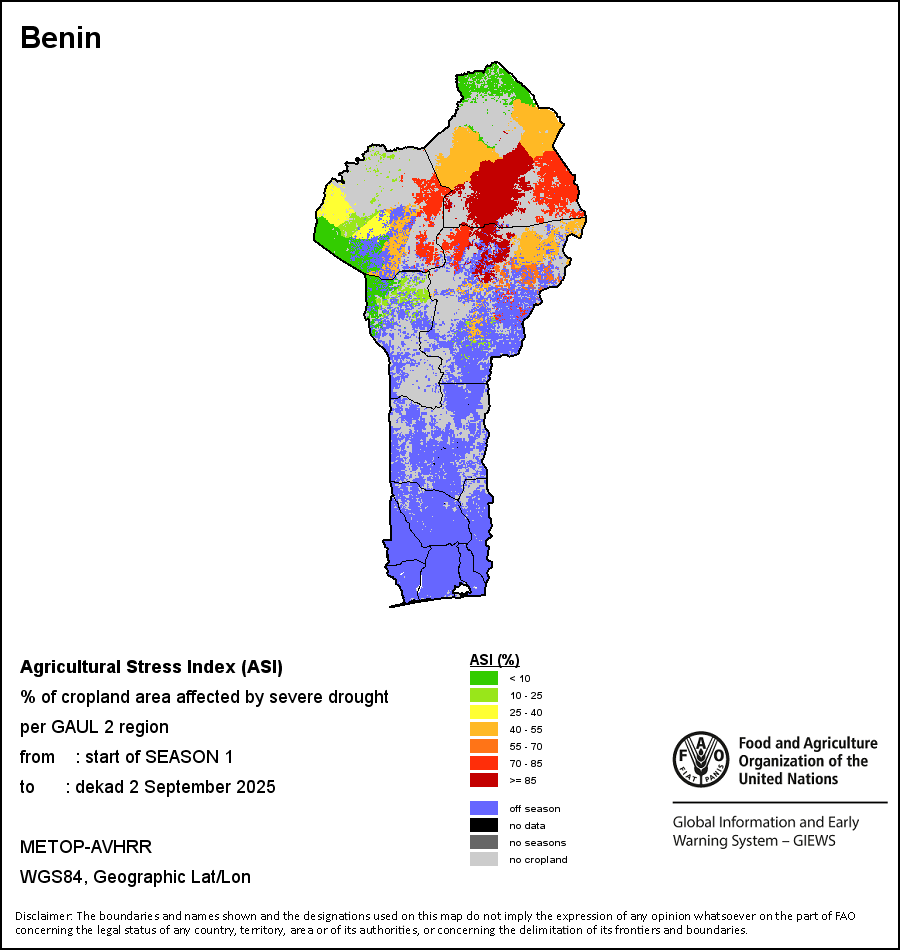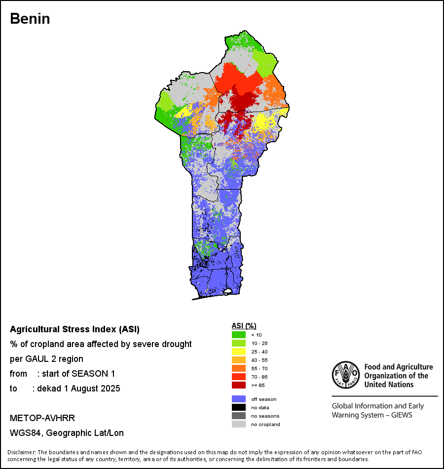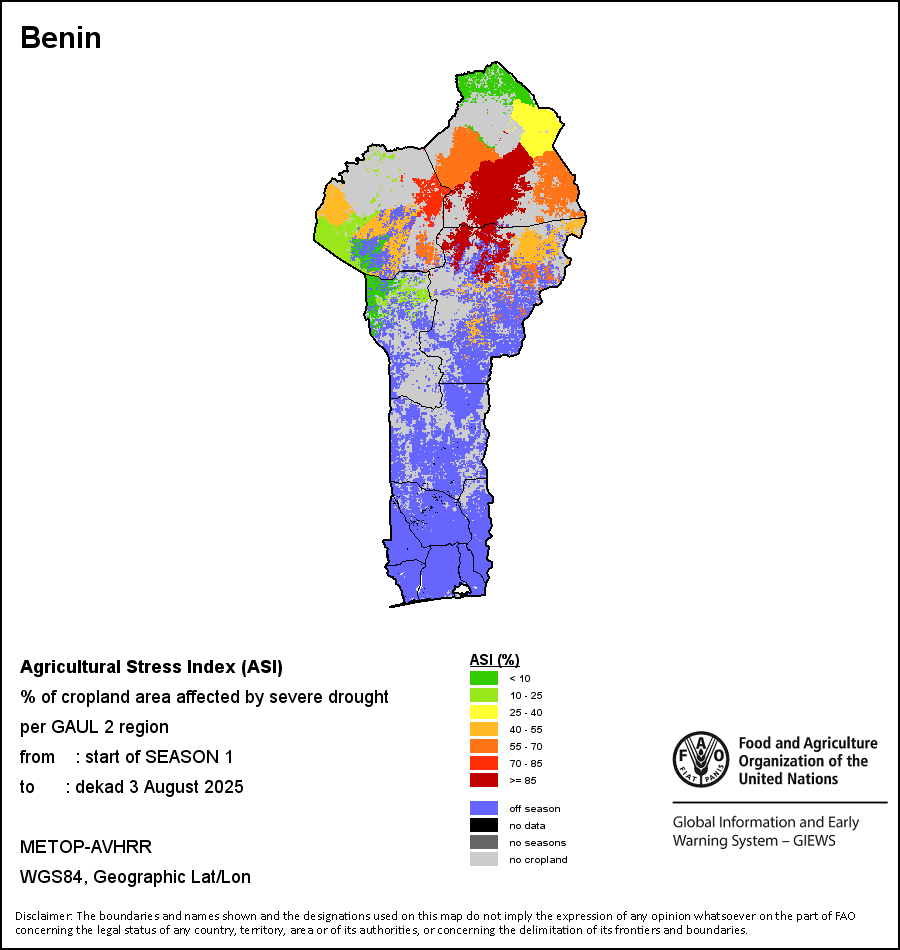The Agricultural Stress Index (ASI) is a quick-look indicator that facilitates the early identification of cropped land with a high likelihood of water stress (drought). The Index is based on the integration of the Vegetation Health Index (VHI) in two dimensions that are critical in the assessment of a drought event in agriculture: temporal and spatial. The first step of the ASI calculation is a temporal averaging of the VHI, assessing the intensity and duration of dry periods occurring during the crop cycle at the pixel level; this calculation includes the use of crop coefficients, which introduces sensitivity of a crop to water stress during each phenological phase. The second step determines the spatial extent of drought events by calculating the percentage of pixels in arable areas with a VHI value below 35 percent (this value was identified as a critical threshold in assessing the extent of drought in previous research by Kogan, 1995). Each administrative area is classified according to the percentage of the affected area to facilitate the quick interpretation of results.