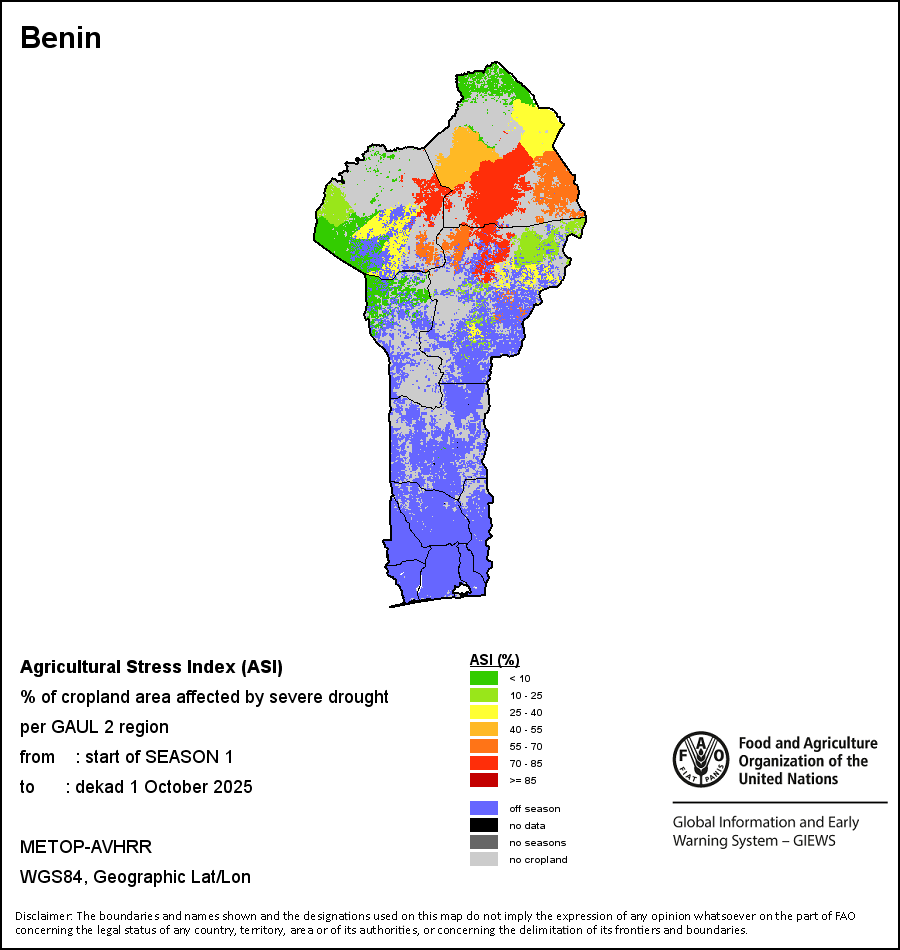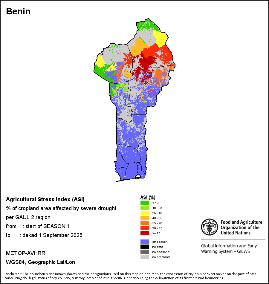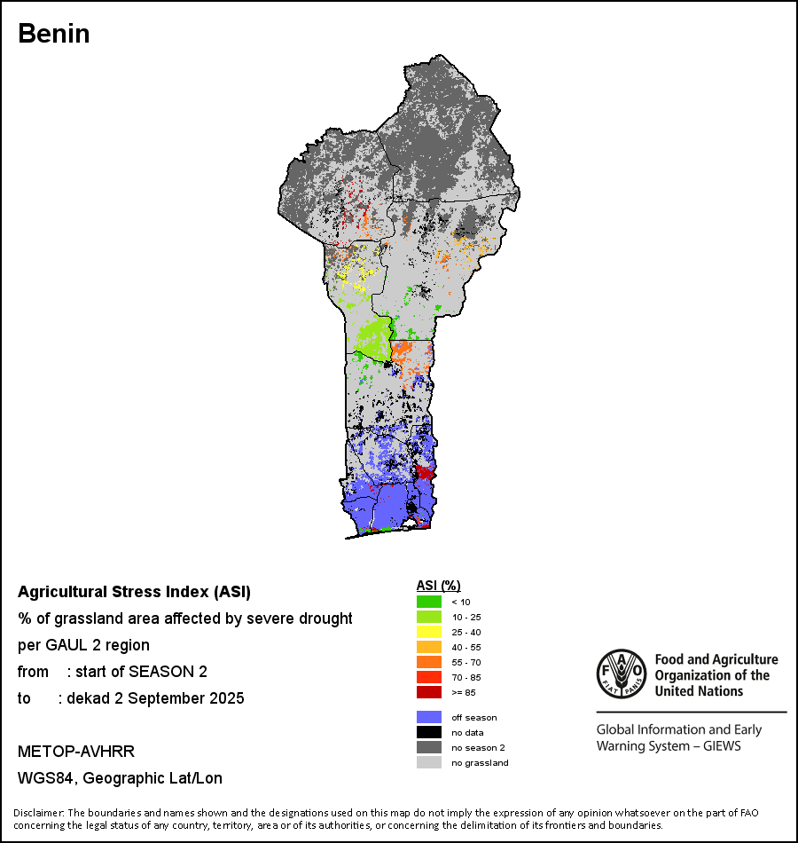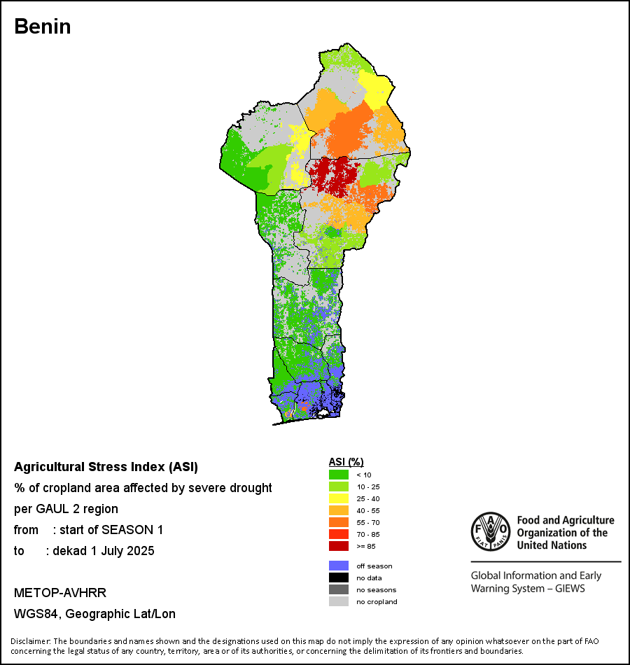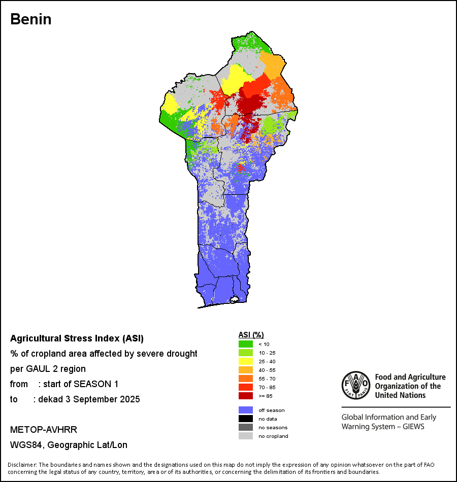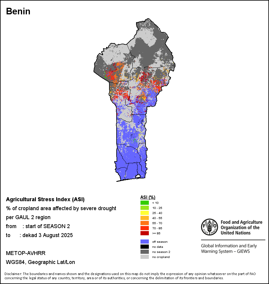 The Agricultural Stress Index (ASI) is a quick-look indicator that facilitates the early identification of cropped land with a high likelihood of water stress (drought). The Index is based on the integration of the Vegetation Health Index (VHI) in two dimensions that are critical in the assessment of a drought event in agriculture: temporal and spatial. The first step of the ASI calculation is a temporal averaging of the VHI, assessing the intensity and duration of dry periods occurring during the crop cycle at the pixel level; this calculation includes the use of crop coefficients, which introduces sensitivity of a crop to water stress during each phenological phase. The second step determines the spatial extent of drought events by calculating the percentage of pixels in arable areas with a VHI value below 35 percent (this value was identified as a critical threshold in assessing the extent of drought in previous research by Kogan, 1995). Each administrative area is classified according to the percentage of the affected area to facilitate the quick interpretation of results.