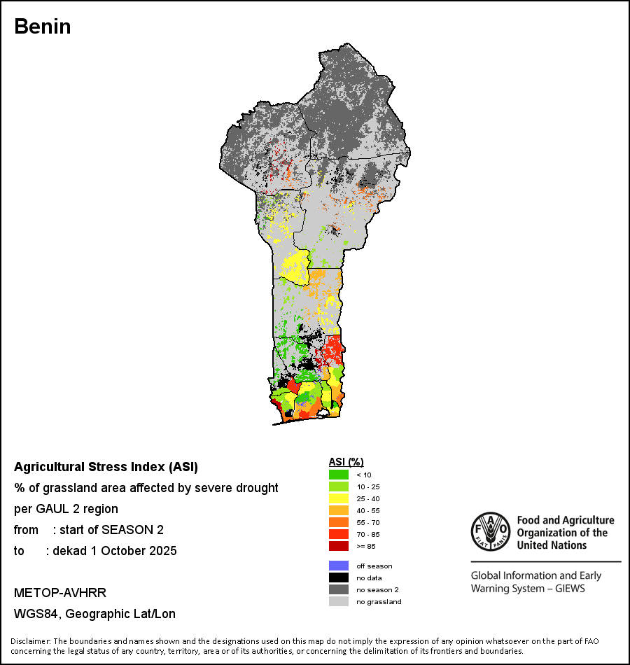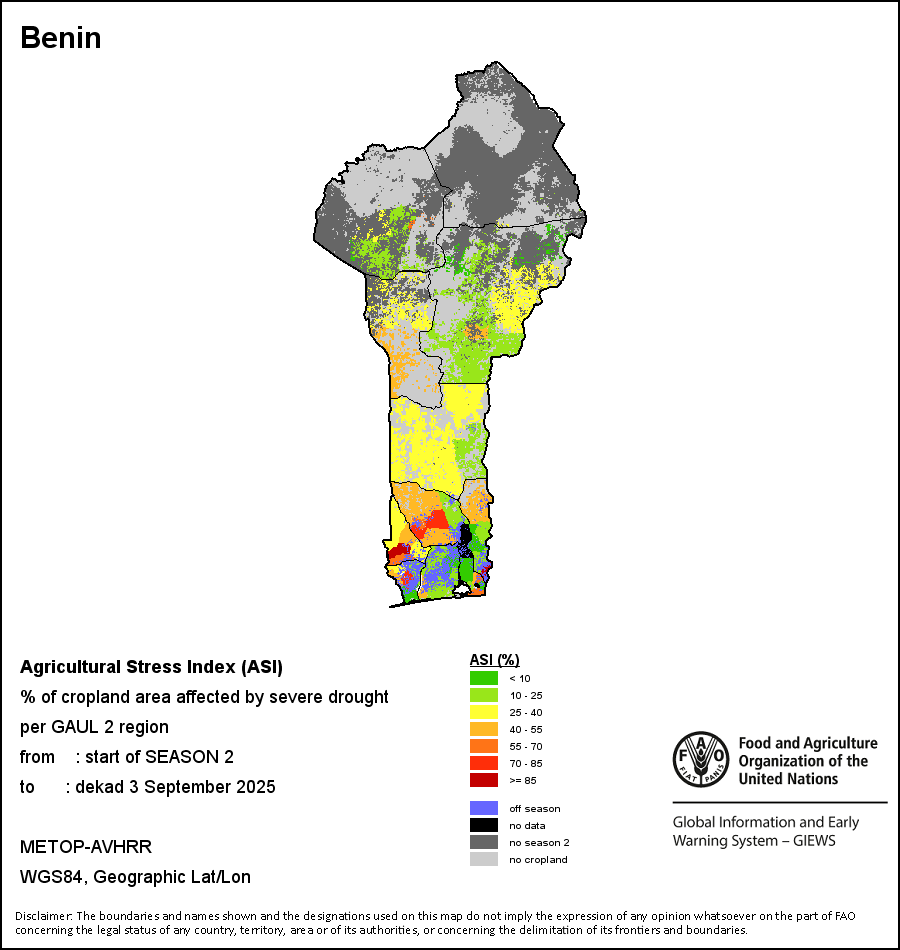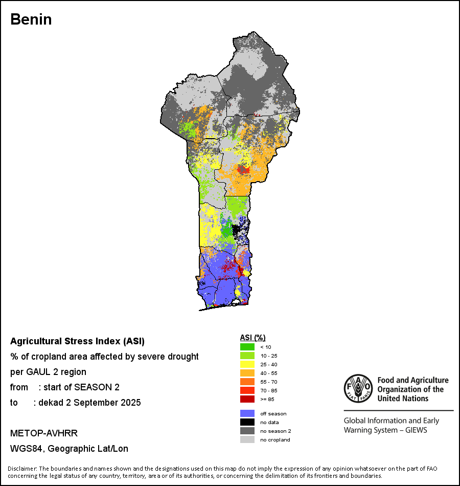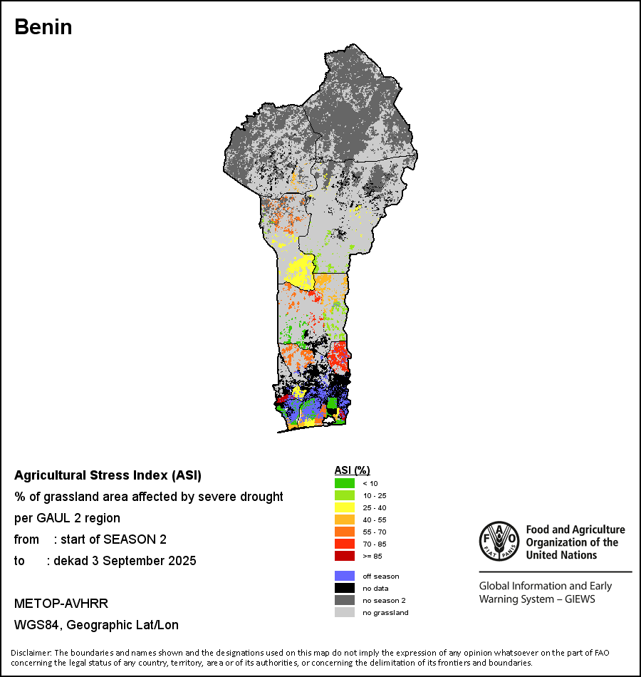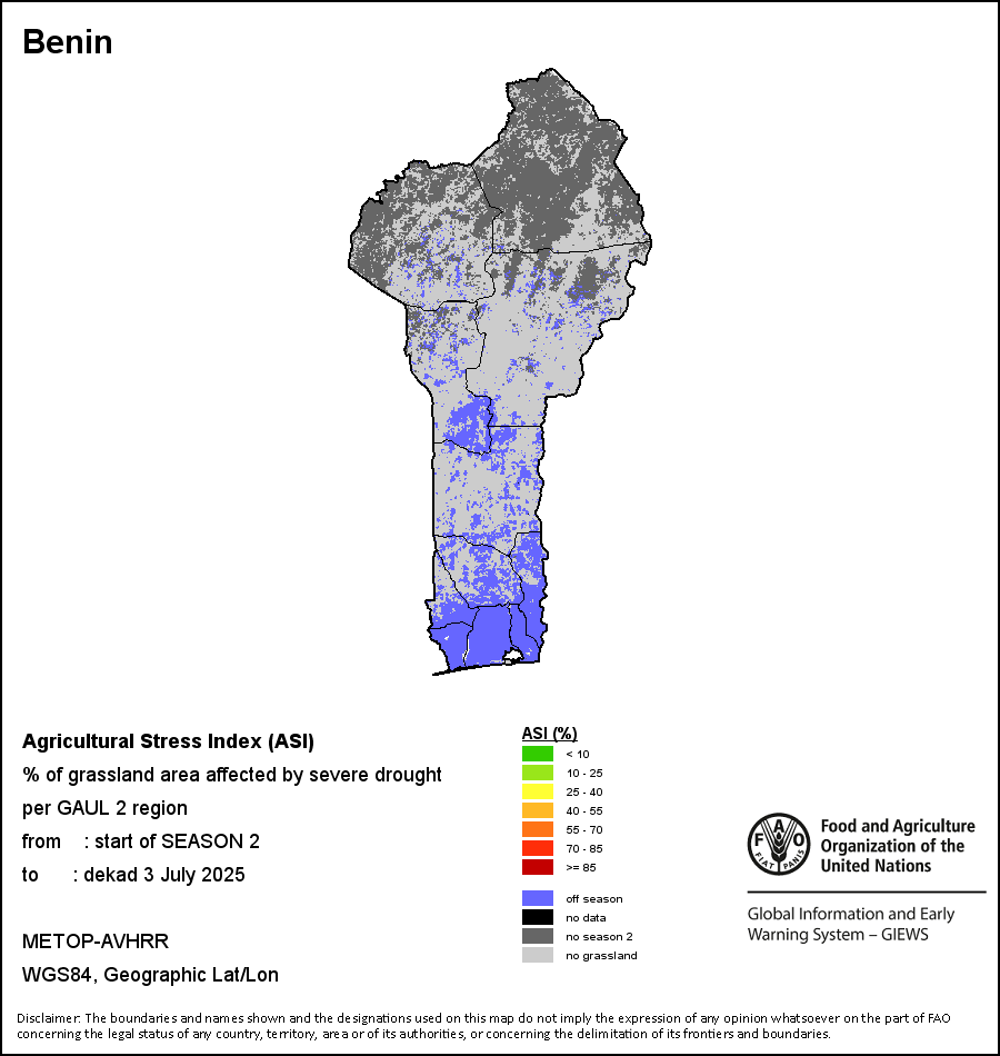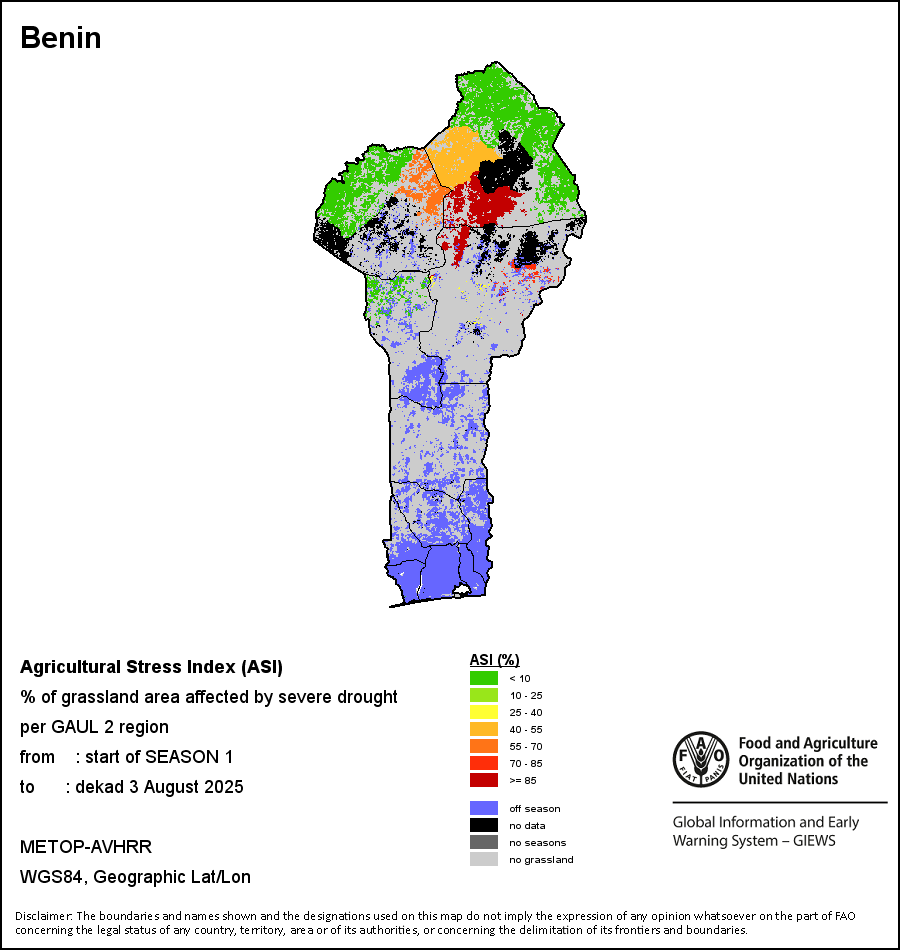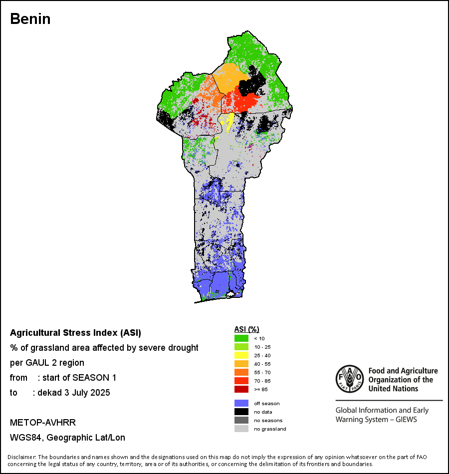 The Agricultural Stress Index (ASI) is a quick-look indicator that facilitates the early identification of cropped land with a high likelihood of water stress (drought). The Index is based on the integration of the Vegetation Health Index (VHI) in two dimensions that are critical in the assessment of a drought event in agriculture: temporal and spatial. The first step of the ASI calculation is a temporal averaging of the VHI, assessing the intensity and duration of dry periods occurring during the crop cycle at the pixel level; this calculation includes the use of crop coefficients, which introduces sensitivity of a crop to water stress during each phenological phase. The second step determines the spatial extent of drought events by calculating the percentage of pixels in arable areas with a VHI value below 35 percent (this value was identified as a critical threshold in assessing the extent of drought in previous research by Kogan, 1995). Each administrative area is classified according to the percentage of the affected area to facilitate the quick interpretation of results.