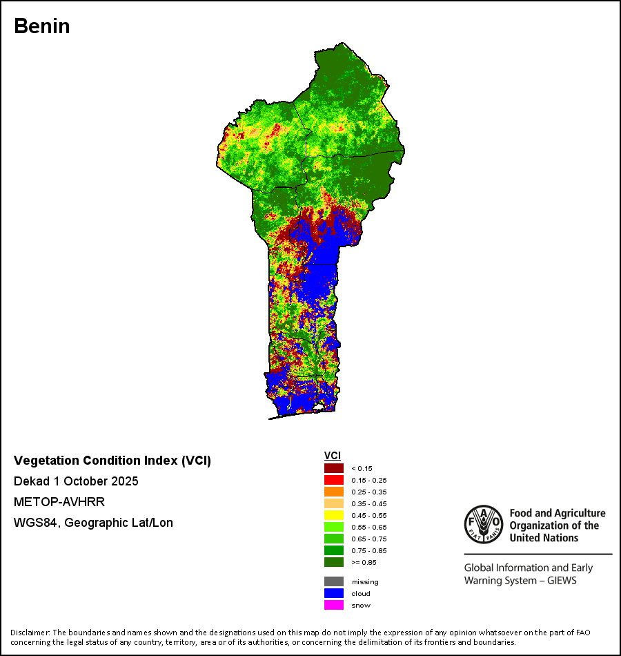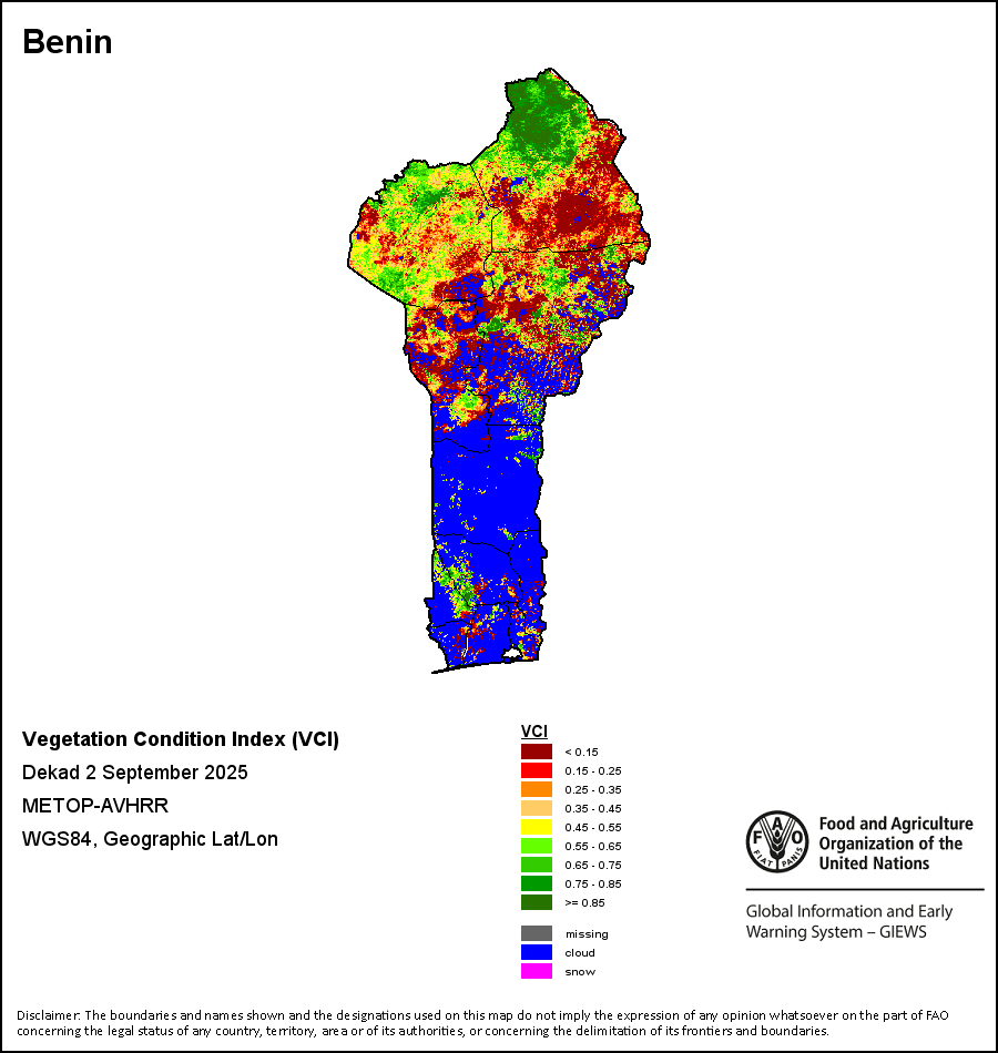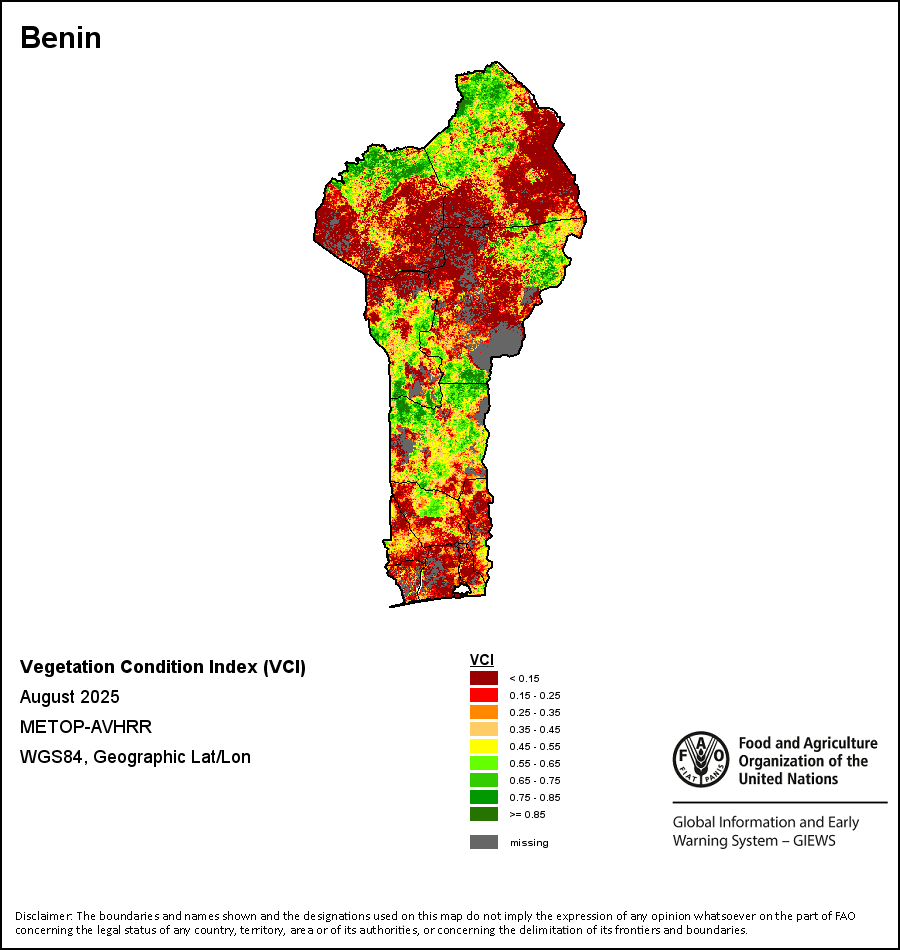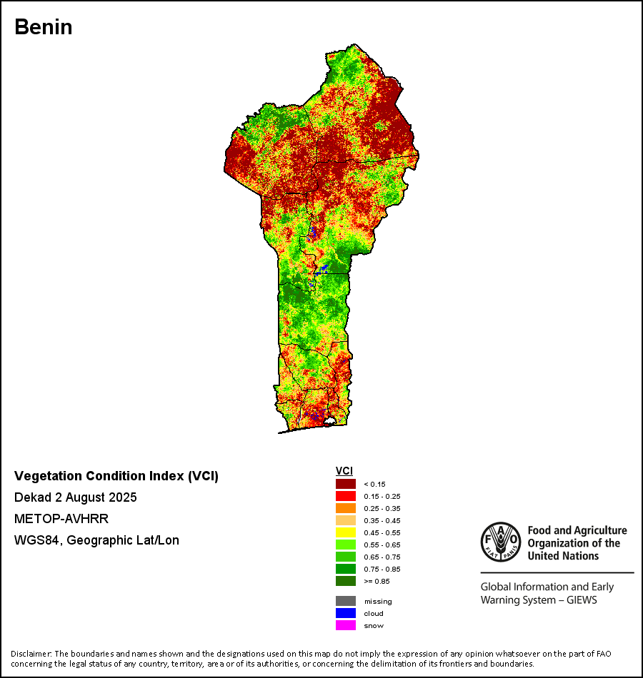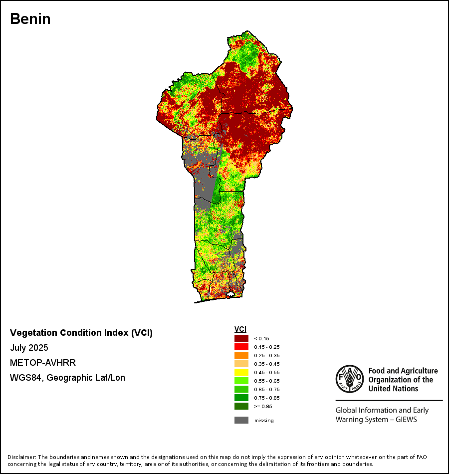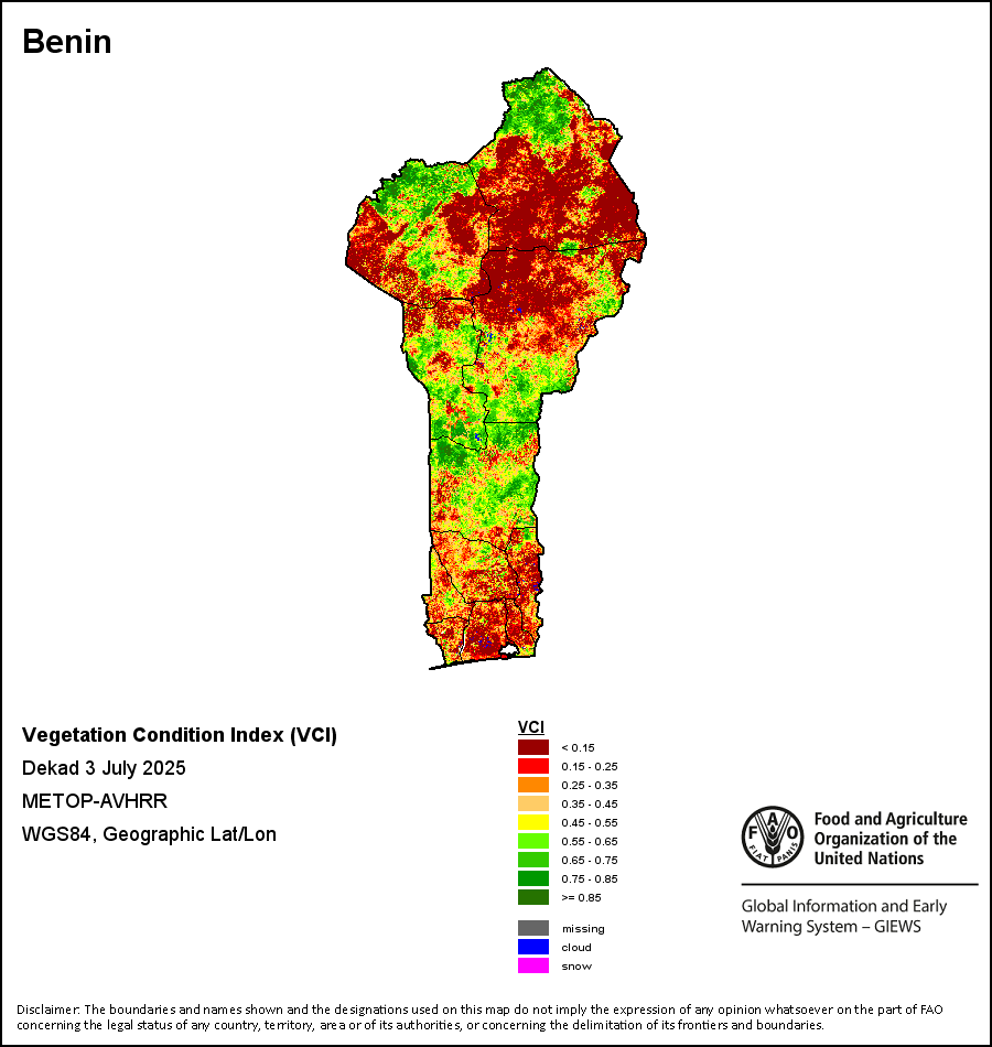 The Vegetation Condition Index (VCI) evaluates the current vegetation health in comparison to the historical trends. The VCI relates current dekadal Normalized Difference Vegetation Index (NDVI) to its long-term minimum and maximum, normalized by the historical range of NDVI values for the same dekad. The VCI was designed to separate the weather-related component of the NDVI from the ecological element.
