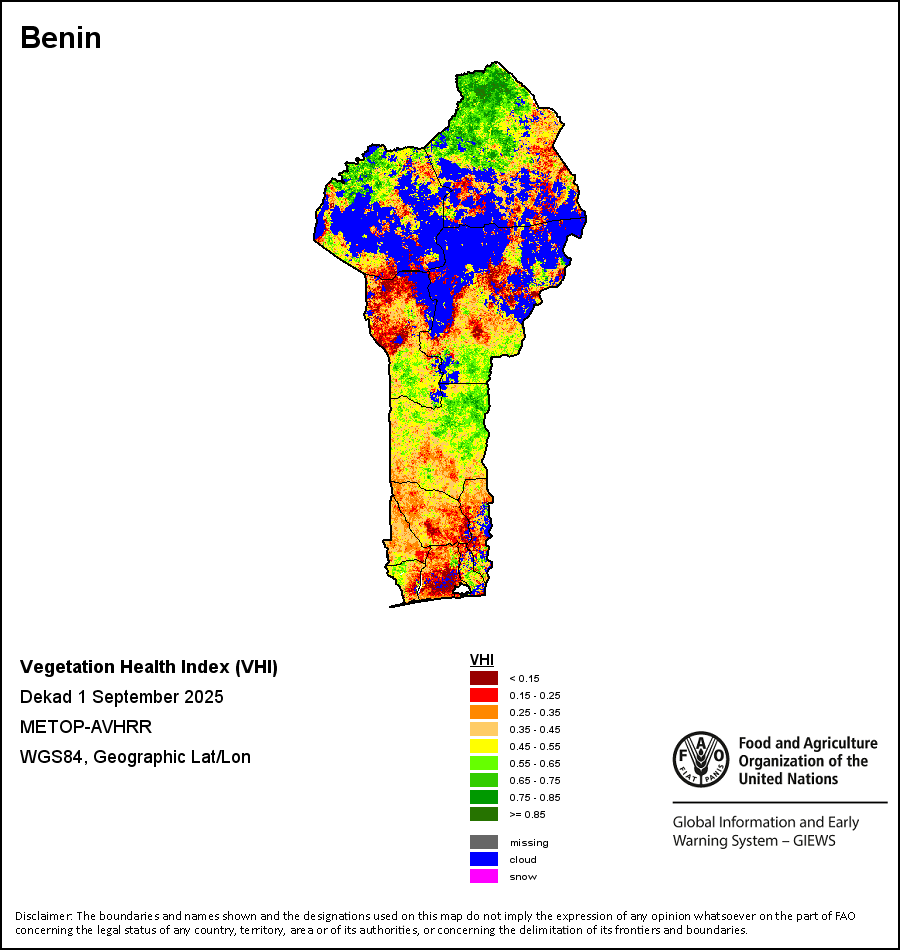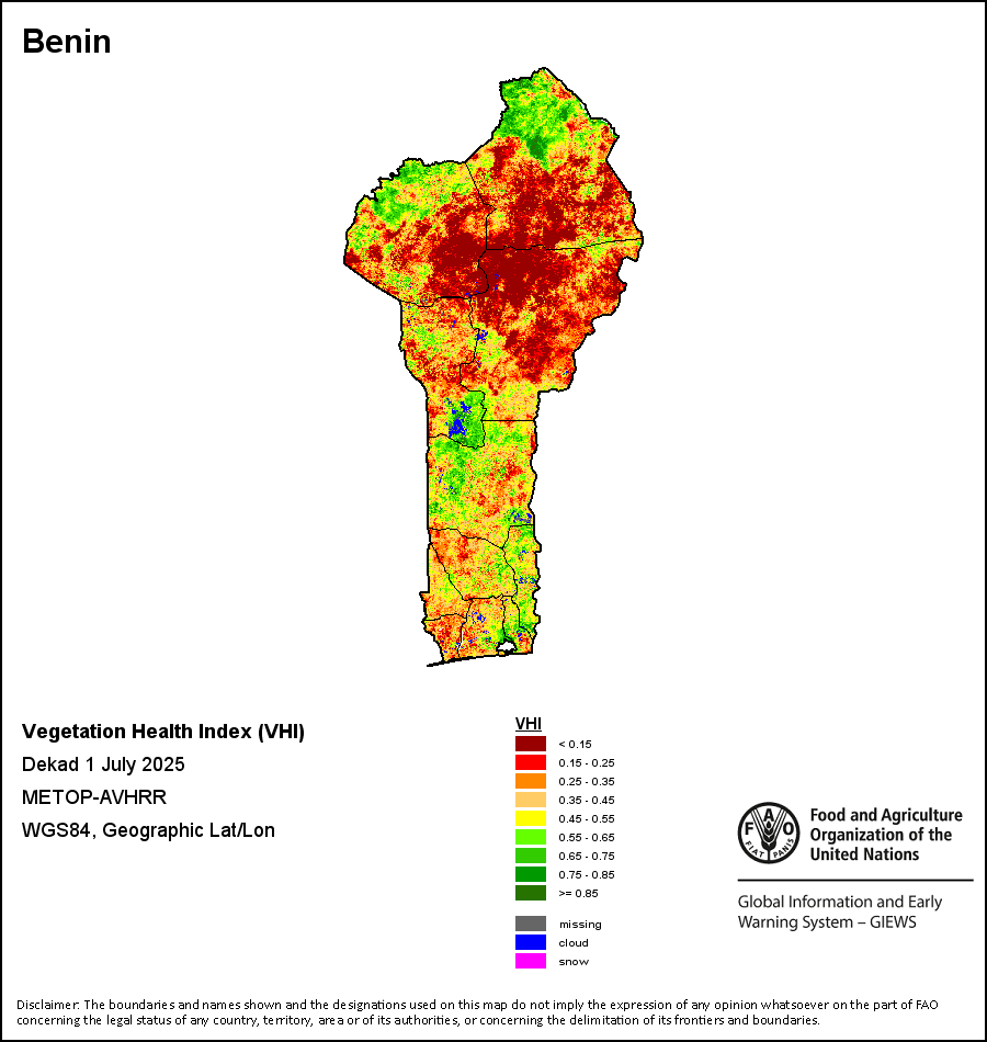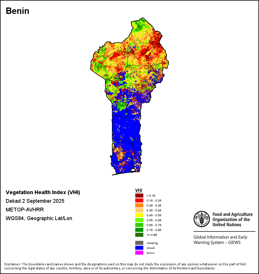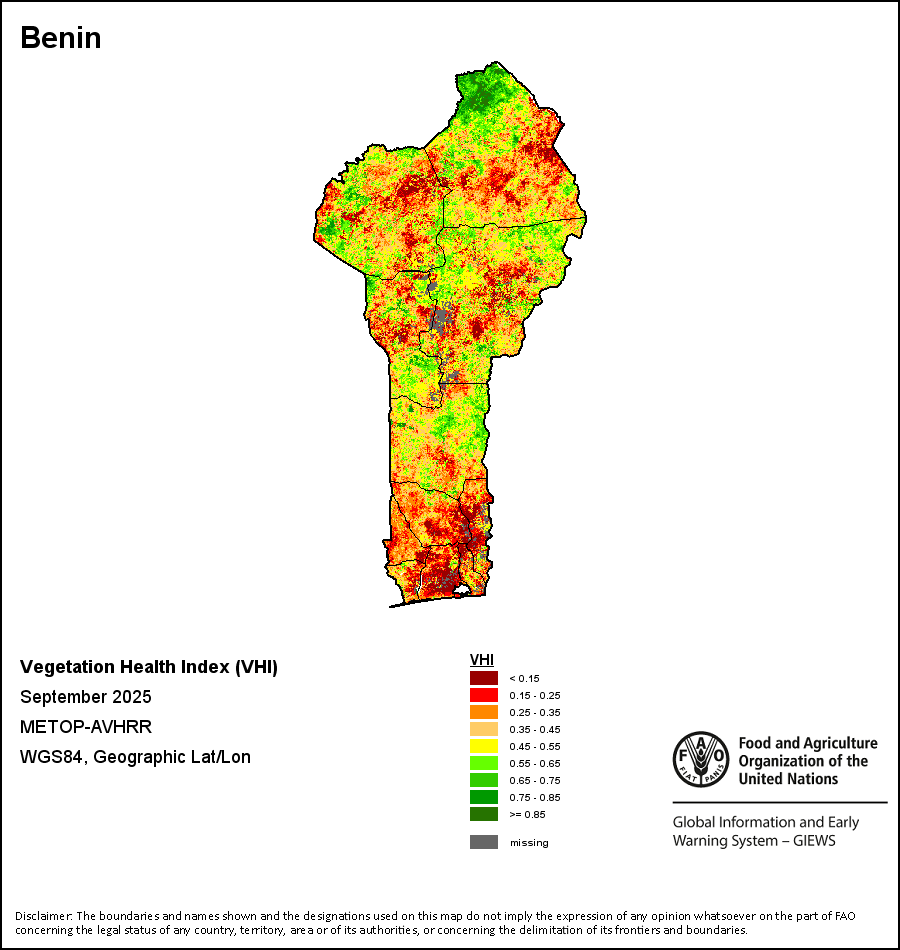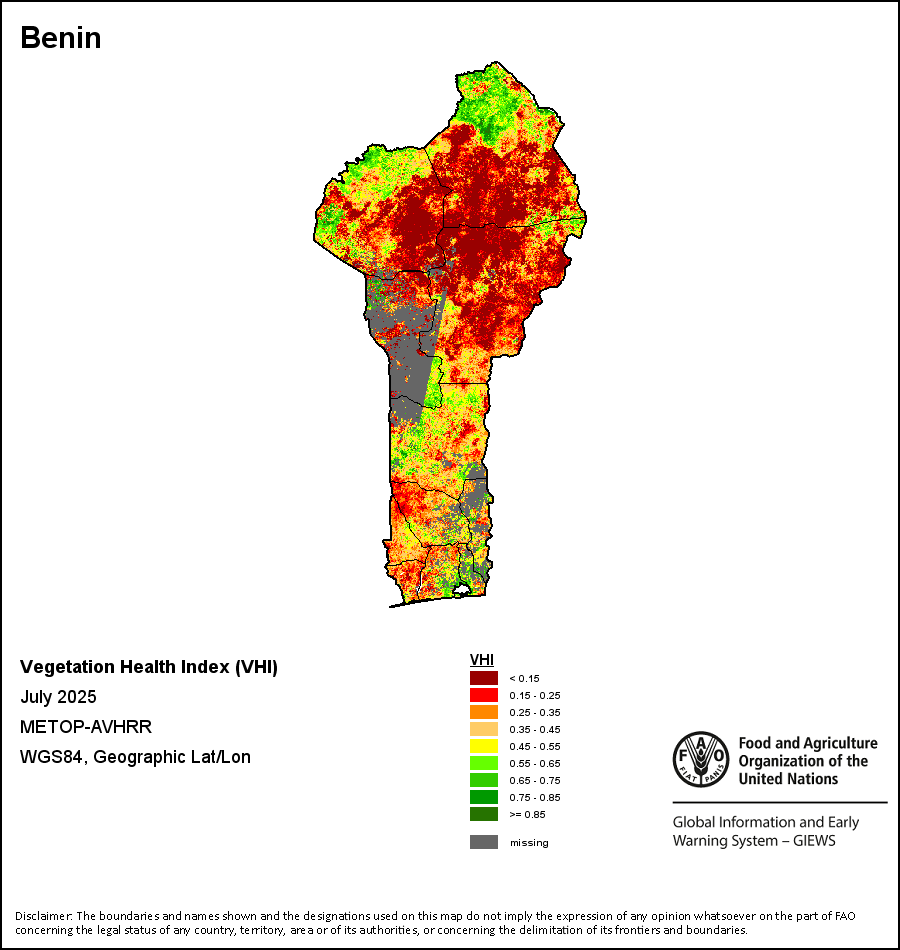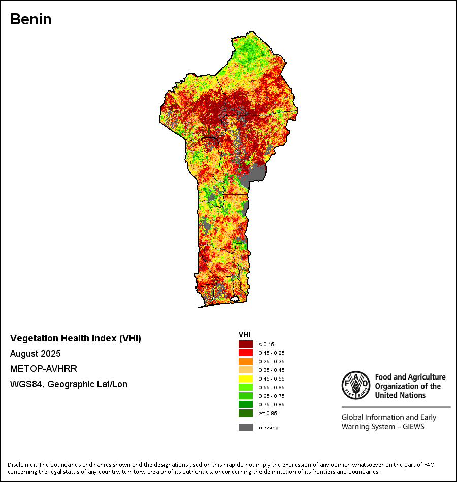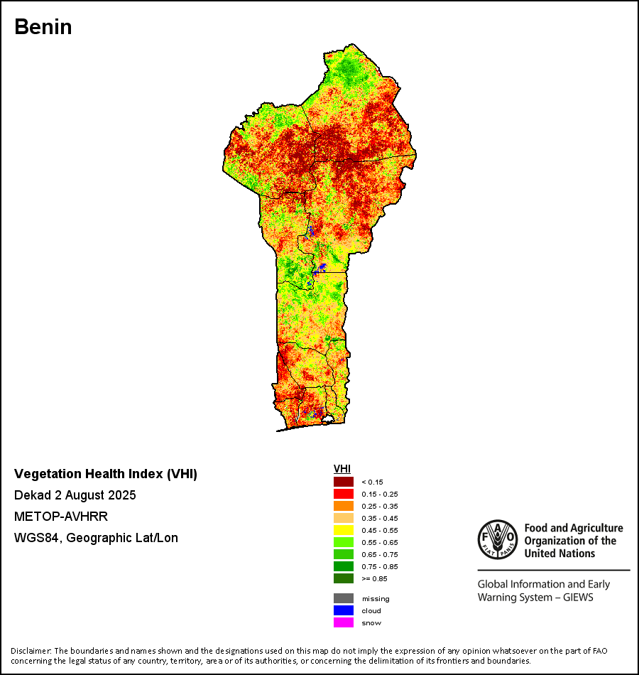 The Vegetation Health Index (VHI) illustrates the severity of drought based on the vegetation health and the influence of temperature on plant conditions. The VHI is a composite index and the elementary indicator used to compute the ASI. It combines both the Vegetation Condition Index (VCI) and the Temperature Condition Index (TCI). The TCI is calculated using a similar equation to the VCI, but relates the current temperature to the long-term maximum and minimum , as it is assumed that higher temperatures tend to cause a deterioration in vegetation conditions. A decrease in the VHI would, for example, indicate relatively poor vegetation conditions and warmer temperatures, signifying stressed vegetation conditions, and over a longer period would be indicative of drought. The VHI images are computed for the two main seasons and in three modalities: dekadal, monthly and annual.