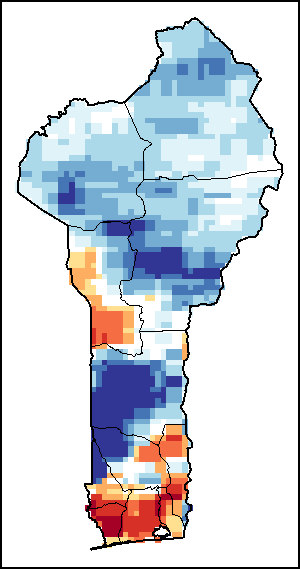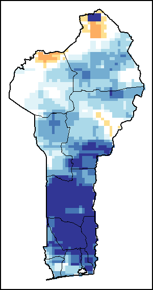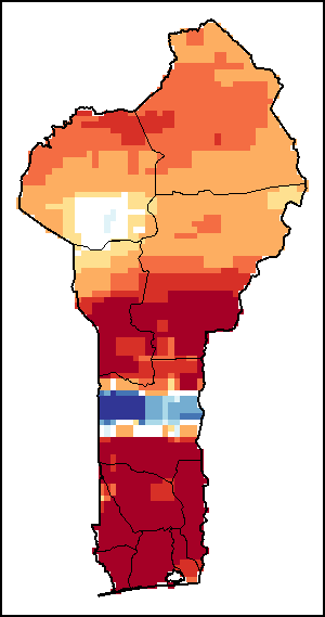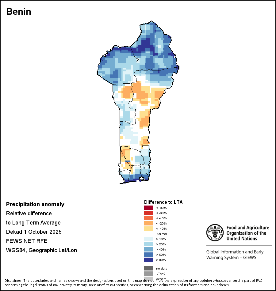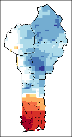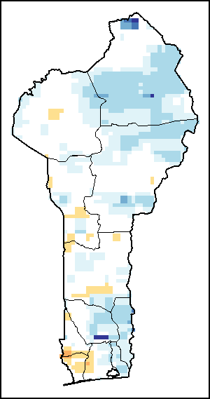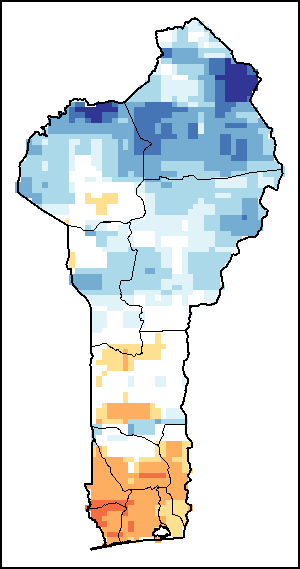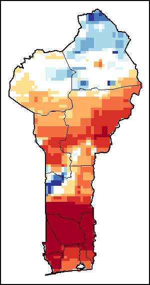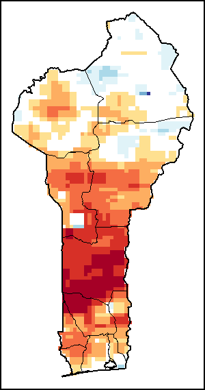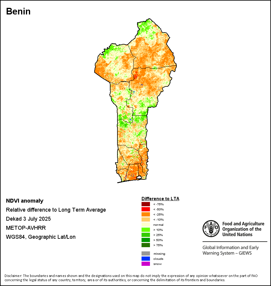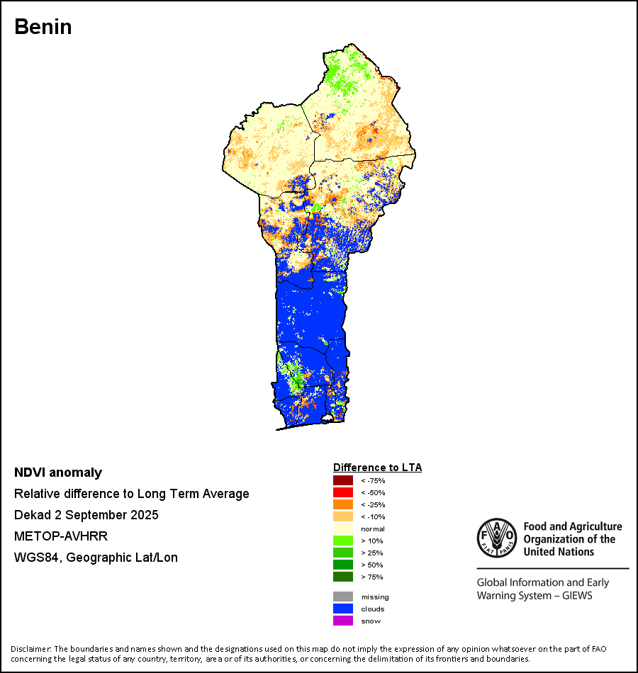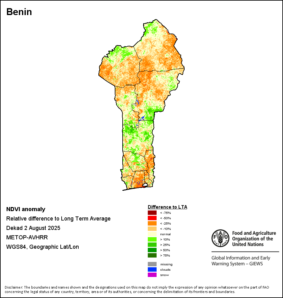 The Normalized Difference Vegetation Index (NDVI) measures the “greenness” of ground cover and is used as a proxy to indicate the density and health of vegetation. NDVI values range from +1 to -1, with high positive values corresponding to dense and healthy vegetation, and low and/or negative NDVI values indicating poor vegetation conditions or sparse vegetative cover. The NDVI anomaly indicates the variation of the current dekad to the long-term average, where a positive value (for example 20 percent) would signify enhanced vegetation conditions compared to the average, while a negative value (for instance -40 percent) would indicate comparatively poor vegetation conditions.
