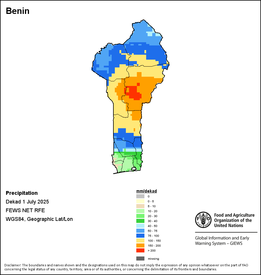 The map depicts cumulative rainfall volumes over a dekad (a 10-day period). Precipitation estimates for all African countries (except Cabo Verde and Mauritius) are taken from NOAA/FEWSNet, while for the remaining countries data is obtained from ECMWF.