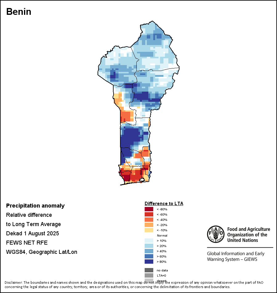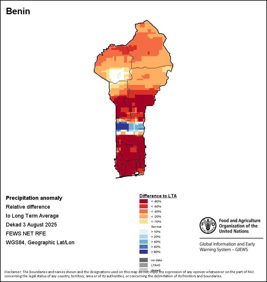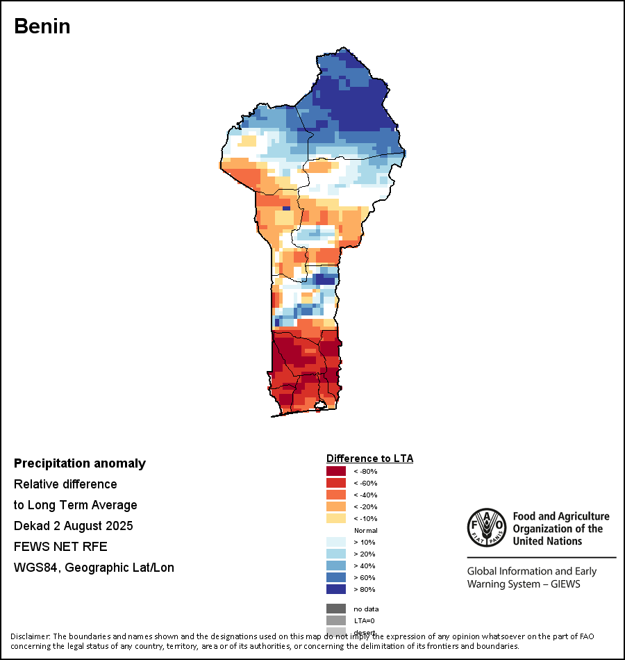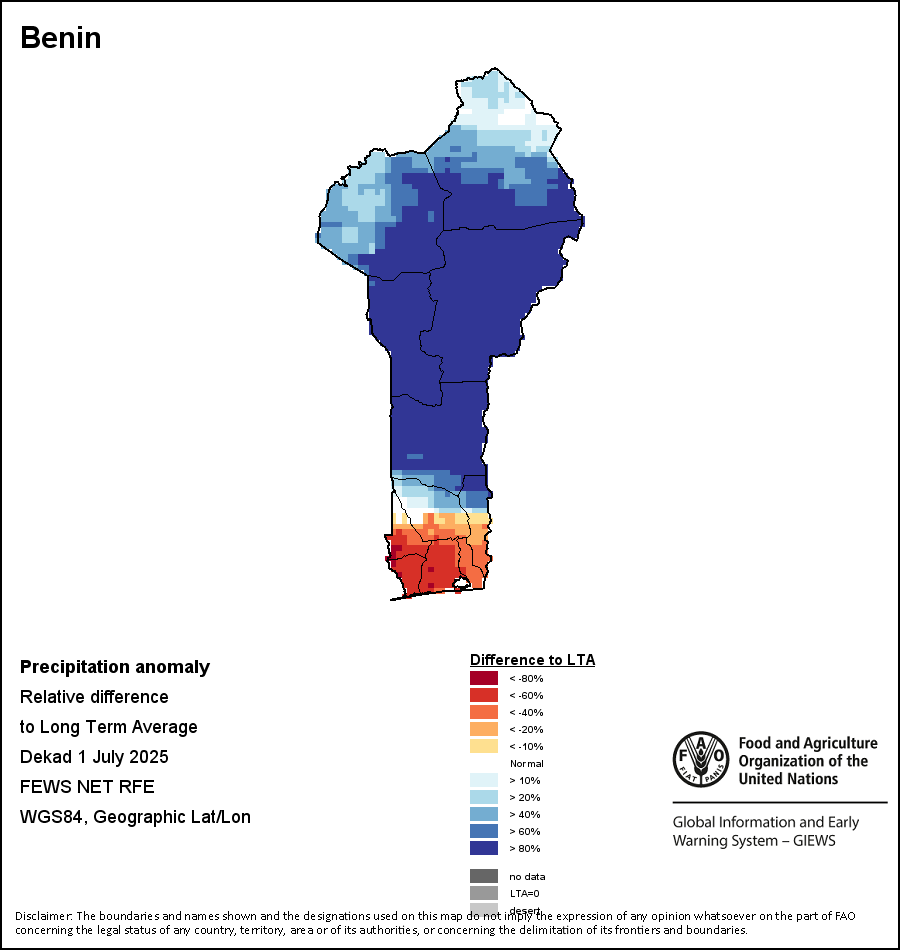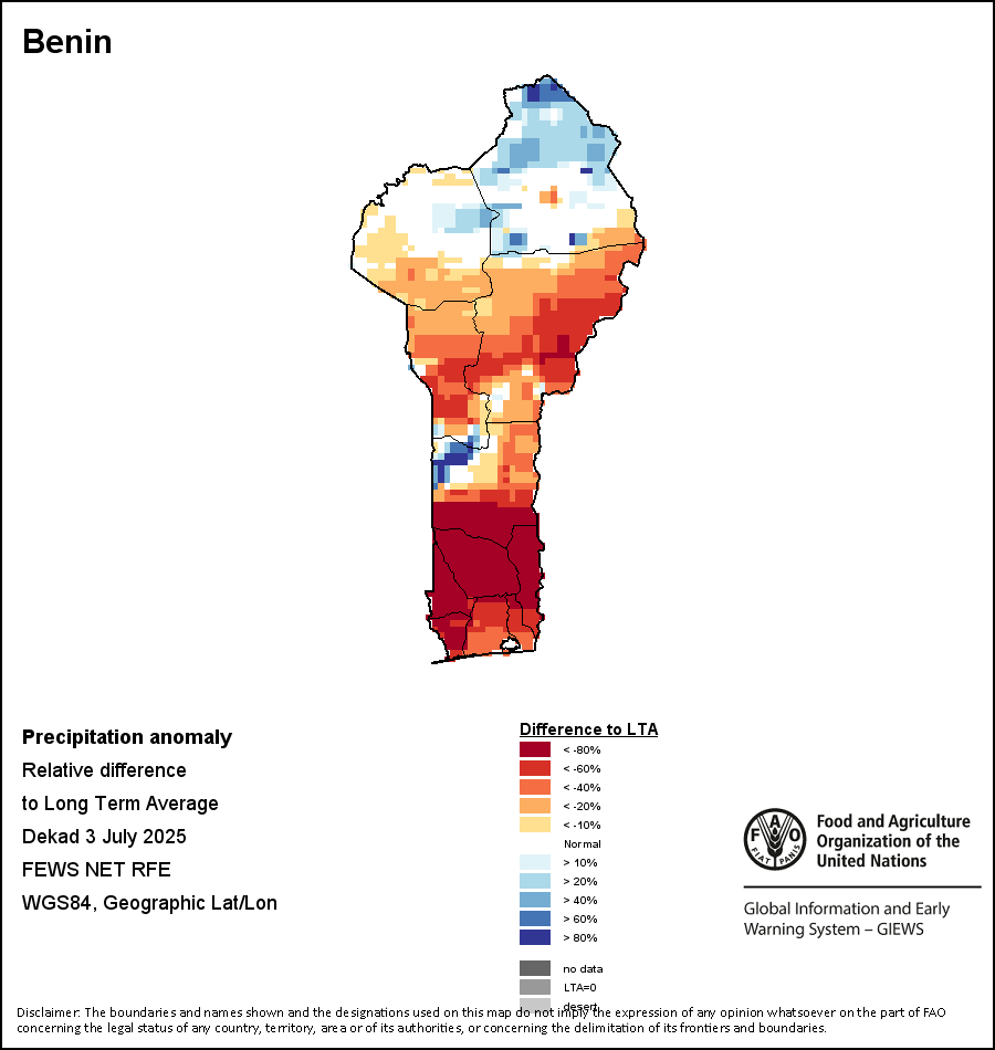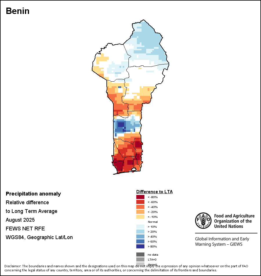 The map illustrates the difference between the current rainfall volume and the average level. Rainfall levels are compared with the Long-Term Average (LTA), which refers to the period 1989-2015. Warmer colours identify areas which have received lower-than-average rainfall, while colder colours are given to areas where precipitation has been above average.