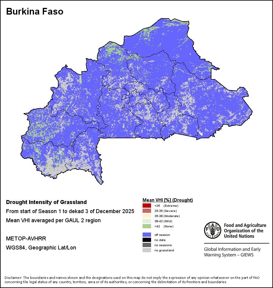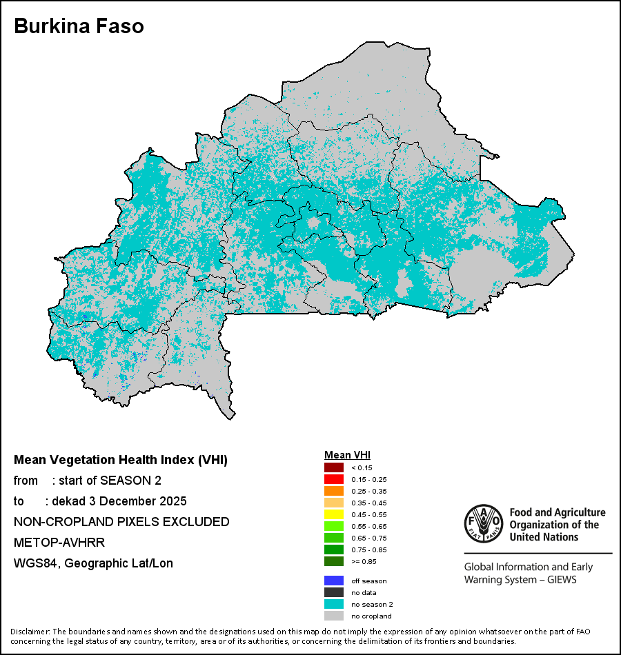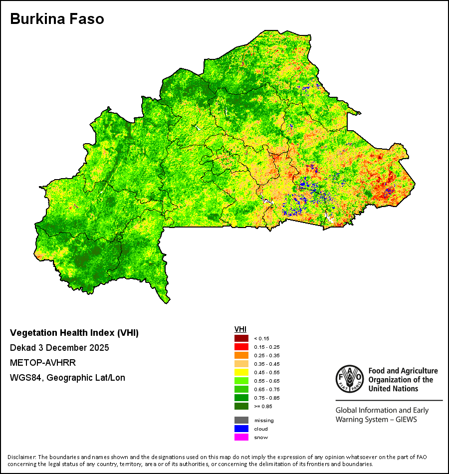Los mapas y gráficos nacionales representan el último periodo de 36 meses de los indicadores estacionales, de vegetación y de precipitación. Los datos se presentan por periodos de 10 días y por meses. Los tres indicadores de vegetación se basan en datos de vegetación registrados cada diez días por el sensor METOP-AVHRR con una resolución de 1km (2007 y posterior). Los datos con una resolución de 1km del período 1984-2006 se extrapolaron a partir del conjunto de datos NOAA-AVHRR con 16km de resolución. Las estimaciones de precipitación de todos los países africanos (excepto Cabo Verde y Mauricio) se obtienen de NOAA/FEWSNet (16km de resolución), mientras que para los restantes países los datos se obtienen Centro Europeo de Predicción Meteorológica a Plazo Medio (ECMWF siglas en Inglés, 25km de resolución). Debido a la mayor resolución de los indicadores de vegetación (p.ej., NDVI, VHI) en comparación con los indicadores de precipitación de resolución más gruesa, el número de unidades subnacionales para las que se pueden generar estadísticas zonales válidas para los índices de vegetación es mayor que el número de unidades para los indicadores de precipitación en algunos países.