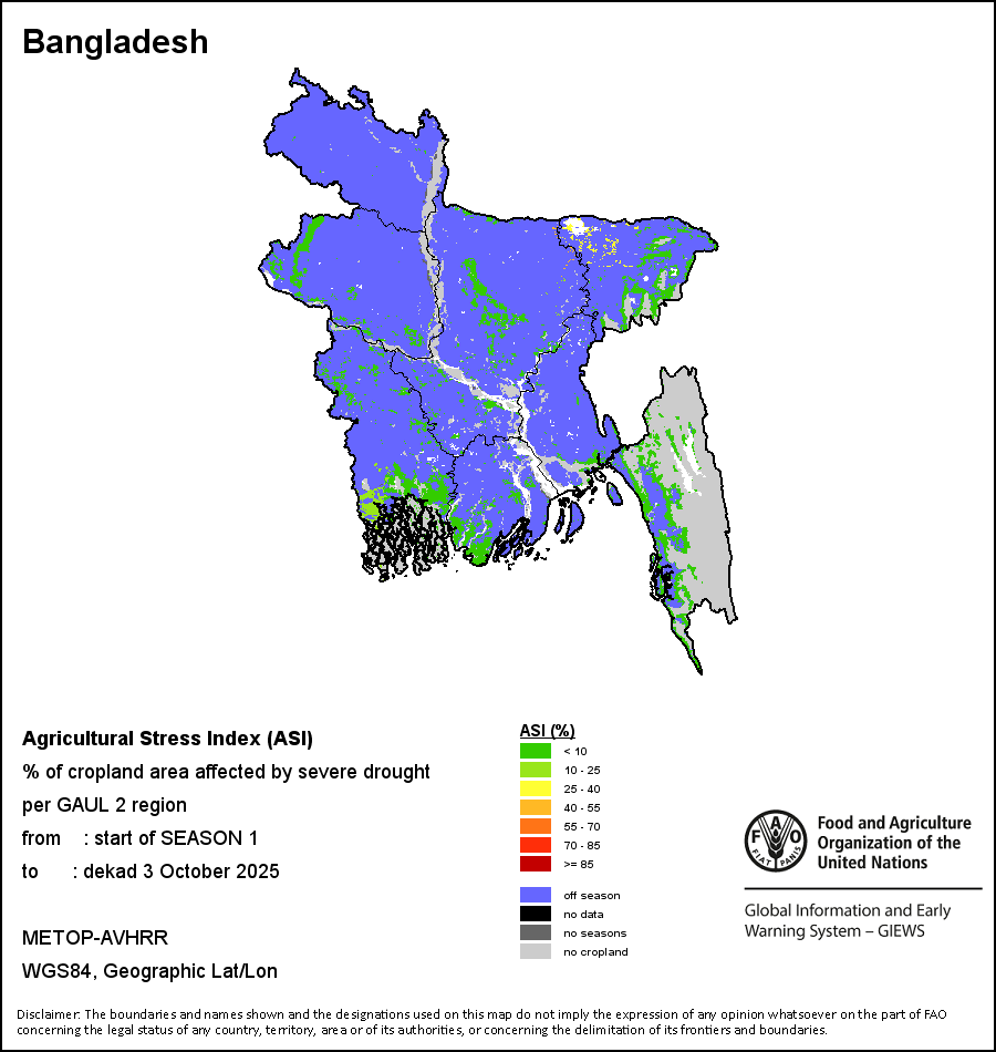 The Agricultural Stress Index (ASI) is a quick-look indicator that facilitates the early identification of cropped land with a high likelihood of water stress (drought). The Index is based on the integration of the Vegetation Health Index (VHI) in two dimensions that are critical in the assessment of a drought event in agriculture: temporal and spatial. The first step of the ASI calculation is a temporal averaging of the VHI, assessing the intensity and duration of dry periods occurring during the crop cycle at the pixel level; this calculation includes the use of crop coefficients, which introduces sensitivity of a crop to water stress during each phenological phase. The second step determines the spatial extent of drought events by calculating the percentage of pixels in arable areas with a VHI value below 35 percent (this value was identified as a critical threshold in assessing the extent of drought in previous research by Kogan, 1995). Each administrative area is classified according to the percentage of the affected area to facilitate the quick interpretation of results.