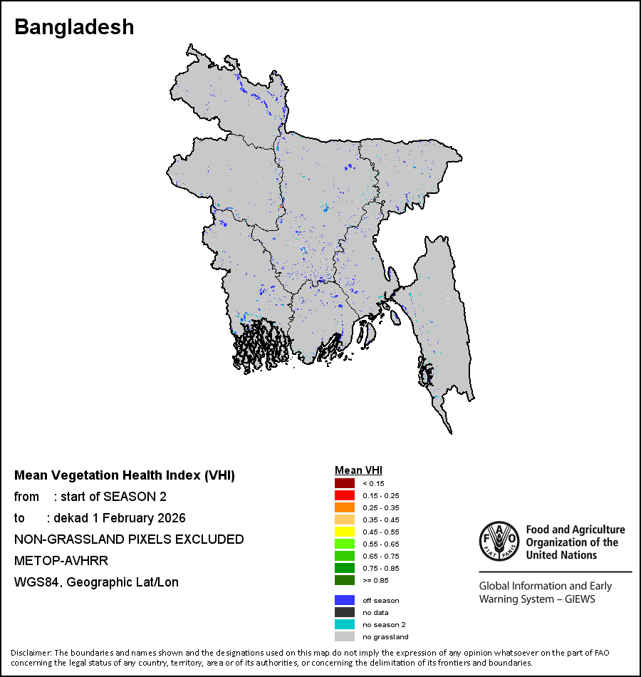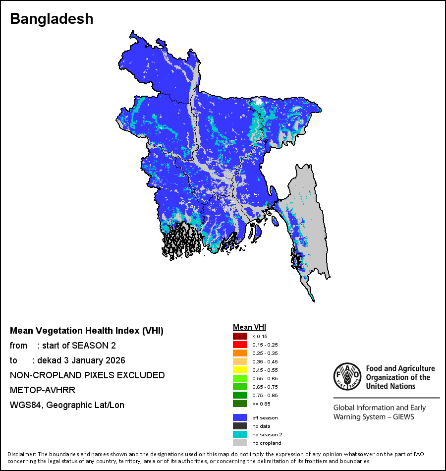 L'indice de santé de la végétation moyen pondérée (VHI moyen pondérée) permet à l'utilisateur d'évaluer la gravité de la sécheresse depuis le début de la saison de croissance et d'examiner l'état de santé de la végétation et l'influence de la température sur les conditions des plantes. Le VHI moyen pondérée est une moyenne des valeurs décadaires du VHI au cours de la saison de croissance des cultures (du début jusqu’à la dernière décade d’analyse), pondérée par les coefficients culturaux (Kc), attribués aux valeurs du VHI aux décades correspondant au début de la saison (SOS), maximum de la saison (MOS) et fin de la saison (EOS). L’application des coefficients culturaux vise à refléter la sensibilité des cultures face à un stress hydrique à différents stades phénologiques.