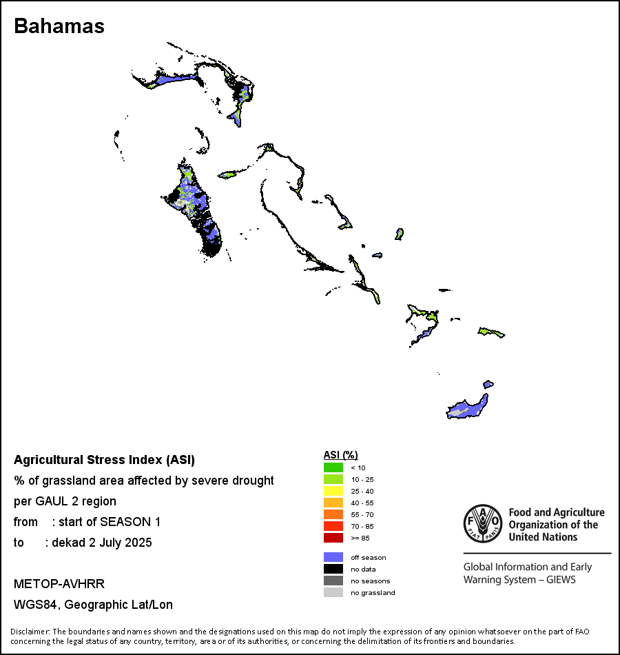 该地图显示的是两类地区的干旱发生频率:i)耕地面积的30%发生旱情;或ii)耕地面积的50%发生旱情。 严重旱情的历史频率(根据ASI的定义)是根据全部时间序列(1984-2024年)计算得出的。