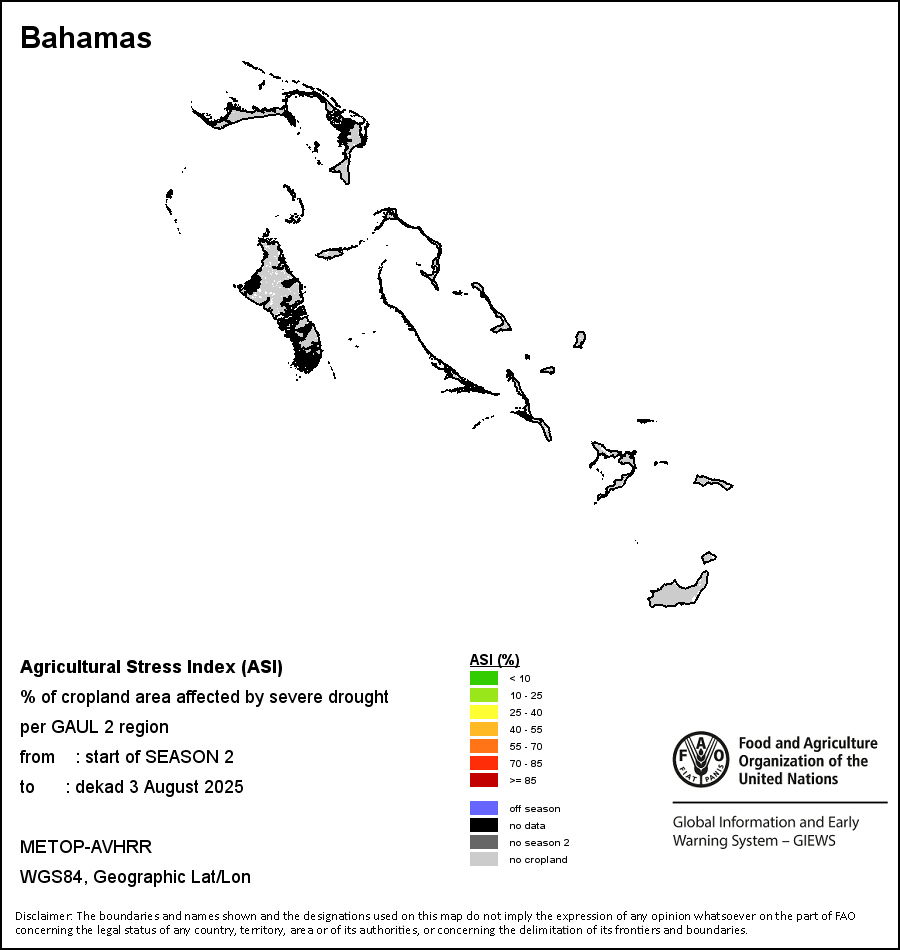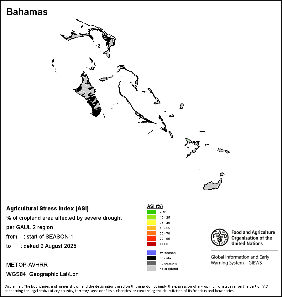 农业干旱胁迫指数(ASI)是一项速览指数,有助于在早期甄别较大可能发生水胁迫(干旱)的耕地。 该指数通过整合植被健康指数(VHI)在评估农业旱情方面具有关键意义的两个维度,即时间和空间维度,而得出。计算农业干旱胁迫指数的第一步是求植被健康指数的时间平均值,对作物周期内旱情的强度和时长进行像素级评估;这项计算包括采用作物系数衡量某种作物在各物候阶段对干旱胁迫的敏感度。第二步是确定旱情的空间广度,方法是计算植被健康指数值低于35%(Kogan前期研究将这一数值确定为评估干旱程度的临界值,1995年)的耕地的像素百分比。然后把各个行政区域根据受影响面积的百分比进行划分,便于对结果进行快速解读。