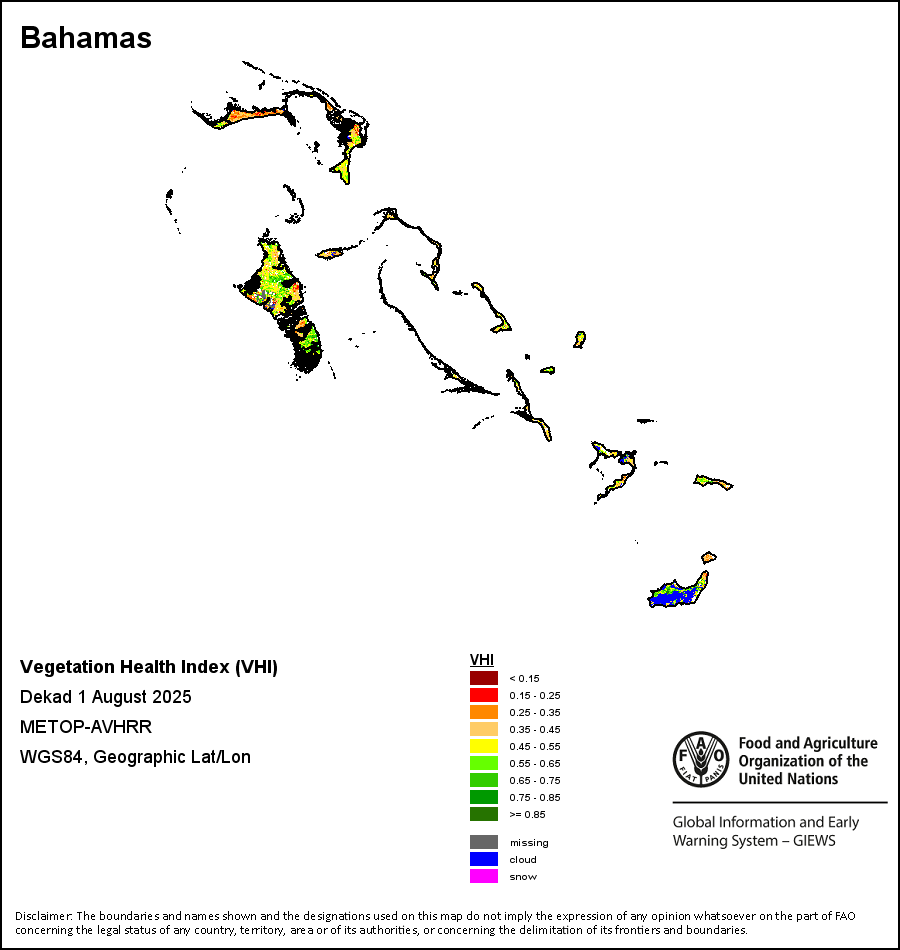 植被健康指数(VHI)根据植被健康状况以及气温对作物状况的影响情况显示干旱的严重程度。 VHI是一项综合指数,是用于计算ASI的基础性指标。它结合了植被状况指数(VCI)和气温状况指数(TCI)。TCI的计算采用了与VCI类似的方程,但它把当前气温与长期最高和最低值联系起来,因为一个假定前提是气温越高就倾向于造成植被状况恶化。比方说,VHI指数下降就意味着植被状况相对较差,而气温越高则意味着植被状况受到胁迫,较长时间延续则成为干旱的指征。VHI映像针对两个主要季节进行计算并分为三种时间模式:旬度、月度和年度。